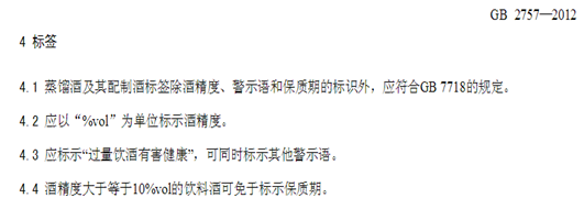 GB 2757-2012 《食品安全国家标准 蒸馏酒及其配制酒》对酒的标签规定如下: