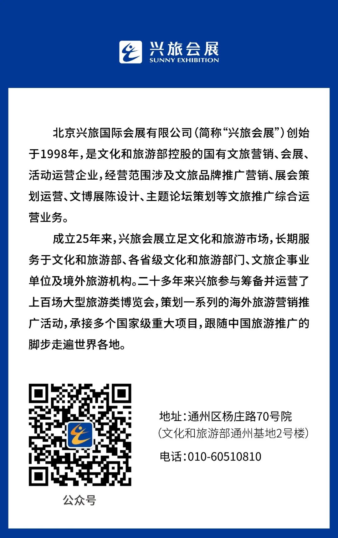 北京兴旅国际会展有限公司(简称“兴旅会展”)创始于1998年,是文化和旅游部控股的国有文旅营销、会展、活动运营企业,经营范围涉及文旅品牌推广营销、展会策划运营、文博展陈设计、主题论坛策划等文旅推广综合运营业务。