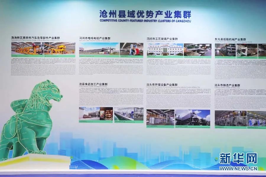 沧州市共有河北省认定重点县域特色产业集群24个,占全省总量的22.4%。图为聚势谋远展区沧州县域优势产业集群板块。新华网 王立鹏摄