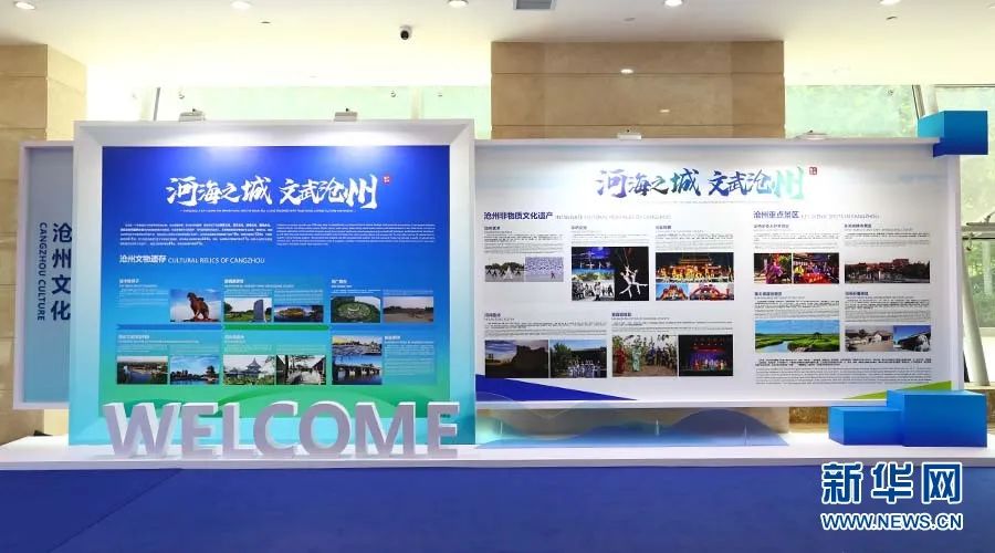 沧州文化底蕴深厚,是杂技之乡、武术之乡,“河海狮城、文武沧州”已经成为当地的文化标识。图为聚势谋远展区沧州文化板块。新华网 王立鹏摄