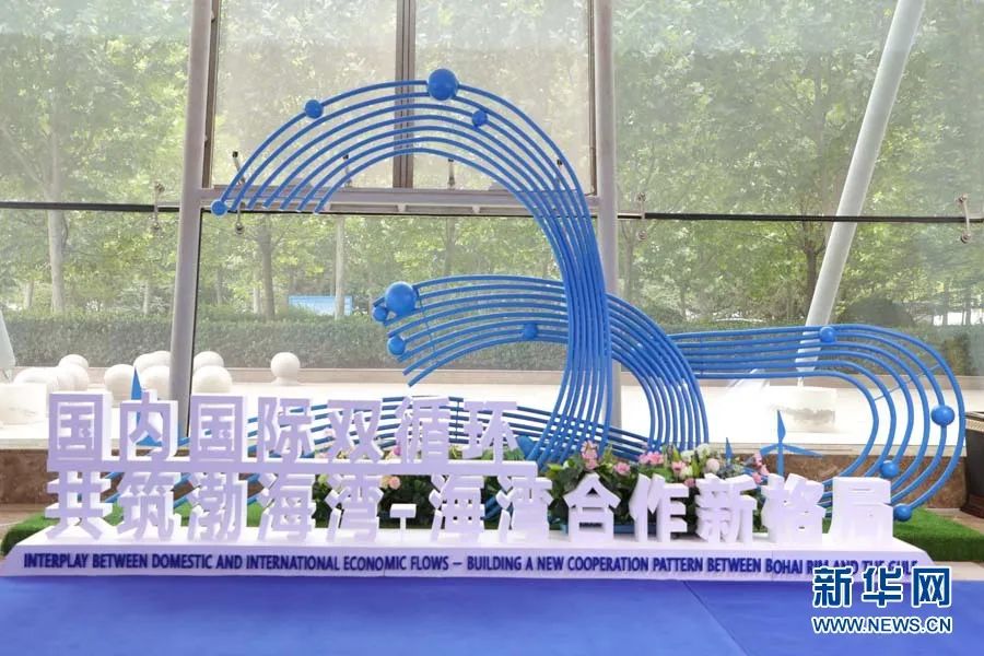 聚势谋远展区主题标志采用循环造型好似将两湾连接,象征合作生生不息,配以蓝绿两色,寓意辽阔海洋、绿色发展。新华网 王立鹏摄