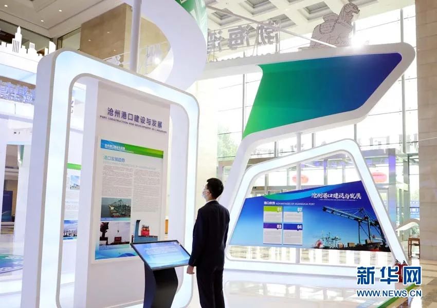黄骅港地处沧州渤海新区,是我国主要能源输出港之一、津冀沿海港口群的重要组成部分。图为海纳百川展区沧州港口建设与发展板块,参观者通过展板前的多媒体设备可以了解更多板块信息。新华网 王立鹏摄