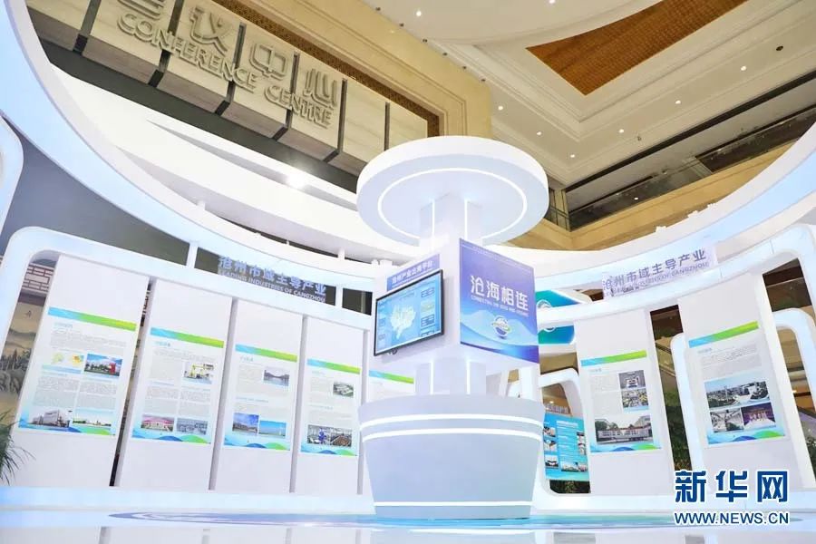 海纳百川展区蓝白相间,整个展区为中心扩散结构,好似海浪向外翻腾,象征沧州敞开大门谋发展、张开怀抱促合作的决心。新华网 王立鹏摄