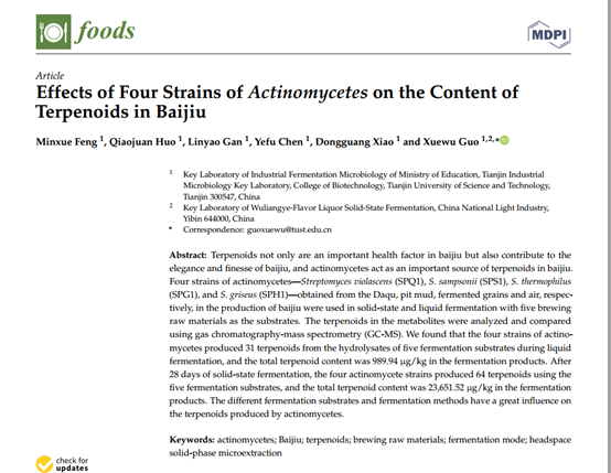 2023年4月1日,天津科技大学郭学武教授在国际食品期刊《Foods》发表了题为“四株放线菌对白酒中萜烯类物质的影响”(Effects of Four Strains of Actinomycetes on the Content of Terpenoids in Baijiu)的研究性文章,论述了分离自传统白酒发酵中的放线菌对白酒健康因子萜烯类物质的影响。