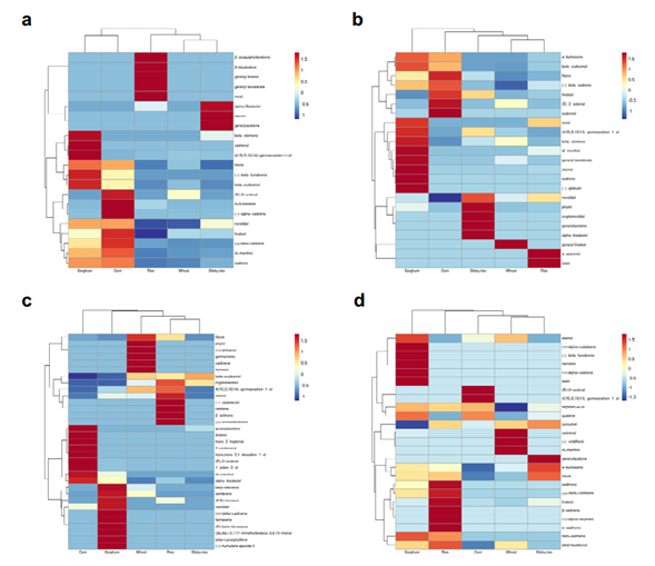 对SPS1、SPQ1、SPG1、SPH1进行以高粱、小麦、玉米、大米、糯米为底物的固态发酵,28 d时四株菌产生萜类化合物的总浓度大小分别为SPS1(15605.74 mg/kg) > SPQ1(4337.66 mg/kg) > SPH1(1935.94 mg/kg) > SPG1(1782.25 mg/kg),产生萜类化合物的数量分别为SPG1 (33种) > SPH1(25种)> SPQ1(23种)> SPS1(22种)。SPS1和SPQ1利用高粱固态发酵培养基时,产生的总萜浓度最高,而SPG1利用大米固态发酵培养基时,产生的总萜浓度最高,SPH1利用小麦液态发酵培养基时,产生的总萜浓度最高。不同粮食产生的萜类化合物浓度分别为(9815.65 mg/kg)>玉米(8022.28mg/kg)>小麦(2173.58 mg/kg)>大米(2008.42mg/kg)>糯米(1641.66 mg/kg), 产生萜类化合物的数量分别为高粱(35种)>大米(31种)>小麦(25种)>玉米(23种)>糯米(19种)。在利用高粱、小麦、玉米、糯米时SPS1产生萜类化合物的能力均最高,利用大米时SPH1产生萜类化合物的能力最高。四株链霉菌进行固态发酵的产物中,b-桉叶醇的提高最为突出,SPS1和SPQ1的产物中,B-柏木烯的含量也有大幅提升,也表现出较好的产B-柏木烯的能力。