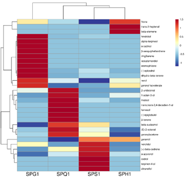图2. SPS1、SPQ1、SPH1和SPG1固态发酵萜类产物含量热图