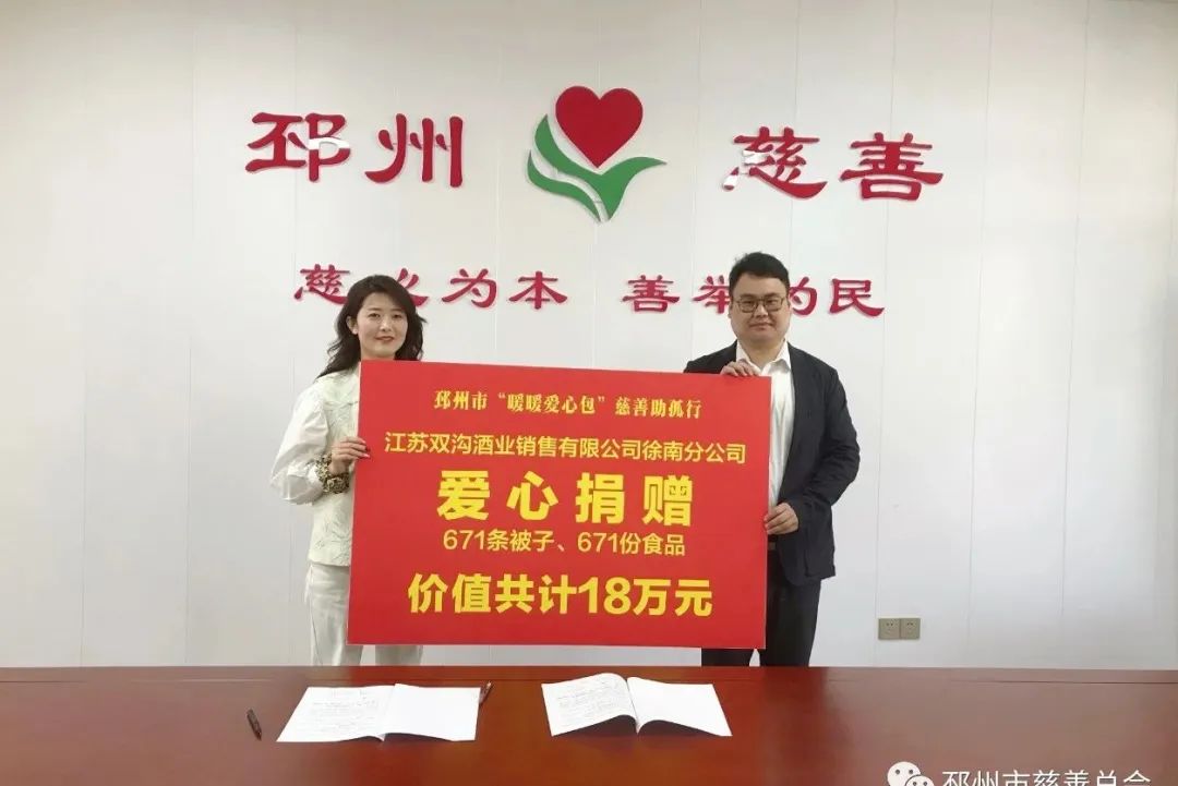 5月23日,江苏双沟酒业销售有限公司徐南分公司向邳州市慈善总会捐赠671条被子、671箱牛奶和671份饼干大礼包,总价值18万元。用于慰问全市671名事实无人抚养儿童、孤儿,为这群孩子送去“六一”儿童节的祝福和问候,让他们感受到党和政府的关爱、社会大家庭的温暖。市慈善总会副会长王志刚、副秘书长王凤奎,江苏双沟酒业销售有限公司徐南分公司总经理叶智,爱心人士刘洁女士参加捐赠仪式。