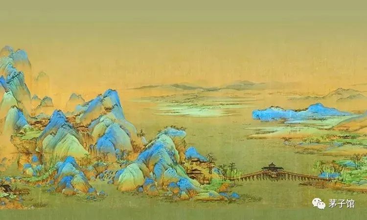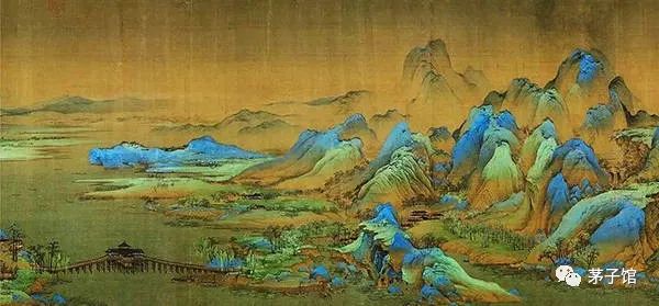 《千里江山图》纵51.5厘米,横1191.5厘米,绢本,青绿设色,无款,据卷后蔡京题跋知系王希孟所作,现藏故宫博物院。作品以长卷形式,描绘了连绵的群山冈峦和浩淼的江河湖水,于山岭、坡岸、水际中布置、点缀亭台楼阁、茅居村舍,水磨长桥及捕鱼、驶船、行旅、飞鸟等,描绘精细,意态生动。景物繁多,气象万千,构图于疏密之中讲求变化,气势连贯,以披麻与斧劈皴相合,表现山石的肌理脉络和明暗变化;设色匀净清丽,于青绿中间以赭色,富有变化和装饰性。作品意境雄浑壮阔,气势恢宏,充分表现了自然山水的秀丽壮美。被称为"中国十大传世名画"之一。