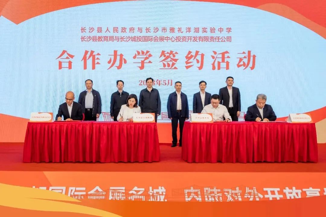 5月23日,长沙市雅礼洋湖会展中学合作办学签约活动举行,长沙县县委副书记、县长陈永高,长沙城发集团党委书记、董事长邹春林,长沙市教育局党委委员、副局长聂庭芳,长沙市雅礼中学校长王旭等领导出席签约活动,自贸会展区管委会、长沙县有关部门、雅礼中学及雅礼洋湖中学、省市主流媒体共同见证长沙会展新城再添优质教育资源。