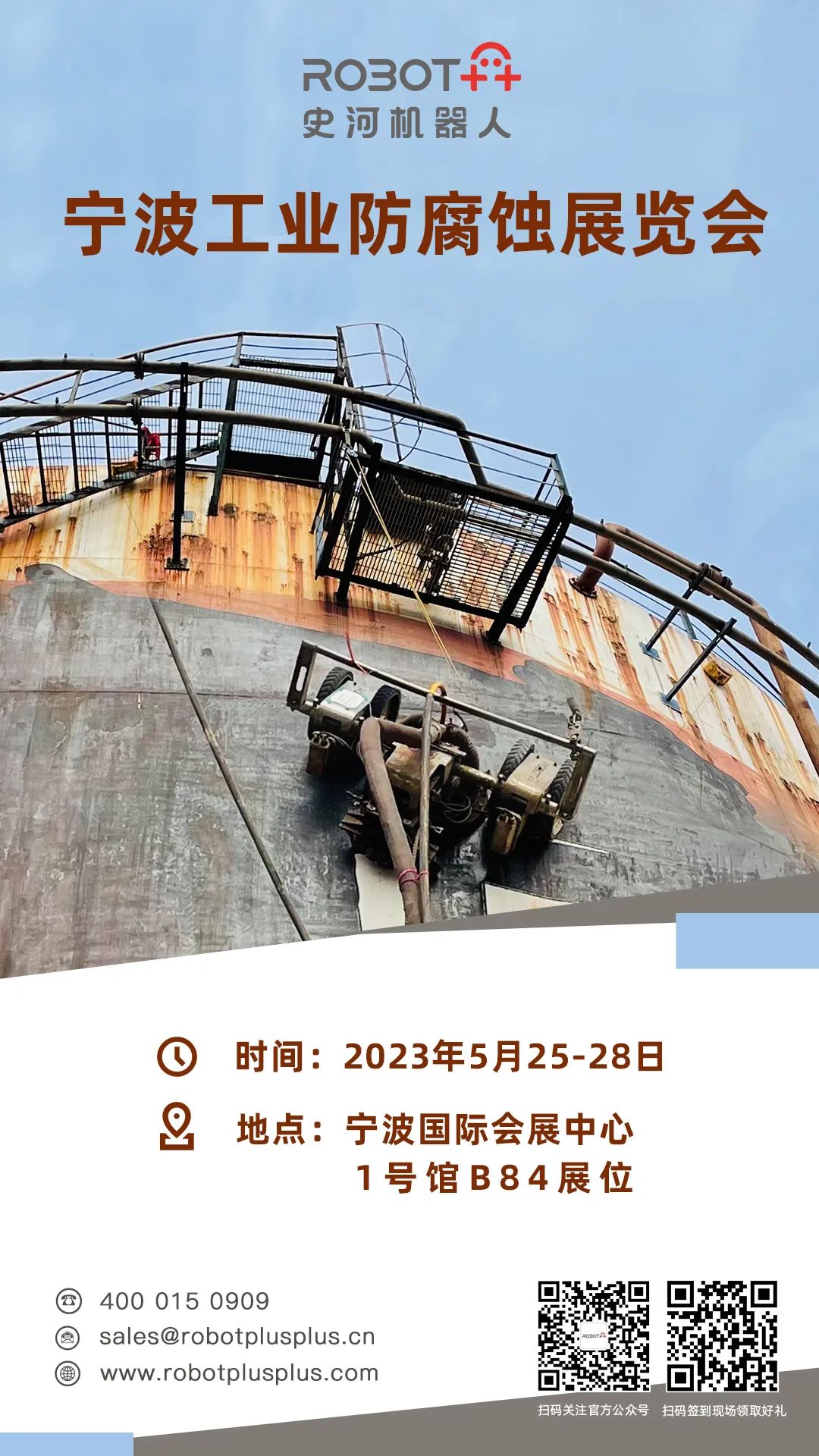 2023第六届中国(宁波)国际防腐蚀产业展览会将于2023年5月25-28日在宁波国际会展中心举行,届时,史河机器人将携化工防腐机器人和球罐打磨机器人亮相1号馆B84展台,欢迎莅临参观。