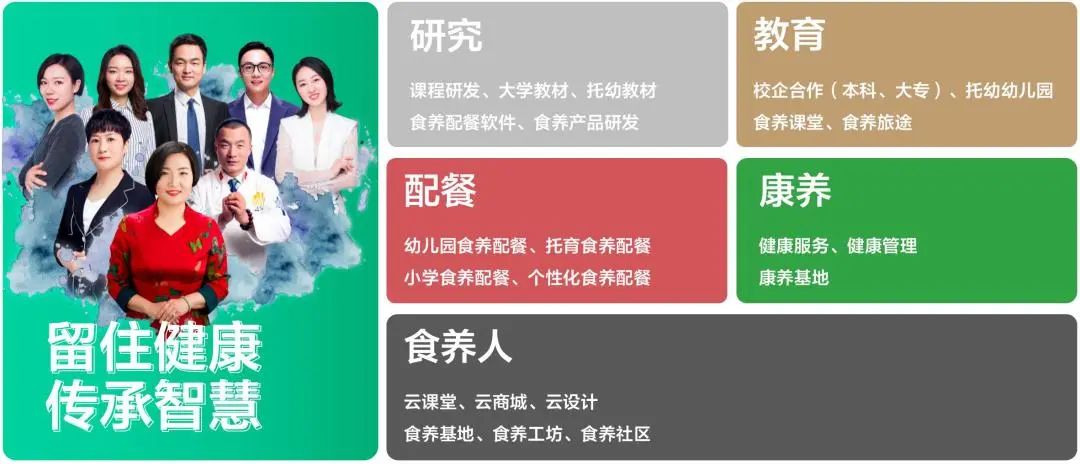 一餐饭:我们立足于做好“一餐饭”,传承东方饮食文化智慧,打造食养品牌,以优良技术开发了幼儿园集体食养配餐、优生优育食谱、月子食谱、儿童健康成长食谱、企业家食养食谱,研制了谷养人、花养人、果养人、茶养人系列产品,让更多家庭学会“知食”、“慧吃”,让健康生活方式惠及千家万户!