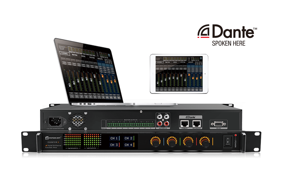 CONFER X 是力卡自主研发的一款具有64通道输入,16通道输出,支持Dante协议的有线数字自动混音器. 64通道输入,16通道输出的模拟、DANTE数字混合矩阵控制,适合更广泛的应用工程. 通过每一路话筒噪声门限设置,自动打开话筒拾音,实现现场话筒的自动智能管理。