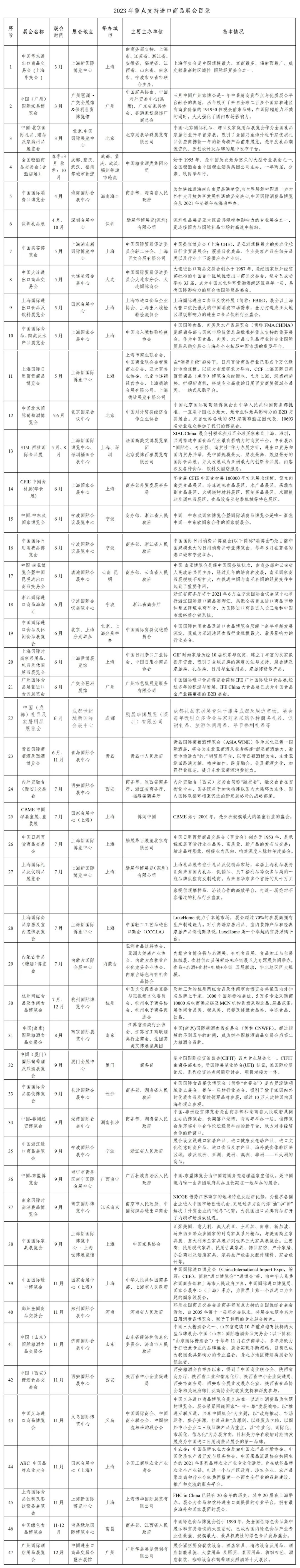 为充分发挥我市支持参加进口展会政策实效,进一步引导进口企业通过展会拓展市场、扩大进口,经研究,商务局拟定了《2023年重点支持进口商品展会目录》,请各企业、单位阅知并积极参展。