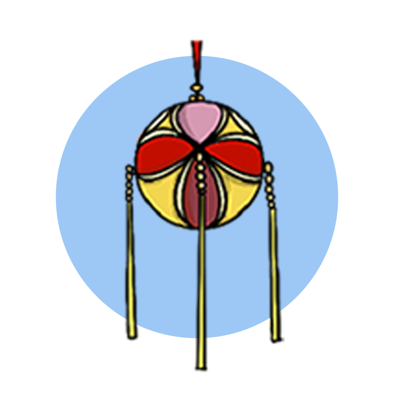 醒狮绣球是舞狮表演中的装饰性道具。由球体和长柄组成,球体多采用竹篾或软木制作,装饰有彩绣图案和流苏。舞者利用醒狮绣球的柔软性和轻盈感,在表演中展示狮子活力四溢的形象,向观众展现华丽精湛的表演技巧。