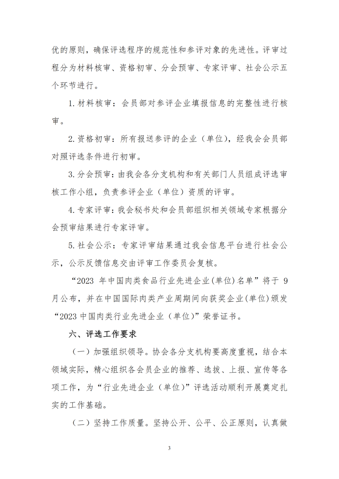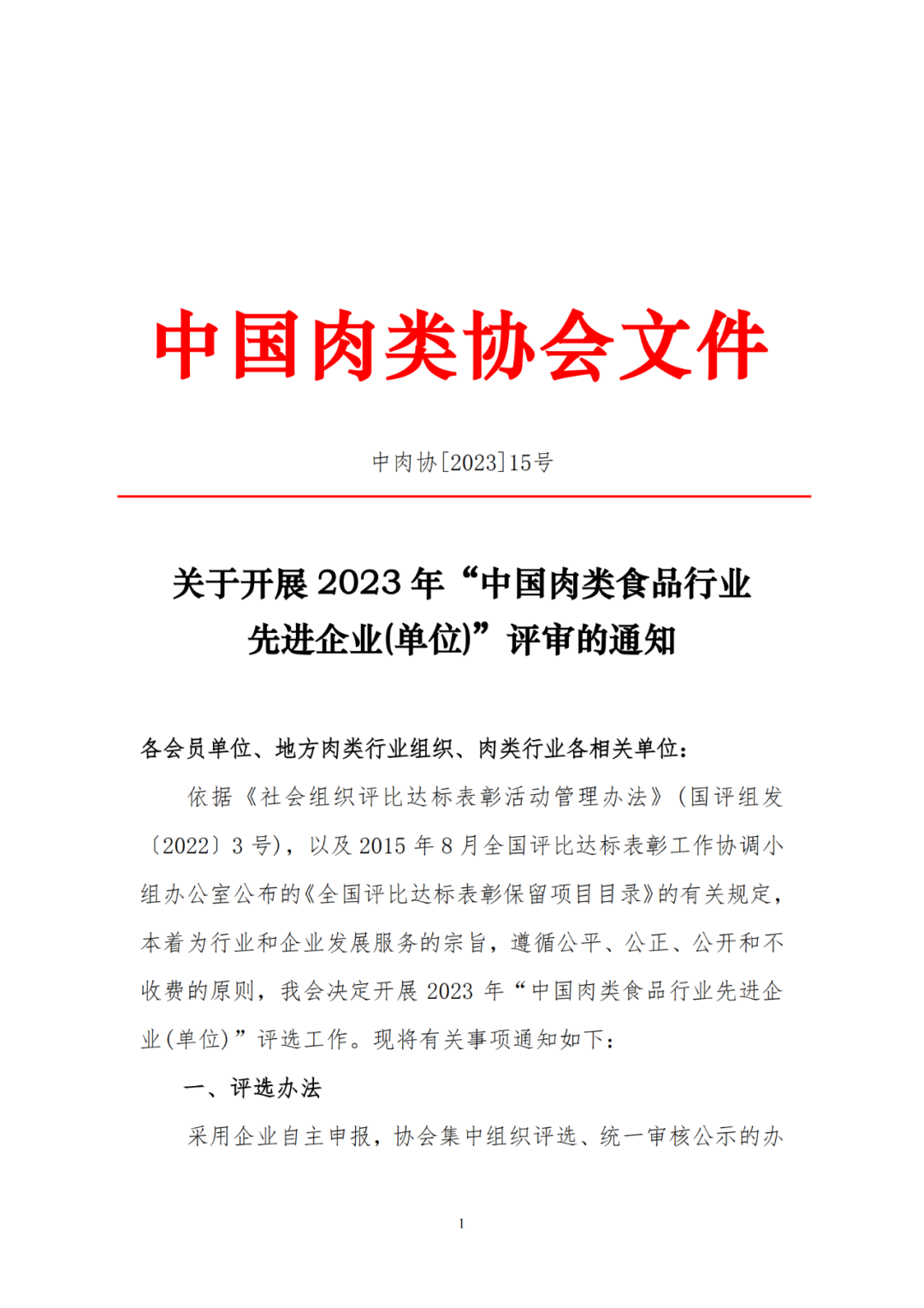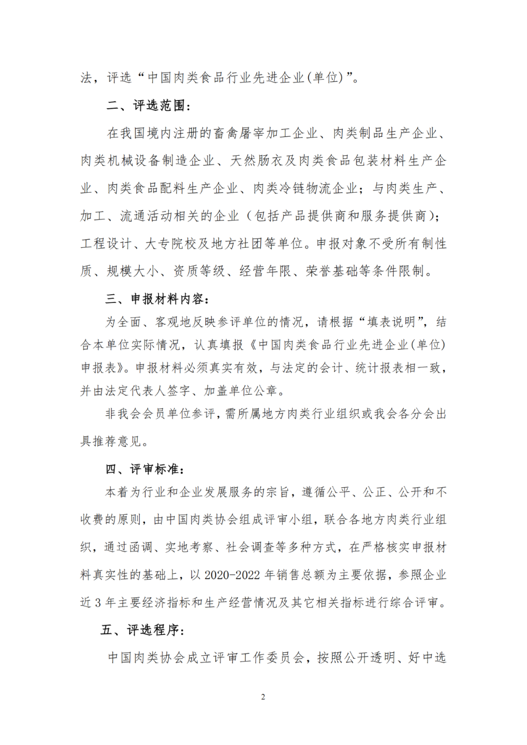 关于开展 2023 年“中国肉类食品行业 先进企业(单位)”评审的通知
