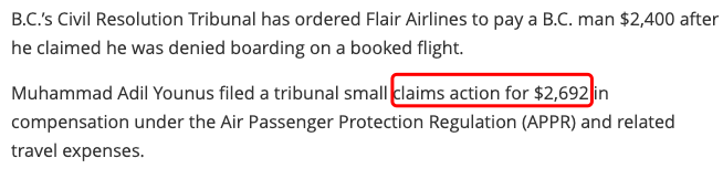乘客名为Muhammad Adil Younus,最初他根据《航空旅客保护条例》(APPR)提出小额索赔,要求Flair航司赔偿2692加元及相关差旅费。作为回应,Flair航司主张Younus无法登机是因为系统技术“故障”,而当他预订第二天的航班时,航班时刻表已经发生了变化。Flair航司辩称,根据APPR条例,航司没有超售机票,因而没有欠拒绝Younus登机的赔偿款。审判长Shelley Lopez最终在5月19日的裁决中判定,Younus理应获赔。Flair航司表示,Younus预订的F8223航班原定于2022年7月18日下午1点45分从多伦多飞往温哥华。不过,这趟航班延误到了第二天上午8点。Lopez说:“根据面前的证据,我承认Younus先生是在2022年7月18日晚上9点预订了F8223航班的机票,而此时F8223航班的时刻表已经被推迟。” 当Younus重新预订机票时,Flair航司告诉了他,他知道这是7月19日上午8点起飞的航班。Lopez指出:“这是事实,但F8223航班原定于7月18日下午1点45分起飞也是事实。”Flair航司一度坚持否认事件中的F8223超售。航空公司表示,Younus不应该收到重新预订机票的通知。但是,Lopez 指出“然而,我发现Flair航司并没有充分解释。如果航班没有超售,为什么Younus先生不能登机。”Flair航司当时还告诉Younus,他下一班能搭乘的航班原定于7月19日晚上7点起飞,但由于延误,又推迟到了晚上11点起飞。“Flair航司的问题在于,它确实给Younus(重新)订了F8223航班的机票,”Lopez说,这无法说明航司没有超额预订F8223航班。相反,我发现这点支持Younus先生的立场。即航司由于自身的故障,Flair超额售卖了F8223航班,因此导致Younus先生被拒绝登机,继而出现了航班二次延误。Lopez说,不管航司的系统有没有故障,当时的F8223航班都很可能是满的。Lopez强调:“在APPR(赔款)条例中,由于故障而超售的情况没有豁免。”Younus先生获赔符合APPR的规定。对于加拿大航空旅客关心的航班延误或取消后的赔款问题,加拿大交通部长长Omar Alghabra近日表示,加拿大政府正修订关于航空公司乘客权利的规例,目的是在让航空公司在航班延误或取消时承担更多责任。