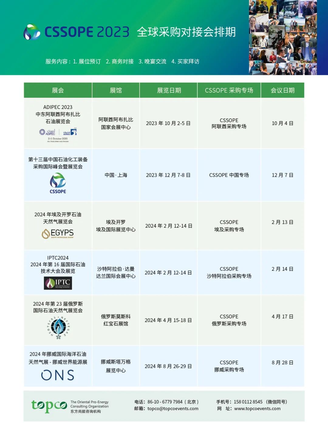 亚洲聚焦石油天然气领域的综合性展会除了OGA,由东方尚能咨询机构主办的“第十三届中国石油化工装备采购国际峰会暨展览会(CSSOPE)”也将于2023年12月7-8日于上海与大家见面!已有多家国际买家与优秀设备服务供应商提前确认参与。目前已全面开放报名,展商及参会代表可提前预订位置。