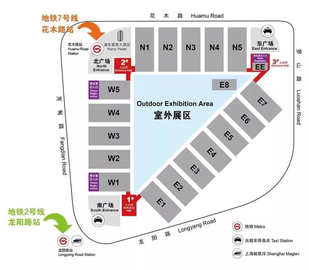 你可下载“ Metro大都会”手机扫码即可乘坐地铁。1号南入口大厅位于芳甸路与龙阳路交叉口,可直接通往E1及W1馆。2号北入口大厅位于芳甸路与花木路交叉口,可直接通往N1及W5馆。3号东入口大厅位于花木路与罗山路交叉口,可直接通往N5,E7,EE和E8馆。乘坐出租车离馆的小伙伴们,注意啦!!!开展期间,每日离馆高峰时段需在 1号南入口大厅及 2号北入口大厅处排队乘坐出租车,请知悉。多条公交线路途经展馆,附近设有站点:989区间、大桥五线, 大桥六线区间、方川专线、东川专线、花木1路、机场五线、975、976等。相对于地铁,公交车路线可能会遭遇等车时间长,堵车等情况,因此小英还是建议大家,选择地铁出行哦。展馆位于龙阳路、罗山路交汇处,易于通行。从市中心横跨南浦大桥、杨浦大桥可直达。停车费:每小时8元,单日64元封顶。(此费率适用于小轿车或其它轻型车辆)无论你是从浦东国际机场还是虹桥国际机场出发,均有多种交通方式供你选择:出租车:约35分钟(途径机场高速);车费约150元;磁浮列车:仅8分钟;单程50元(如出示机票或使用上海交通公交卡,单程40元),往返80元;大巴:机场五线至龙阳路站下,步行或换乘7号线至展馆;约50分钟;车费16元;地铁:乘2号线至龙阳路站下,步行或换乘7号线至展馆;约60分钟;车费6元。地铁:乘2号线至龙阳路站下,步行或换乘7号线至展馆;约60分钟,车费6元。出租车:相距约17公里,约30分钟,车费约60元;地铁:可乘1号线至人民广场站或4号线至世纪大道站下,换乘2号线至龙阳路站下,步行或换乘7号线至展馆2号北入口大厅,约50分钟,车费4元。出租车:相距约30公里,约50分钟,车费约110元;地铁:乘2号线至龙阳路站下,步行或换乘7号线至展馆2号北入口大厅,约65分钟,车费6元。出租车:相距约20公里,约30分钟,车费约70元;地铁:可乘1号线到人民广场站,换乘2号线至龙阳路站下,步行或换乘7号线至展馆2号北入口大厅,约55分钟,车费5元。今年共3000多家企业参展,共33个展馆,展览面积27万平米。如此大的展览,让人不得不眼花缭乱!附企业展位图: