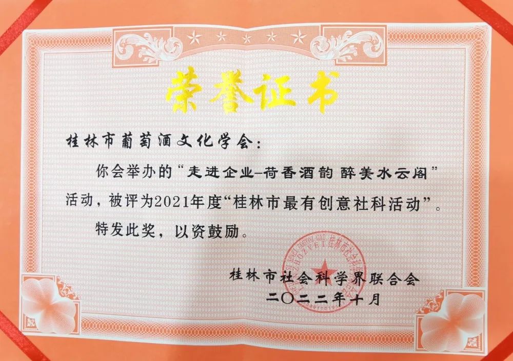 出席本次会议的领导有桂林市社科联隆斌主席、邹静副主席、伍垂龙副主席、荔浦市社科联领导等。市社科联对2021年度作出突出贡献的社科单位和先进个人进行表彰,桂林市葡萄酒文化学会喜获多项殊荣。