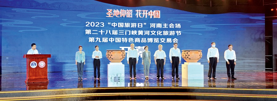 5月19日,第九届中国特色商品博览交易会在河南省三门峡国际文博城开幕。中国商业联合会会长姜明、商务部原副部长张志刚、河南省副省长张敏、文化和旅游部资源开发司二级巡视员白四座、河南省委宣传部常务副部长黄玉国、河南省政府副秘书长于燕、河南省文化和旅游厅厅长黄东升、三门峡市委书记范付中、三门峡市委副书记、市长徐相锋等领导出席开幕式。中国商业联合会副秘书长、会展部部长、采购商分会会长李宝陪同出席开幕式。 第九届中国特色商品博览交易会由中国商业联合会、中国商业企业管理协会支持,河南省文化和旅游厅、河南省商务厅、中国国际贸易促进委员会河南省委员会、中共三门峡市委、三门峡市人民政府共同主办,以“相约黄河畔,畅游三门峡”为主题,以保护传承弘扬黄河文化为主线,以创新讲好仰韶文化故事为重点,突出落实战略的使命担当、文旅融合的发展方向、以节促产的务实追求、山水之城的特色魅力和全民参与的浓厚氛围,积极助推文旅经济发展壮大,不断激发市场消费活力,为全面开创现代化三门峡建设新局面注入新动能、谱写时代新篇章。 近年来,河南省牢记习近平总书记的殷殷嘱托,着眼建设文化旅游强省,深入实施文旅文创融合战略,着力打造“行走河南·读懂中国”品牌体系,持续推动文化旅游高质量发展取得新成效。三门峡以习近平总书记致仰韶文化发现和中国现代考古学诞生100周年贺信为动力,依托深厚的文化底蕴和丰富的旅游资源,以建设文化旅游强市为目标,落实黄河战略、弘扬黄河文化、深化区域合作,全市文化旅游产业呈现融合发展、高质量发展的良好态势。作为2023“中国旅游日”河南主会场,三门峡借力第二十八届三门峡黄河文化旅游节·第九届中国特色商品博览交易会,举办20项文化旅游商贸活动,用开放进取、奋力前行的姿态描绘了一幅瑰丽多姿、活力迸发的绚丽画卷,也为“建设具有国际影响力的黄河文化旅游带”、深化黄河流域旅游合作交流搭建了重要平台。