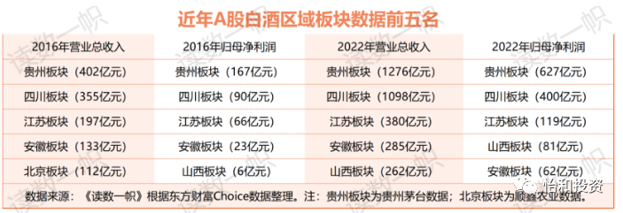 与上轮白酒黄金十年中只有头部几家酒企全国化不同,此轮白酒复苏中,多家地方白酒公司纷纷发力省外市场的同时,纷纷推出中高端产品,白酒公司激战正酣。 抓住此轮白酒复苏机遇、产品结构及时升级的酒企,业绩纷纷大涨。同时,亦有部分公司错失了此轮红利。 从营业总收入来看,2016年,贵州板块凭借贵州茅台(600519.SH)的402亿元,高居榜首。四川、江苏、安徽、北京分居第二位至第五位。2022年该数据排名中,贵州、四川、江苏、安徽仍分居前四,山西板块凭借山西汾酒(600809.SH)的高歌猛进,取代北京进入前五。 白酒总收入前四名板块中,除川酒板块跟上黔酒板块的步伐,苏酒板块、皖酒板块与行业老大的差距在拉大。2016年和2022年,黔酒板块营收与苏酒板块、皖酒板块之间数据相比,优势由2.04倍、3.02倍,分别扩大至3.36倍、4.48倍。