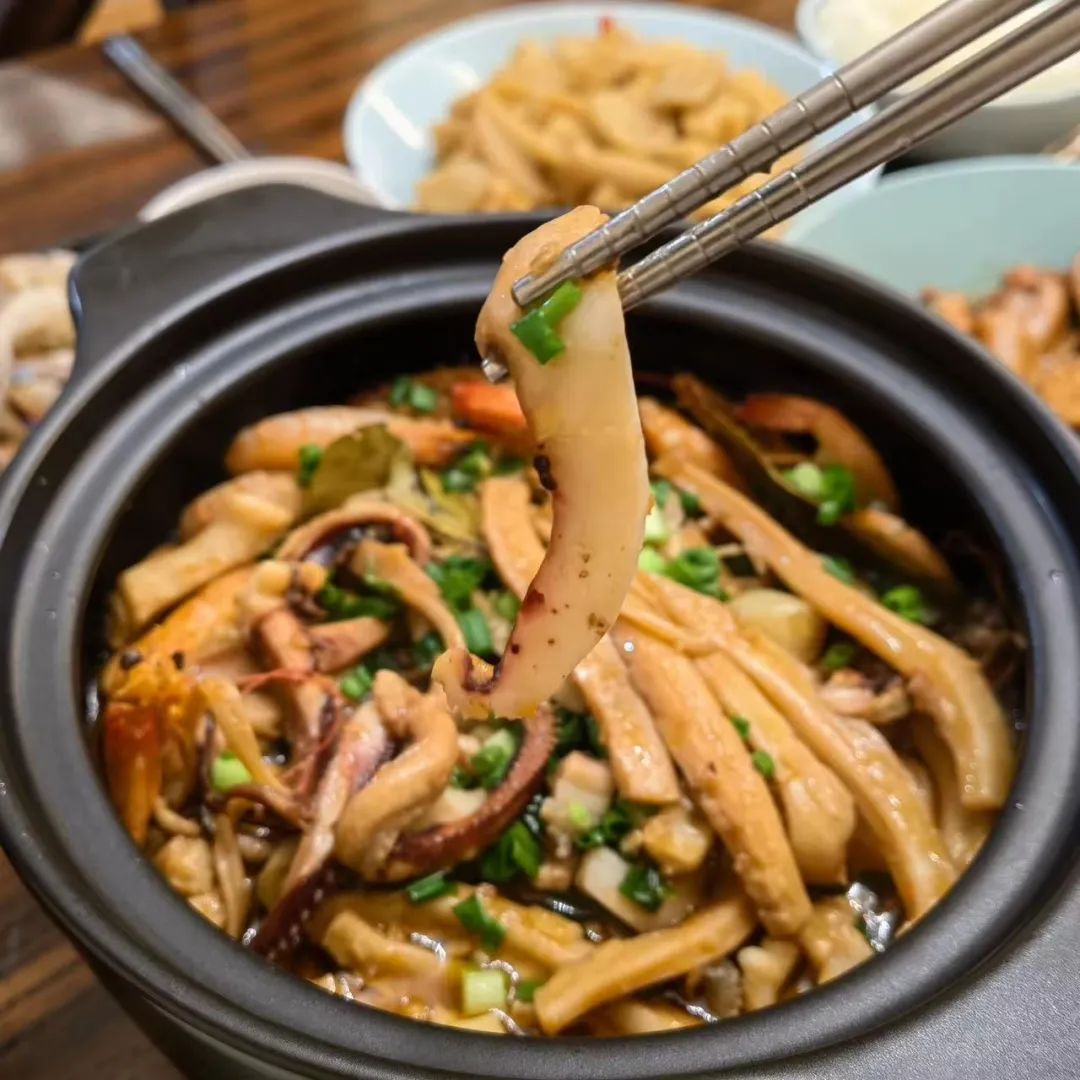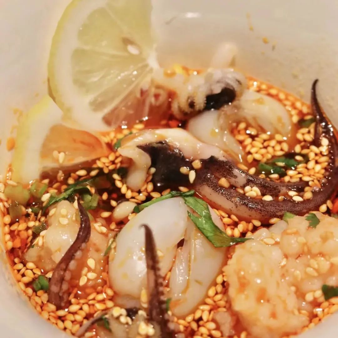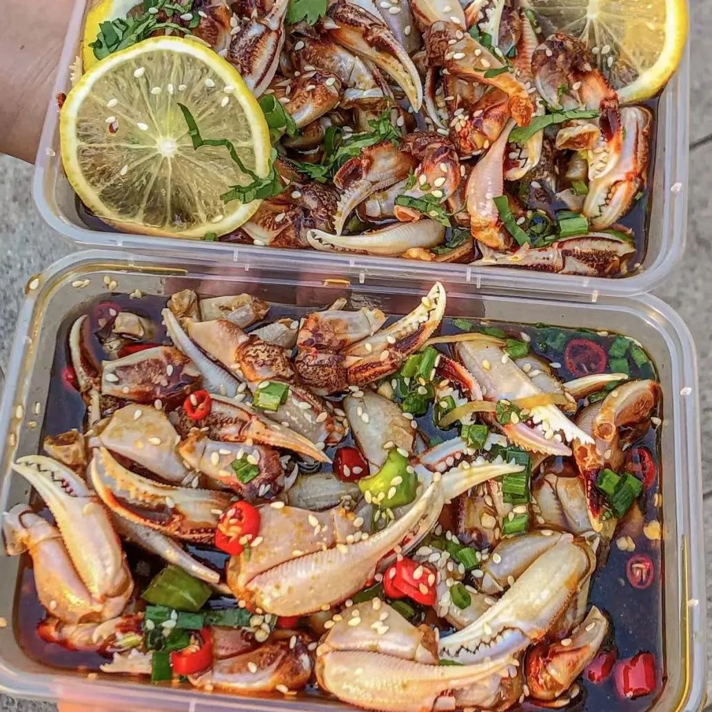 我试吃了一下,捞汁的口味不轻,与潮汕等地相比,这是属于舟山的重口味捞汁。四种口味的捞汁小海鲜,分别是鲍鱼、虾滑、鱿鱼和蟹钳,每个口味一小份,带汁250克,半斤。四种口味就是两斤,一个人配一两杯啤酒,恐怕还吃不完。