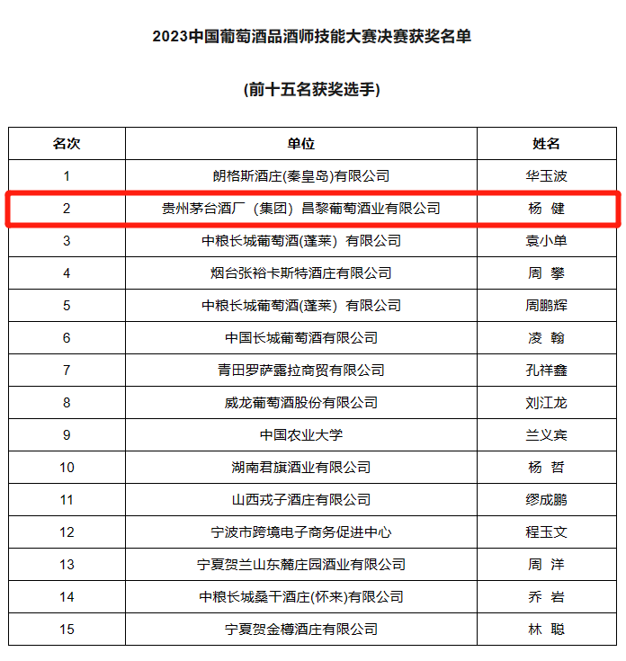 据中国酒业协会消息,5月20日-21日2023年中国葡萄酒品酒师技能大赛决赛在浙江青田举办,贵州茅台酒厂(集团)昌黎葡萄酒业有限公司杨健获得2023中国葡萄酒品酒师技能大赛第二名。