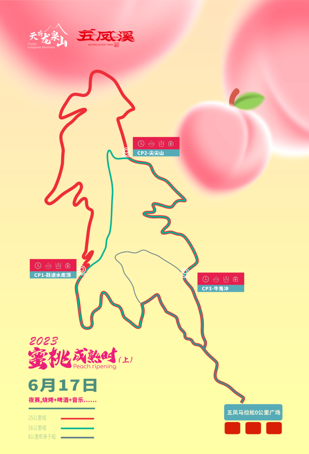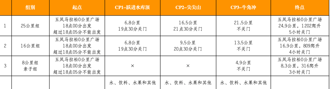 报名时间:5月24日-6月8日24点,额满提前截止,早鸟价报名时间5月24日到5月29日24点。 活动时间:6月17日(周六),18:00-23:00。 组别和规模:25公里组、16公里组、8公里和亲子组,共计300人。路线:五凤马拉松0公里广场(起点)→淮洛路→斑竹院→跃进水库→叶家山→天路→金龙山口→尖尖山→白岩村→牛角冲→破锣沟→金凤村→五凤马拉松0公里广场(终点)。路线:五凤马拉松0公里广场(起点)→淮洛路→斑竹院→跃进水库→叶家山→天路→尖尖山→白岩村→牛角冲→破锣沟→金凤村→五凤马拉松0公里广场(终点)。路线:五凤马拉松0公里广场(起点)→淮洛路→斑竹院→金凤村→五凤马拉松0公里广场(终点)。 25公里组:早鸟价(5月24日-5月29日24点)¥260元,正常价(5月29日24点之后)¥300。 16公里组:早鸟价(5月24日-5月29日24点)¥200元,正常价(5月29日24点之后)¥240。 8公里组:早鸟价(5月24日-5月29日24点)¥160元,正常价(5月29日24点之后)¥200。 亲子组:早鸟价(5月24日-5月29日24点)¥180元,正常价(5月29日24点之后)¥220。- 活动组织服务:保险、路标、起终点服务、补给站服务、计时服务和摄影服务等。