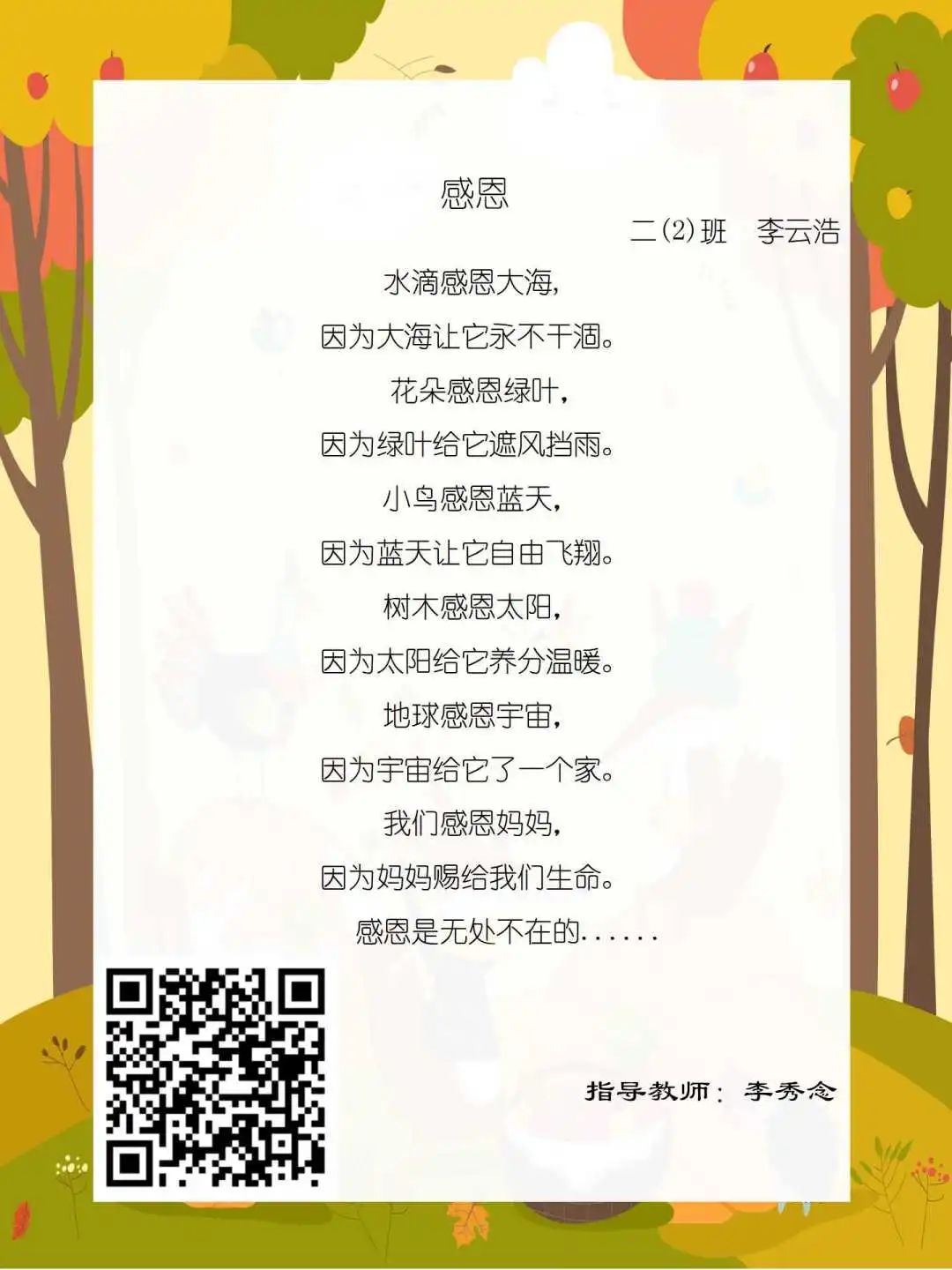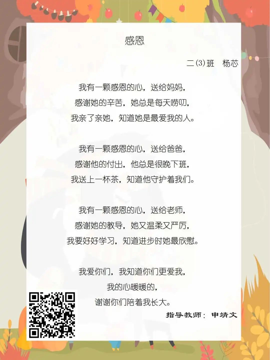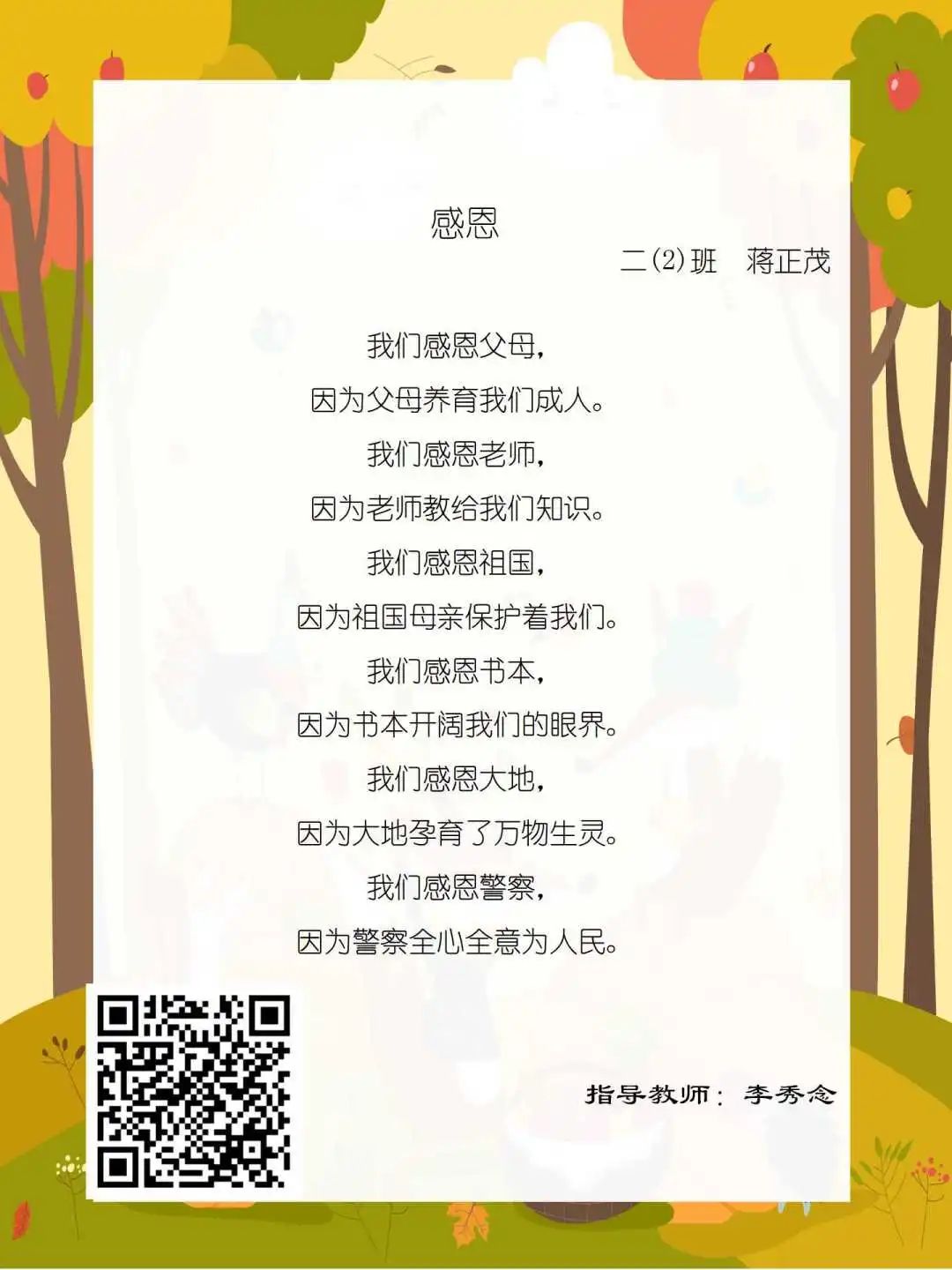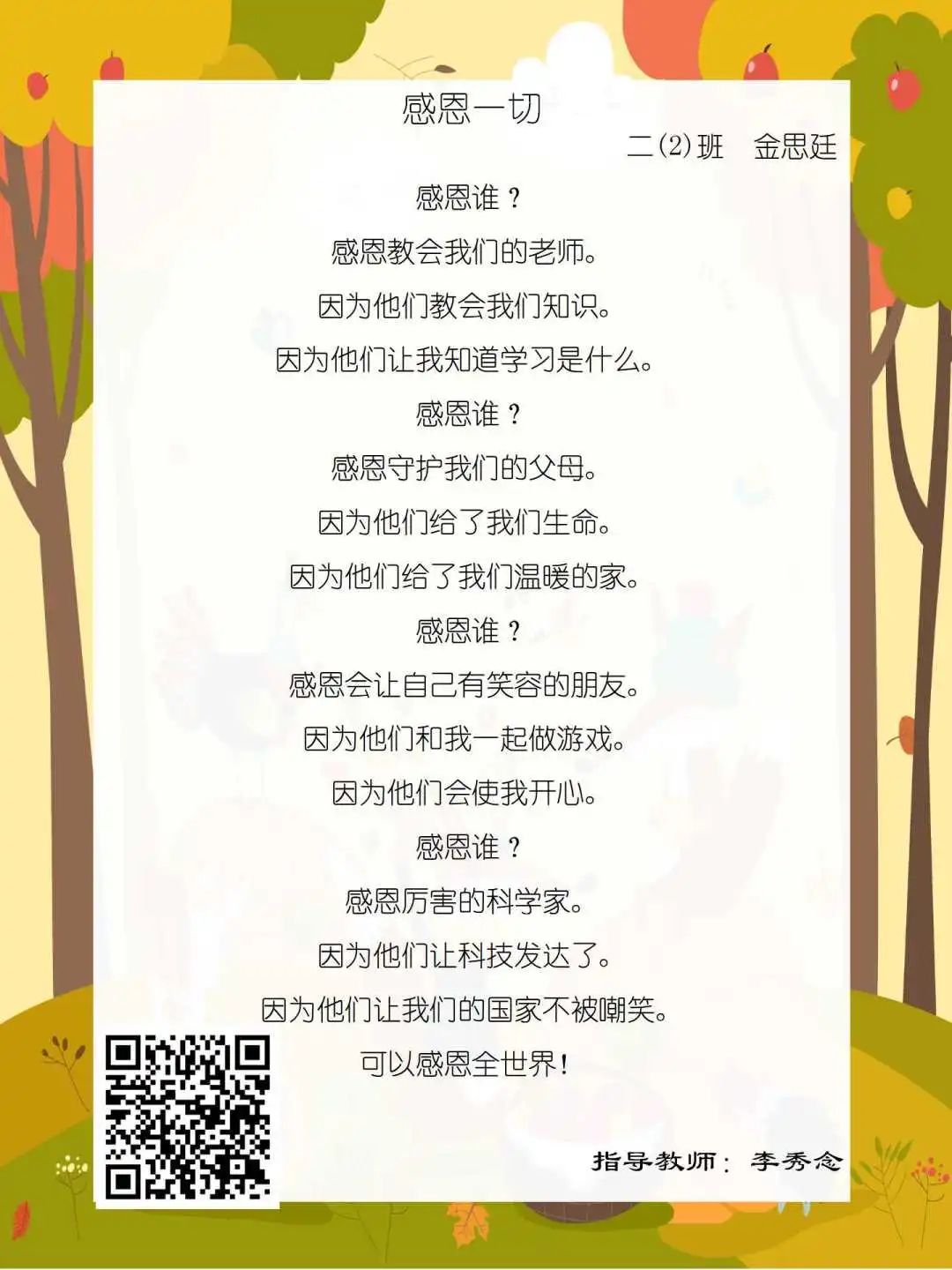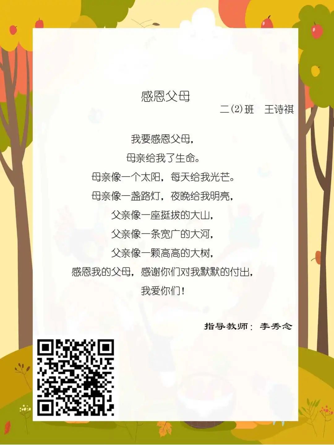 在学校领导的关心下,在下年级干部周晋羽老师和年级组长李秀念老师的带领下,在二年级老师和家长的共同努力下,孩子们用自己对感恩的理解,用文字承载深情厚意,把平时藏在心里感恩的话语,用真诚的小诗传达出来,展现他们内心最真挚的感恩之情!点开小诗左下方的二维码,还能听到小作者们情感充沛地朗诵!
