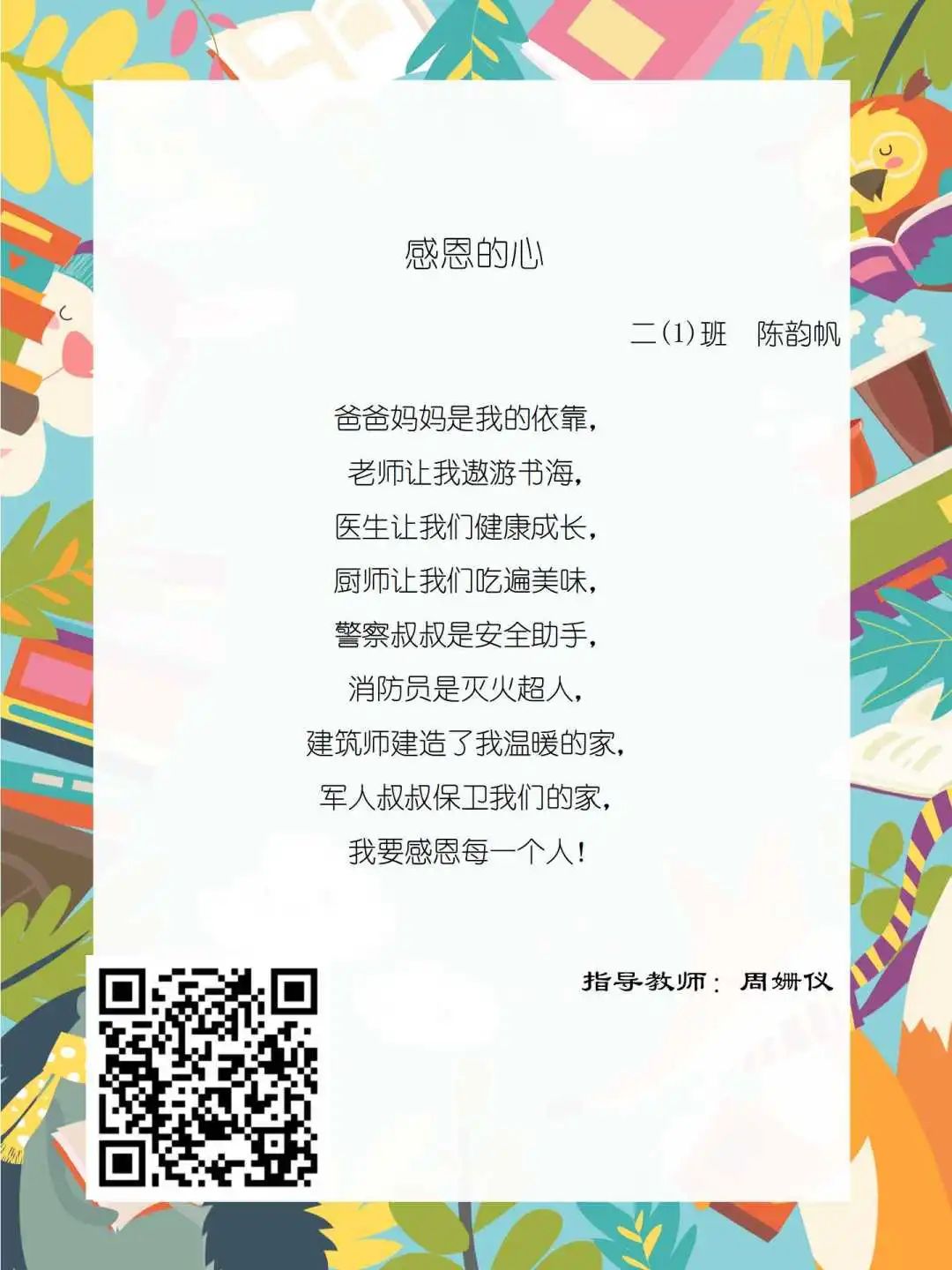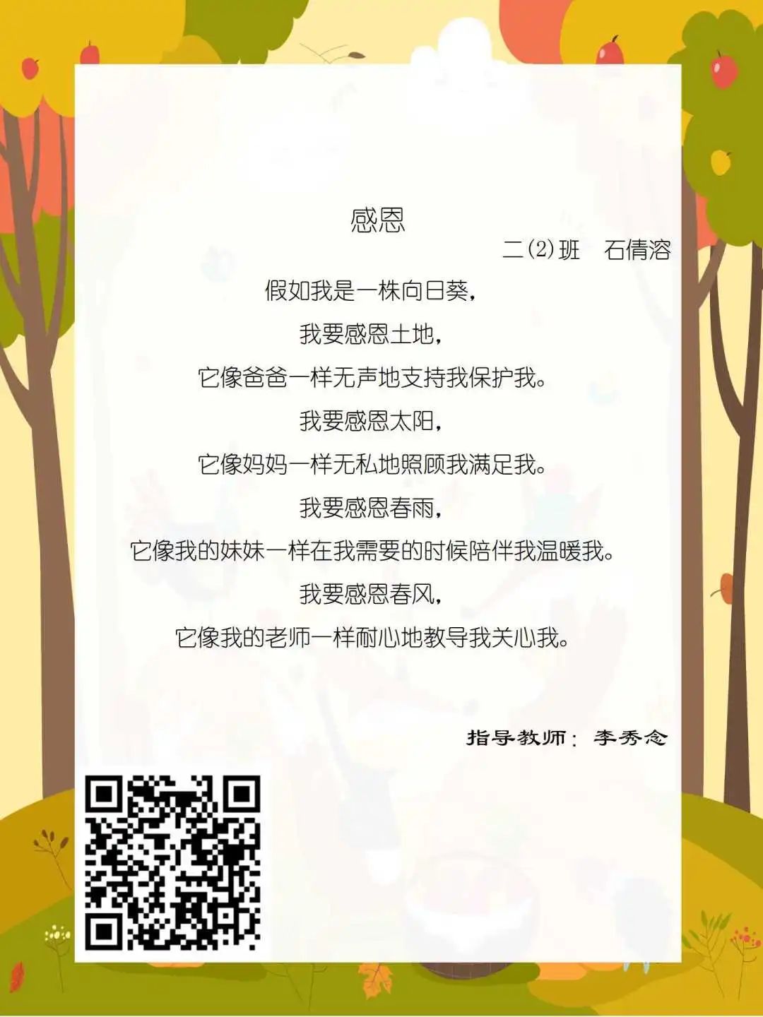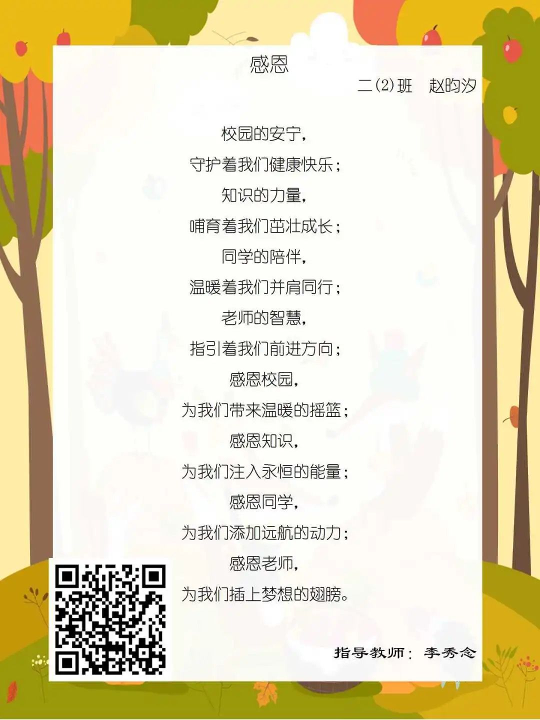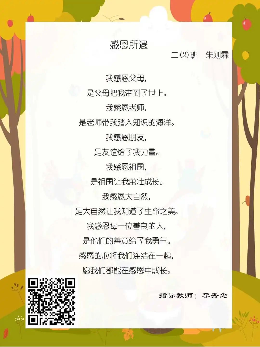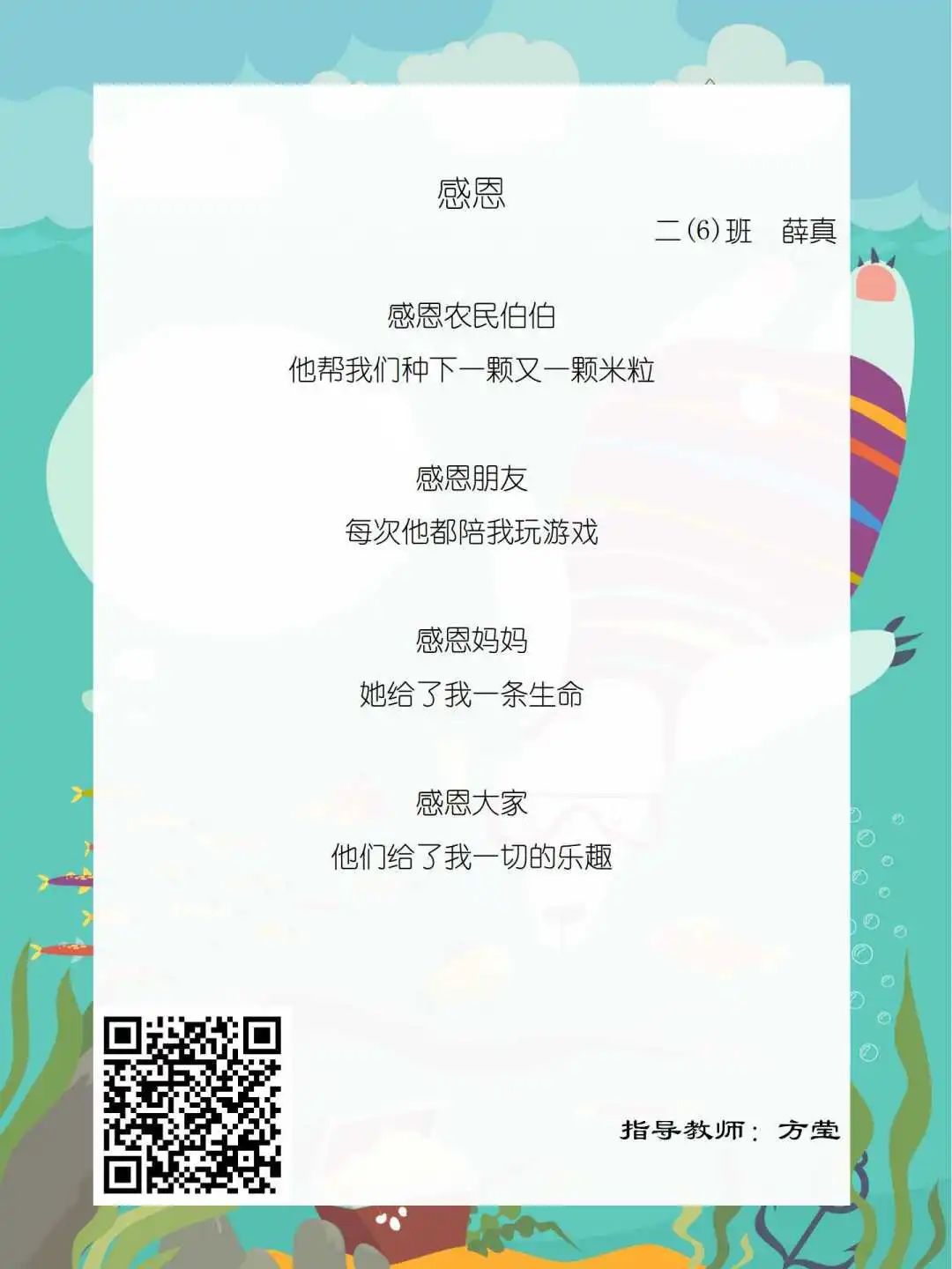 在学校领导的关心下,在下年级干部周晋羽老师和年级组长李秀念老师的带领下,在二年级老师和家长的共同努力下,孩子们用自己对感恩的理解,用文字承载深情厚意,把平时藏在心里感恩的话语,用真诚的小诗传达出来,展现他们内心最真挚的感恩之情!点开小诗左下方的二维码,还能听到小作者们情感充沛地朗诵!
