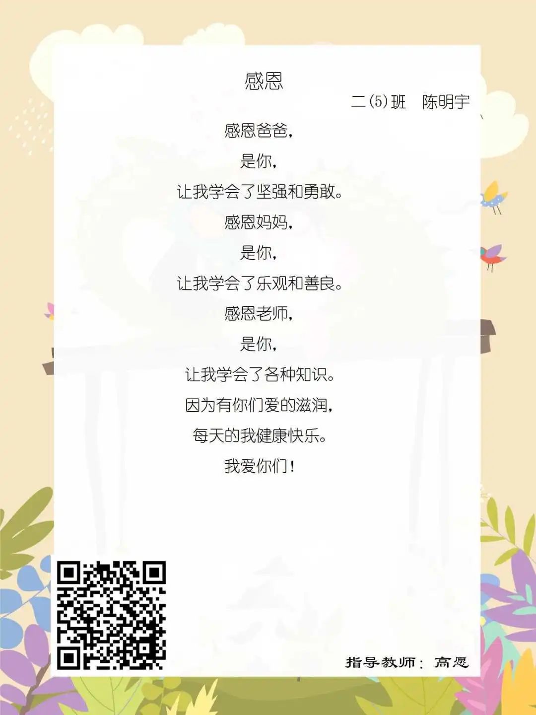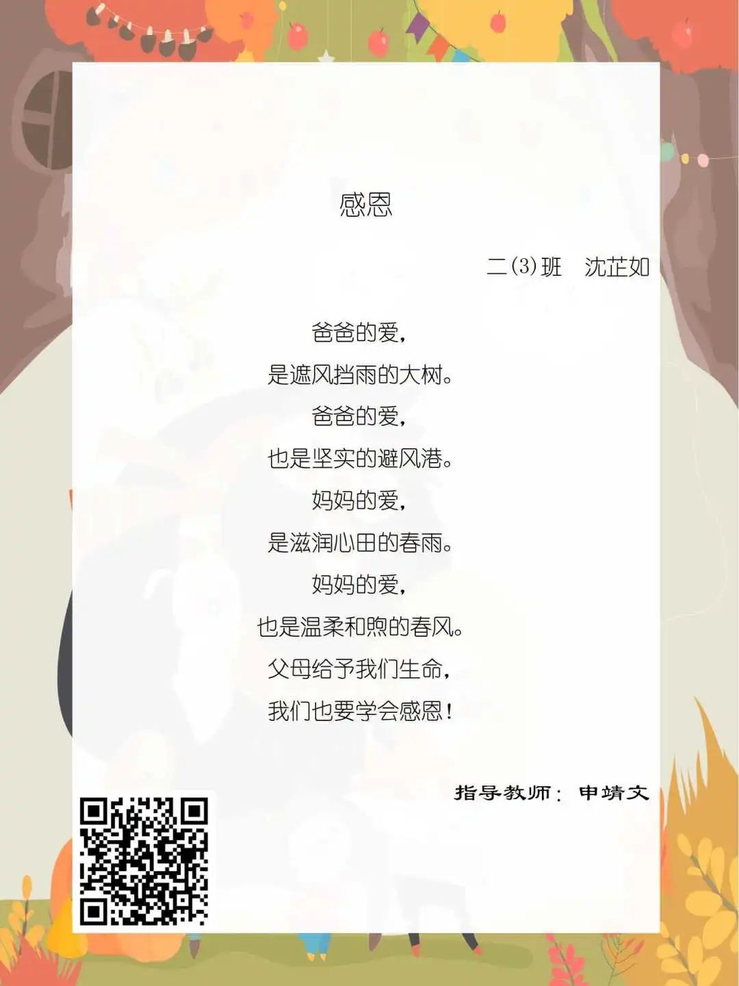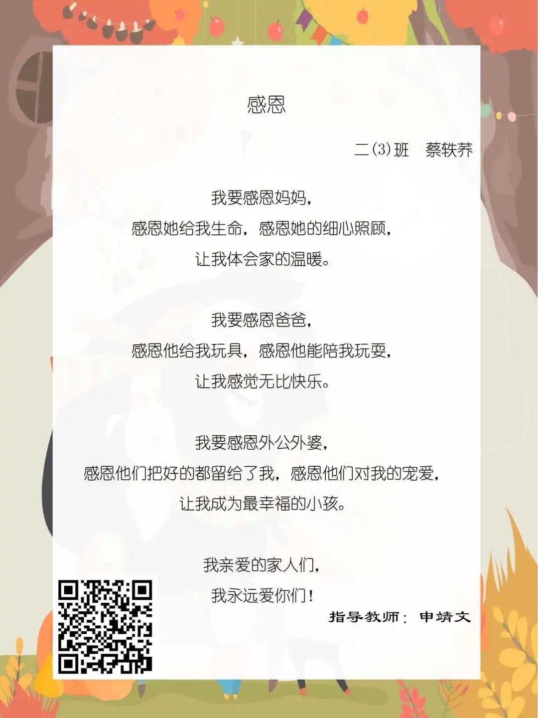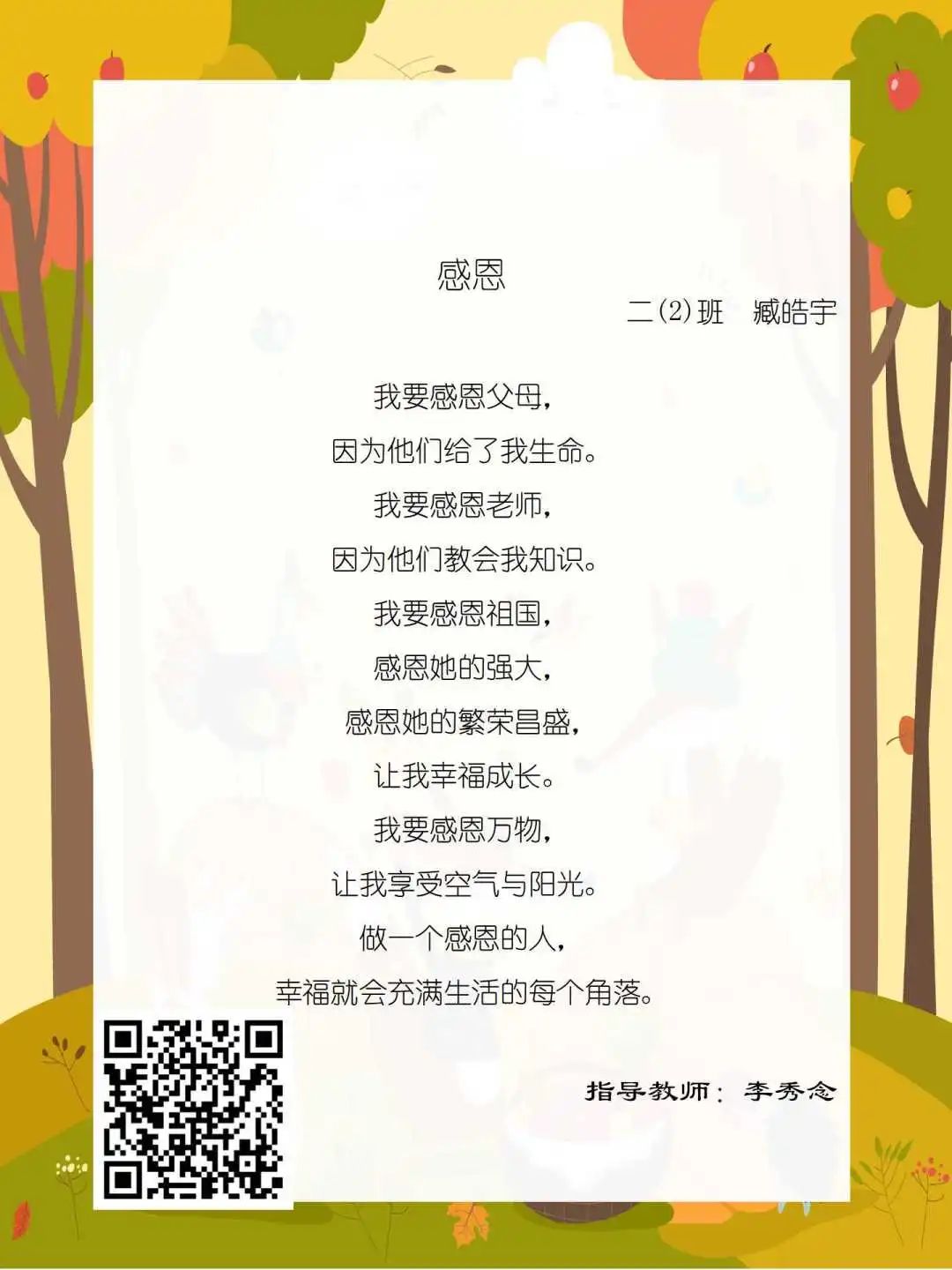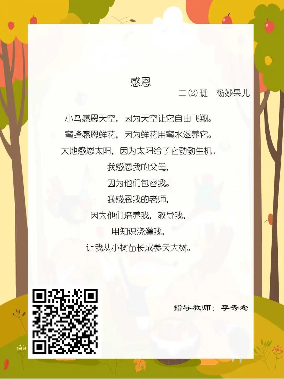 在学校领导的关心下,在下年级干部周晋羽老师和年级组长李秀念老师的带领下,在二年级老师和家长的共同努力下,孩子们用自己对感恩的理解,用文字承载深情厚意,把平时藏在心里感恩的话语,用真诚的小诗传达出来,展现他们内心最真挚的感恩之情!点开小诗左下方的二维码,还能听到小作者们情感充沛地朗诵!
