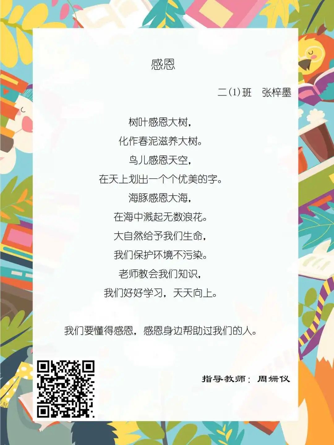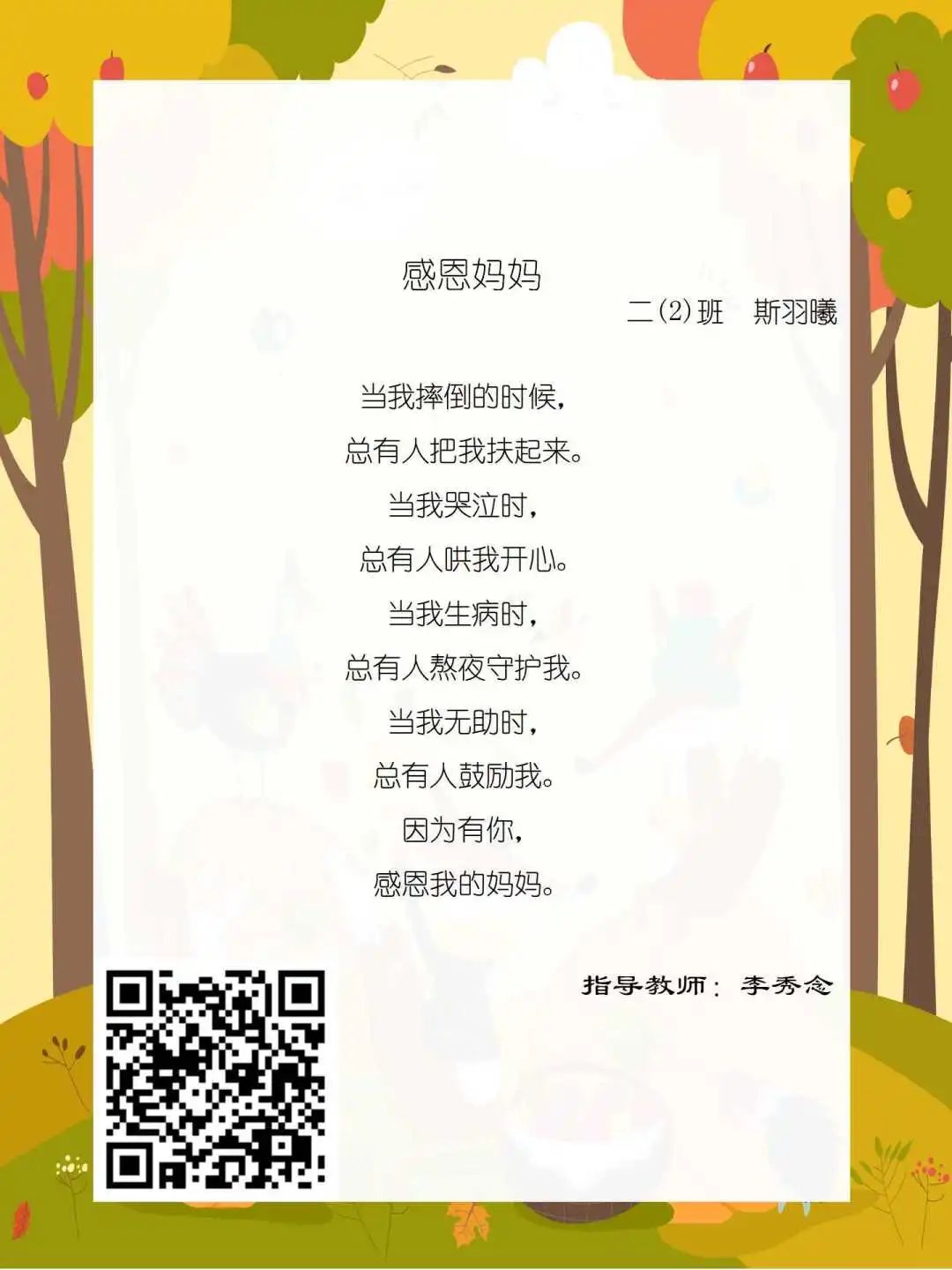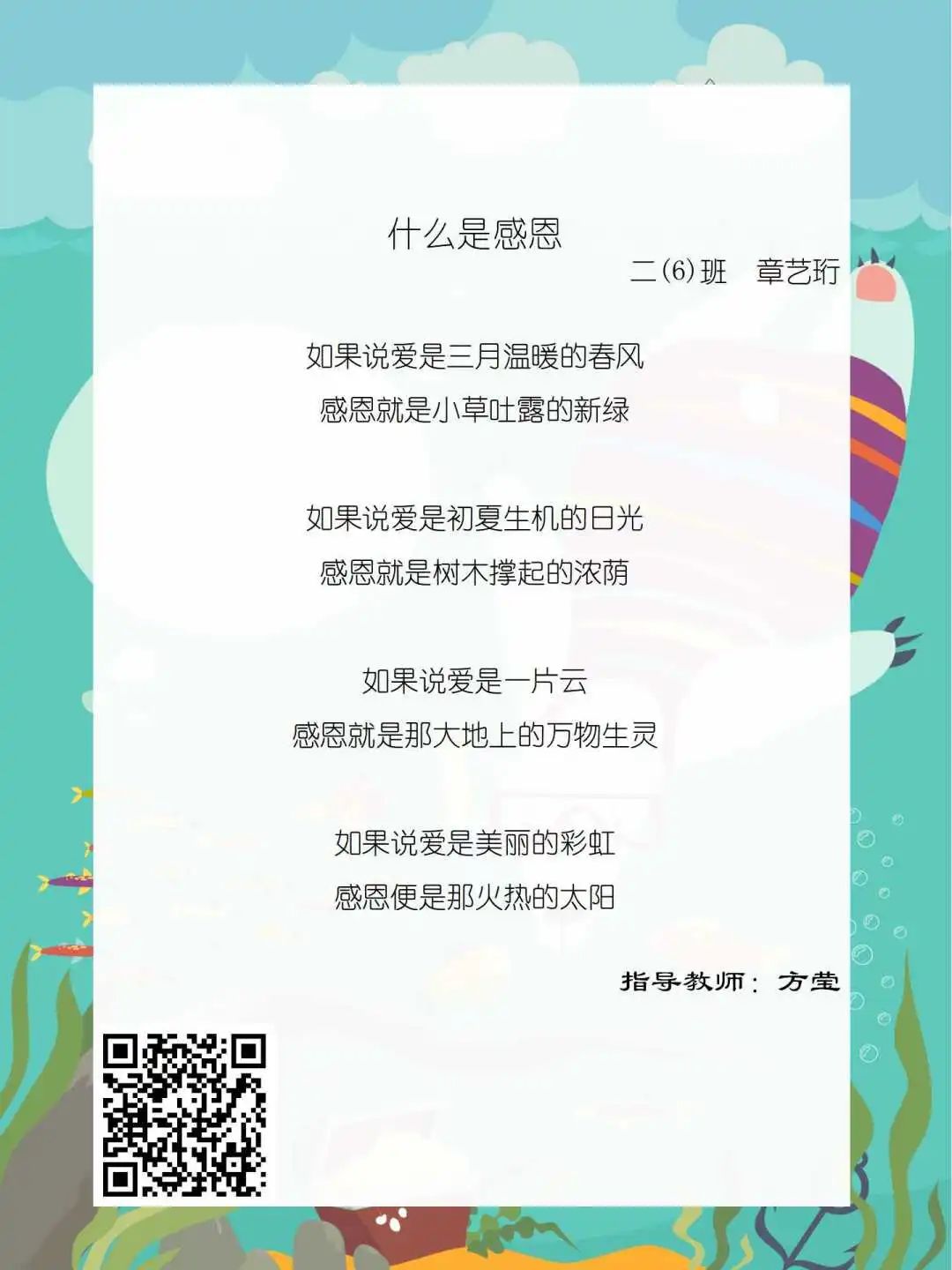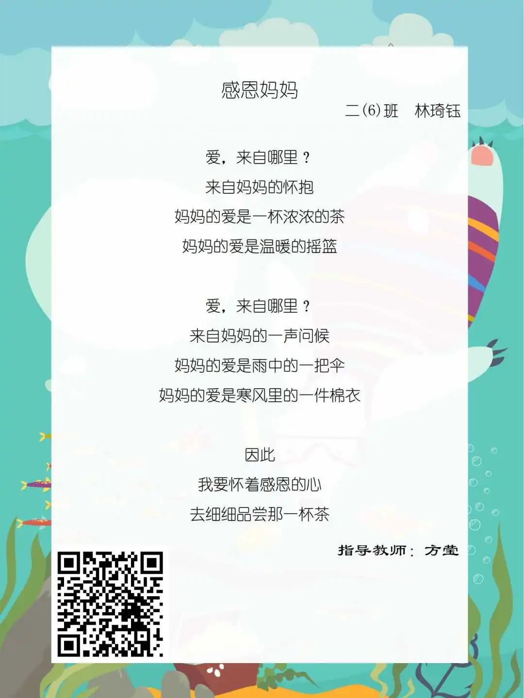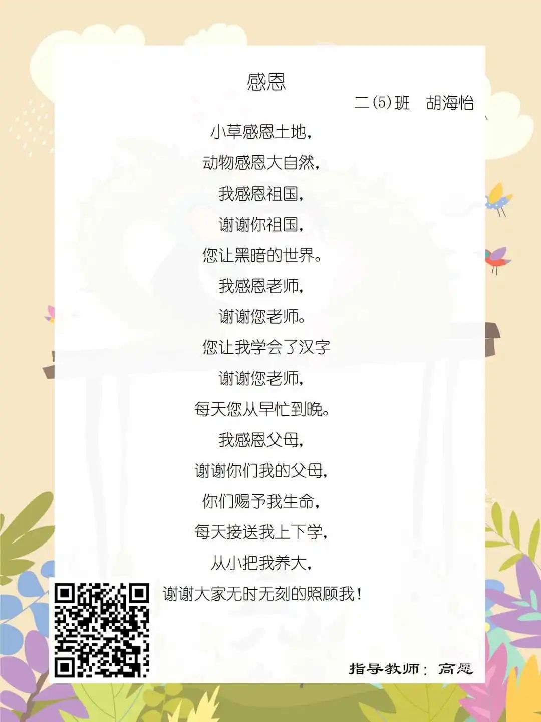 在学校领导的关心下,在下年级干部周晋羽老师和年级组长李秀念老师的带领下,在二年级老师和家长的共同努力下,孩子们用自己对感恩的理解,用文字承载深情厚意,把平时藏在心里感恩的话语,用真诚的小诗传达出来,展现他们内心最真挚的感恩之情!点开小诗左下方的二维码,还能听到小作者们情感充沛地朗诵!