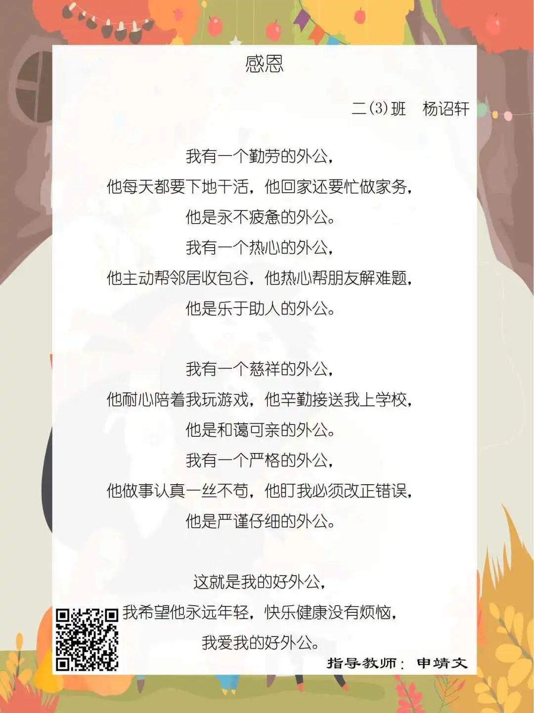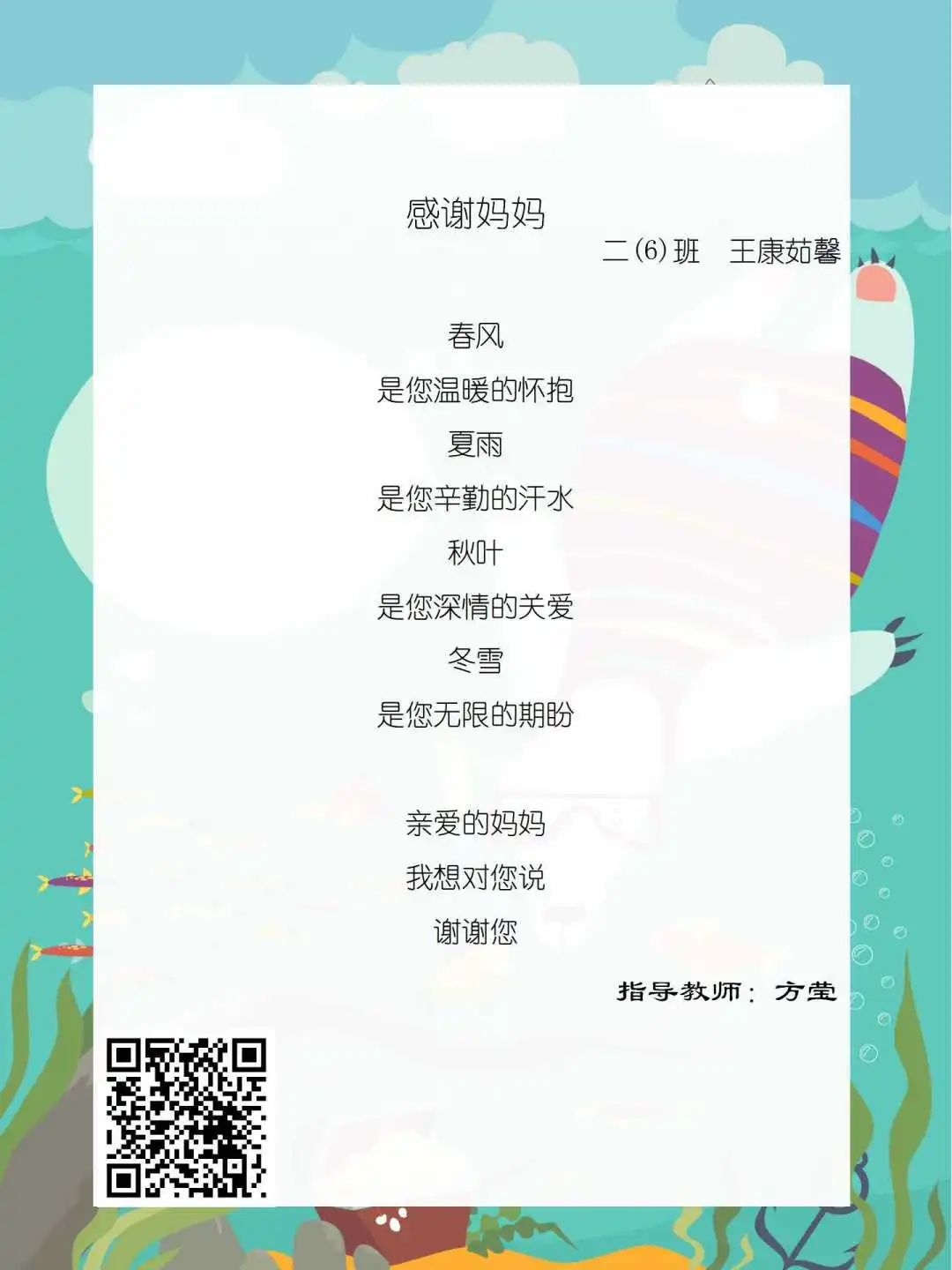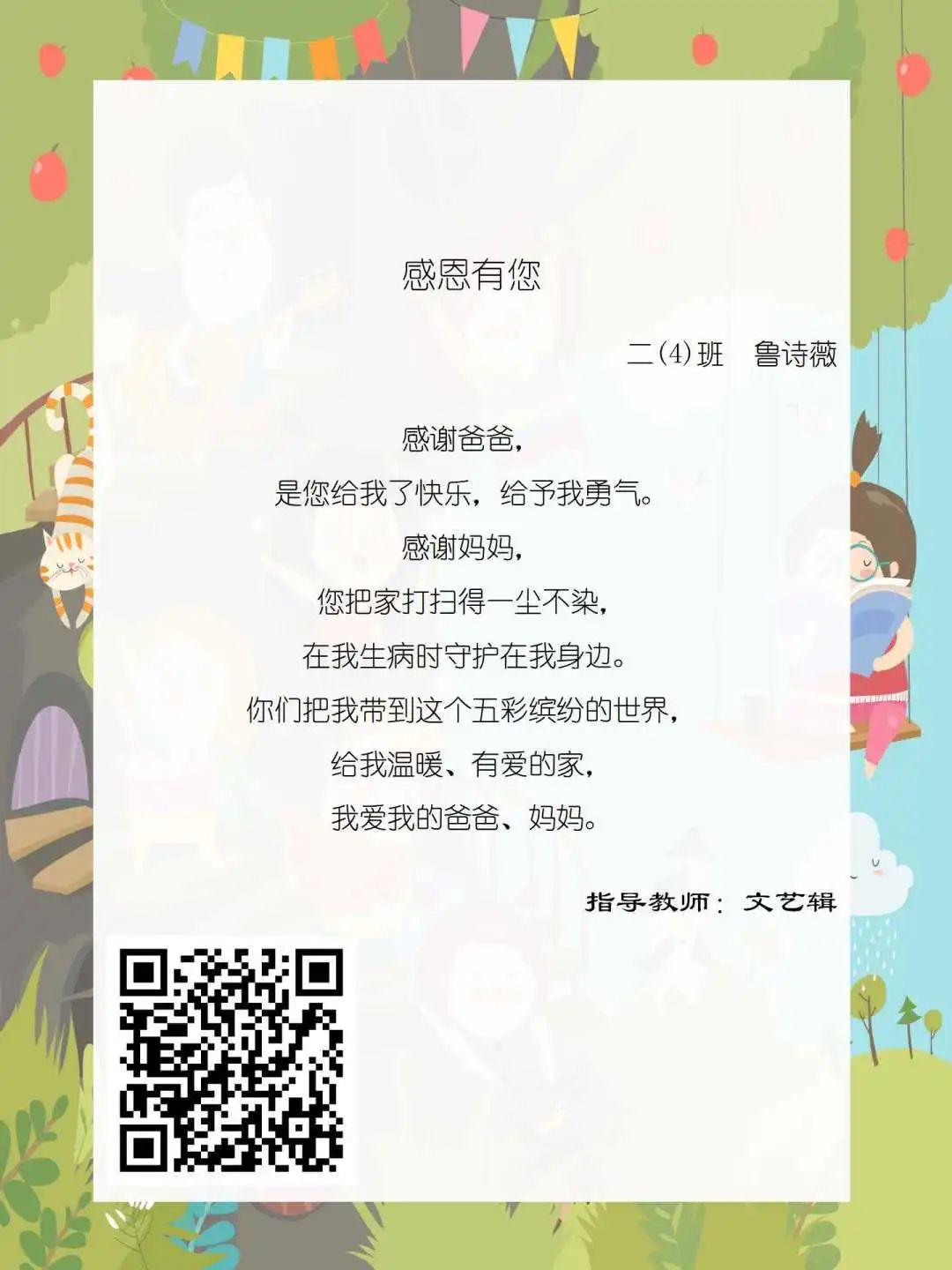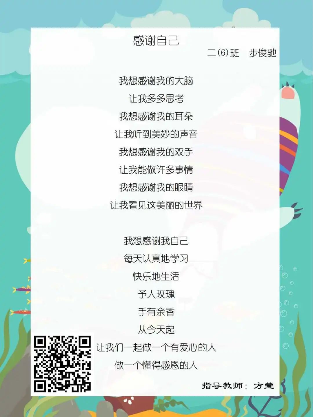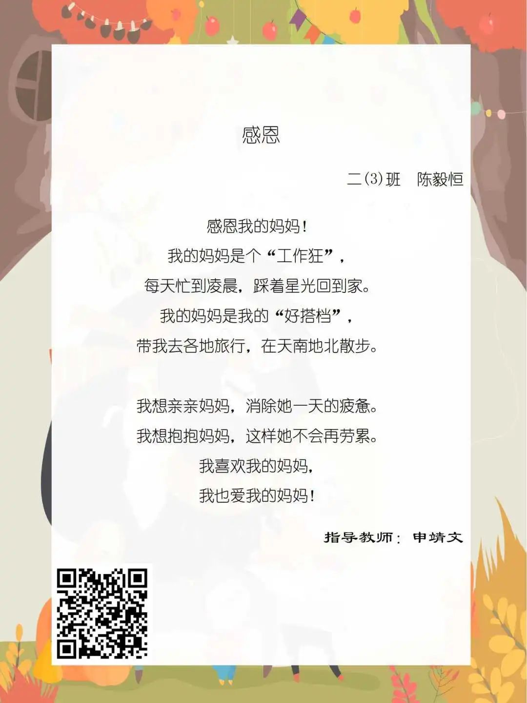 在学校领导的关心下,在下年级干部周晋羽老师和年级组长李秀念老师的带领下,在二年级老师和家长的共同努力下,孩子们用自己对感恩的理解,用文字承载深情厚意,把平时藏在心里感恩的话语,用真诚的小诗传达出来,展现他们内心最真挚的感恩之情!点开小诗左下方的二维码,还能听到小作者们情感充沛地朗诵!