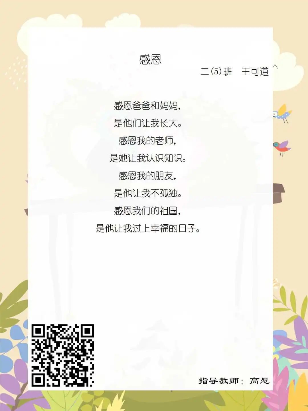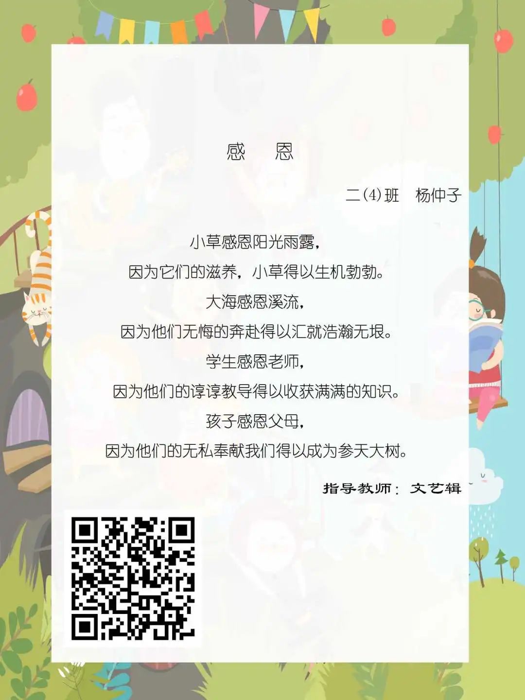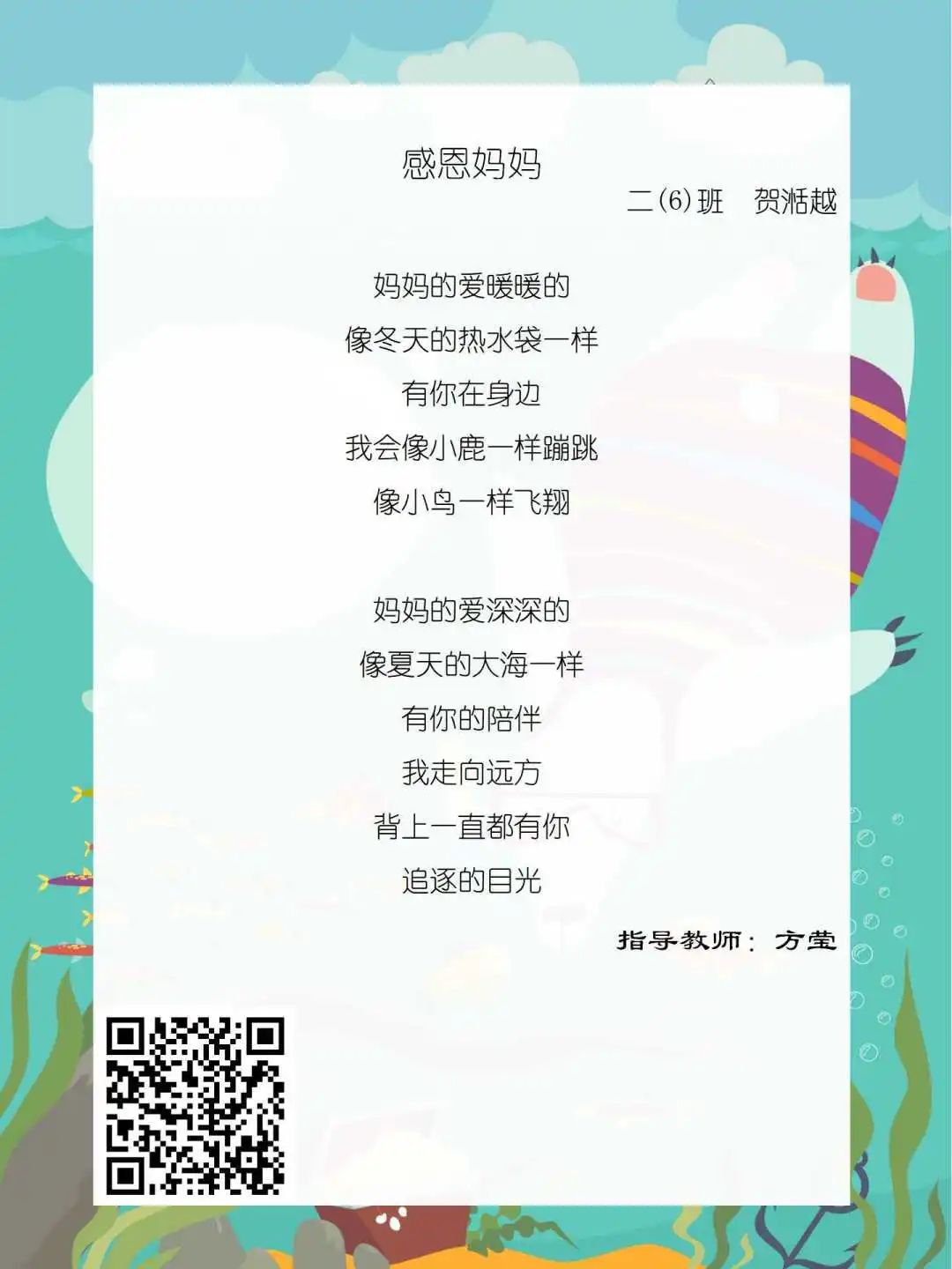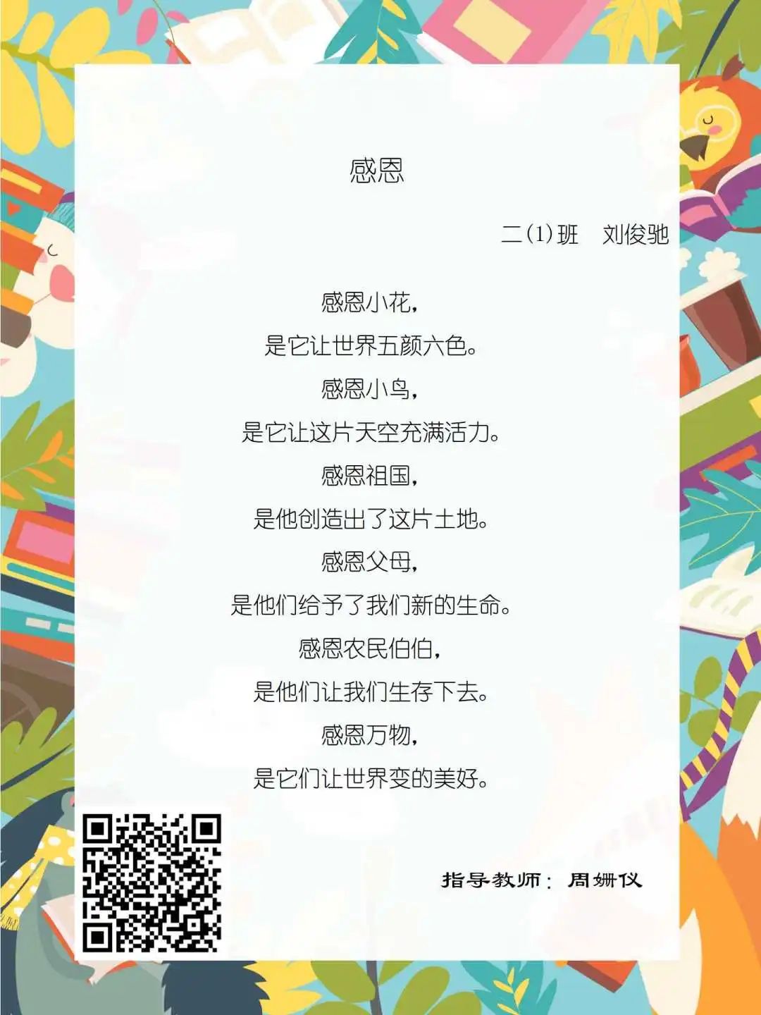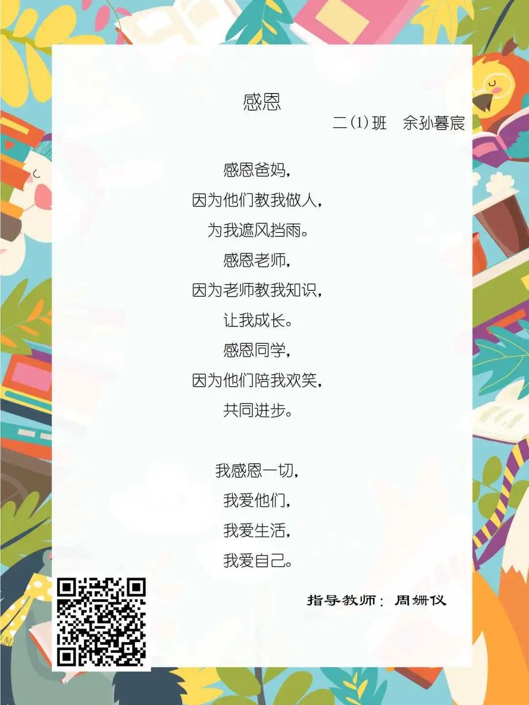 在学校领导的关心下,在下年级干部周晋羽老师和年级组长李秀念老师的带领下,在二年级老师和家长的共同努力下,孩子们用自己对感恩的理解,用文字承载深情厚意,把平时藏在心里感恩的话语,用真诚的小诗传达出来,展现他们内心最真挚的感恩之情!点开小诗左下方的二维码,还能听到小作者们情感充沛地朗诵!
