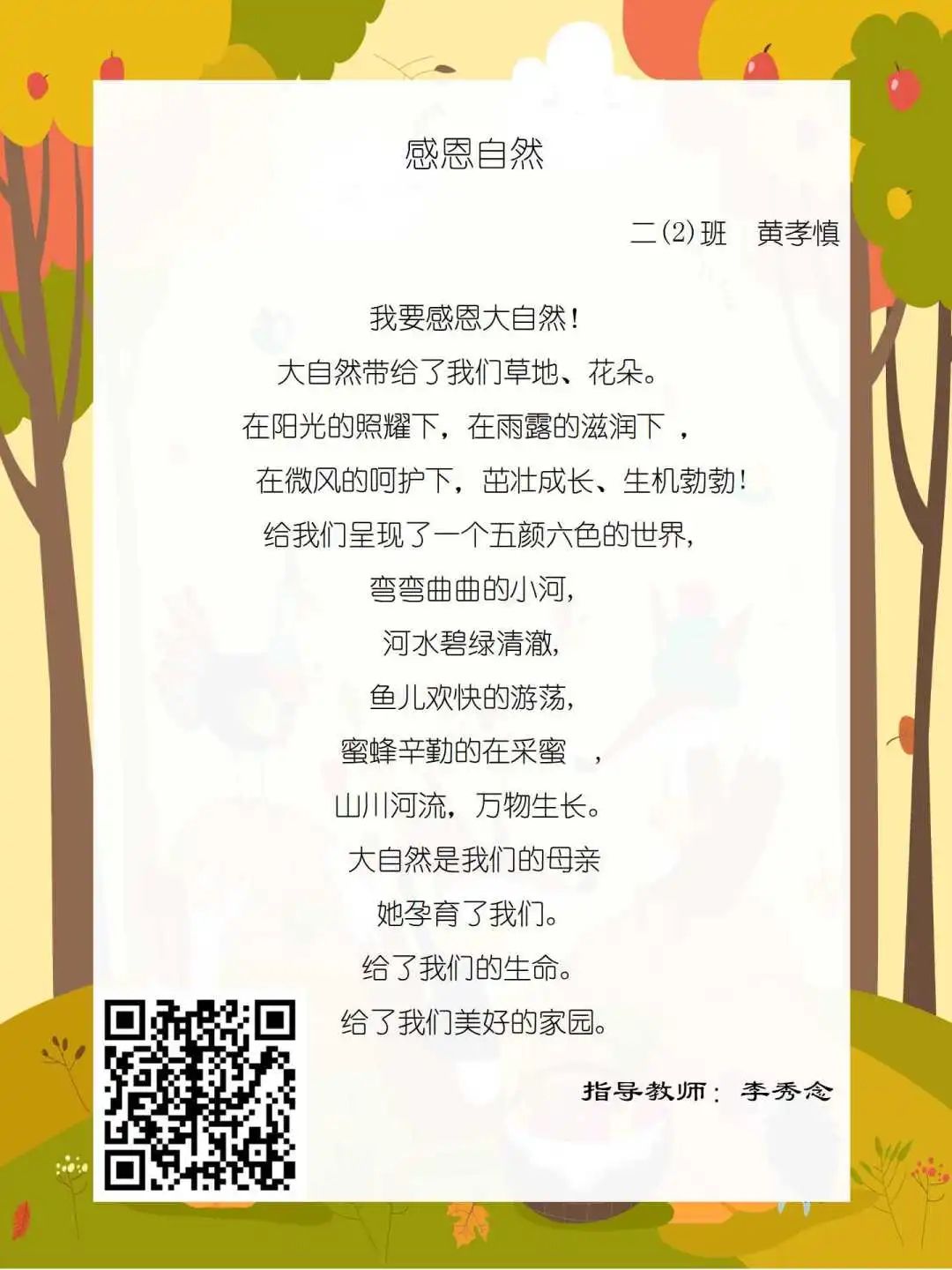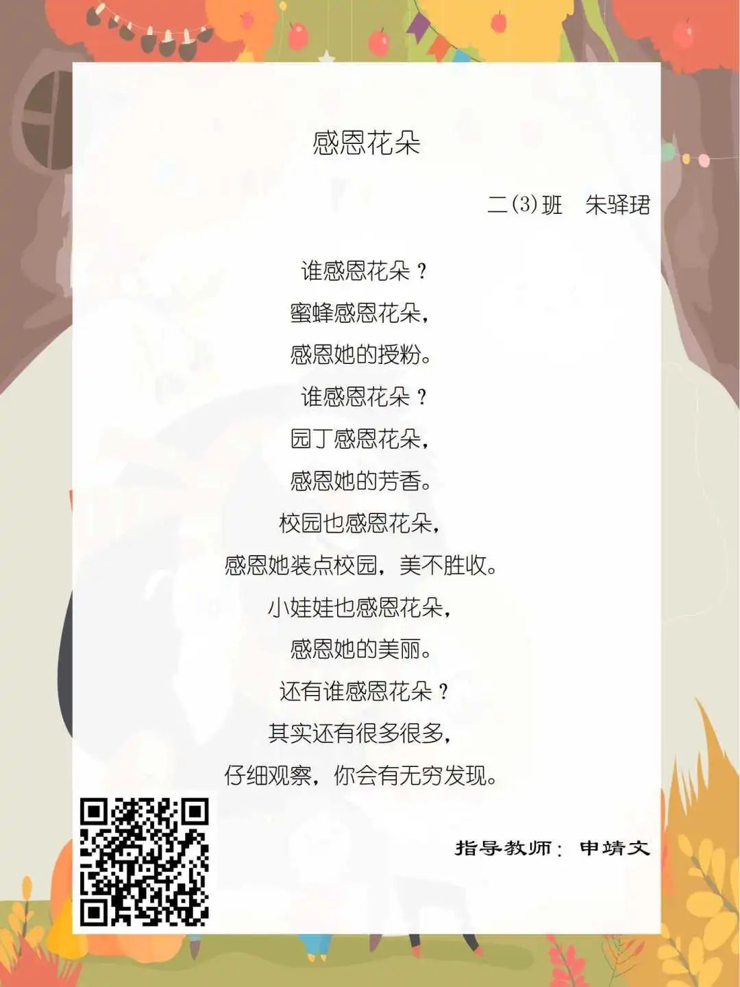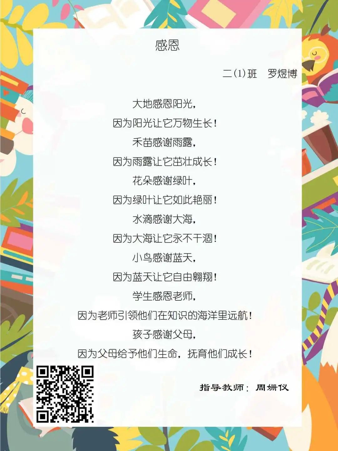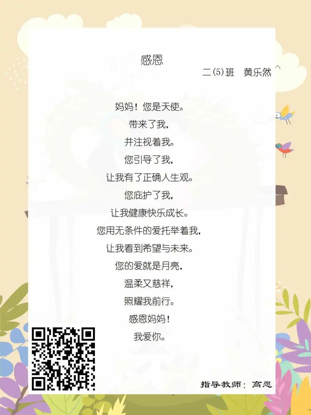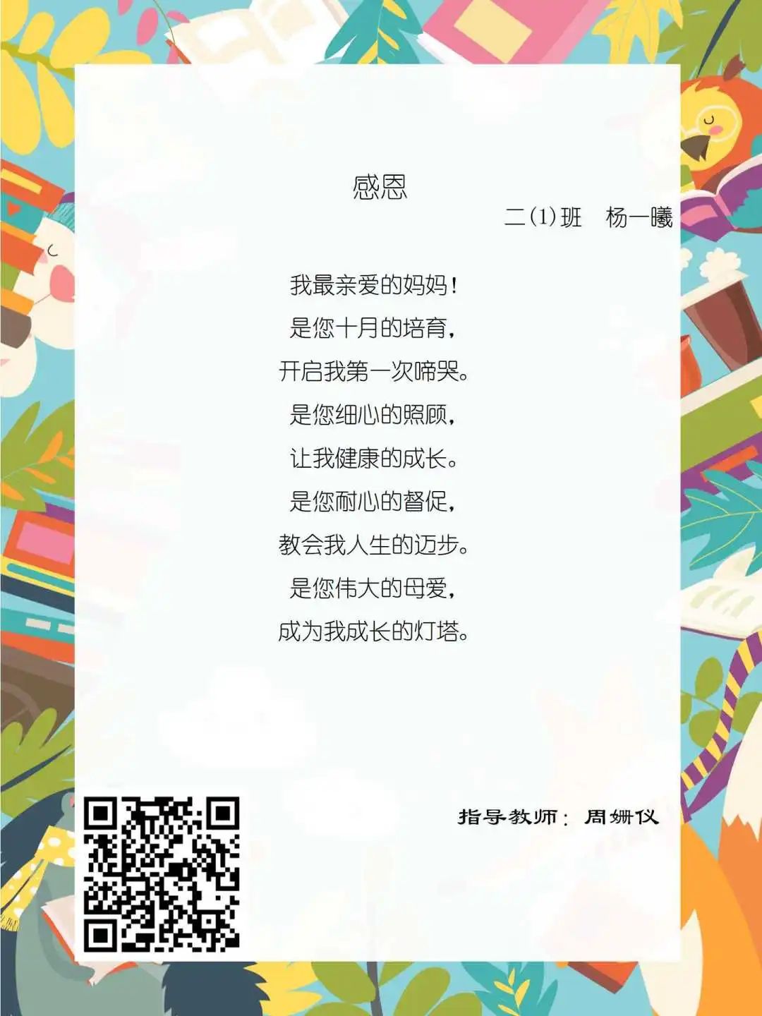 在学校领导的关心下,在下年级干部周晋羽老师和年级组长李秀念老师的带领下,在二年级老师和家长的共同努力下,孩子们用自己对感恩的理解,用文字承载深情厚意,把平时藏在心里感恩的话语,用真诚的小诗传达出来,展现他们内心最真挚的感恩之情!点开小诗左下方的二维码,还能听到小作者们情感充沛地朗诵!