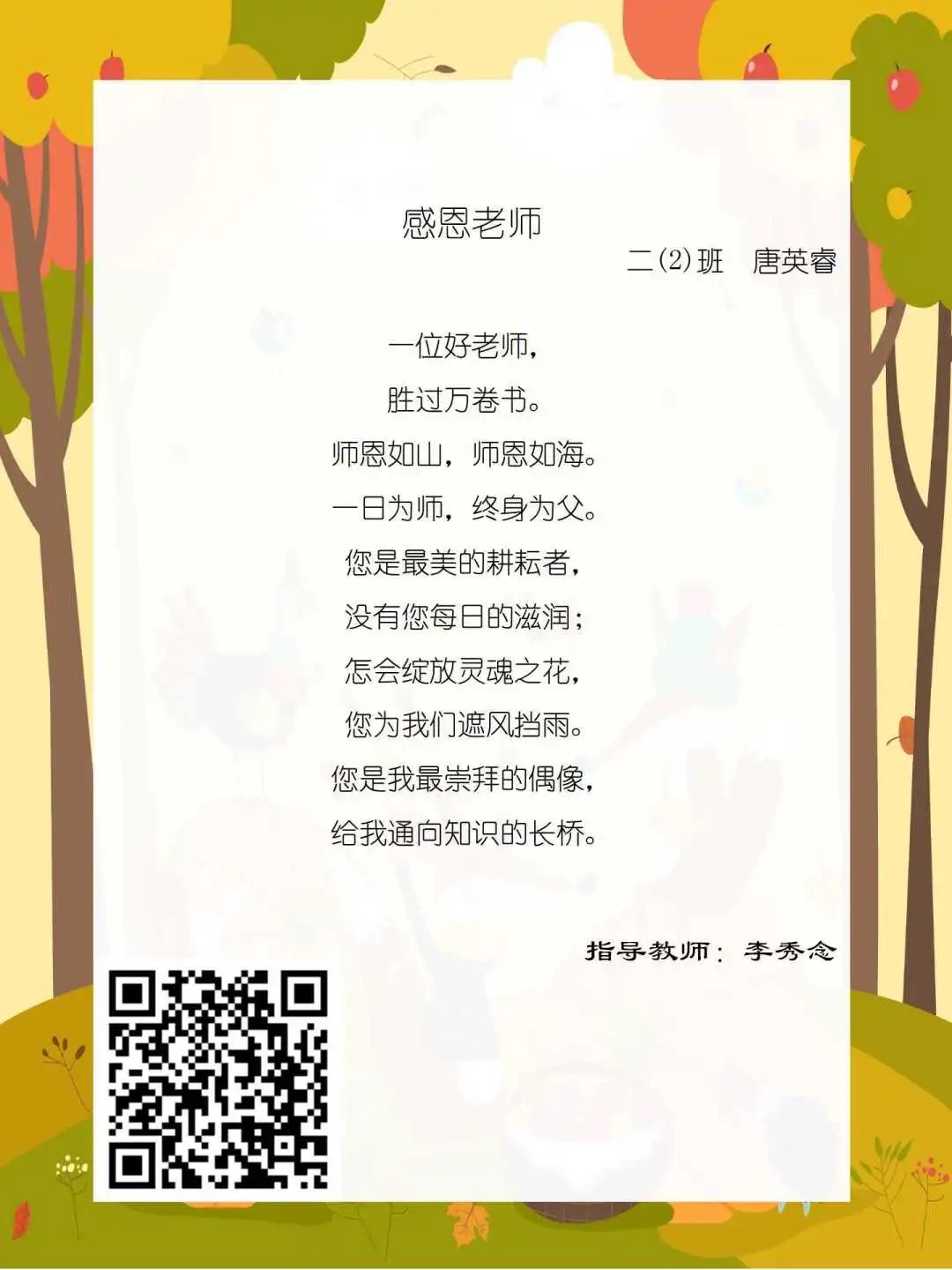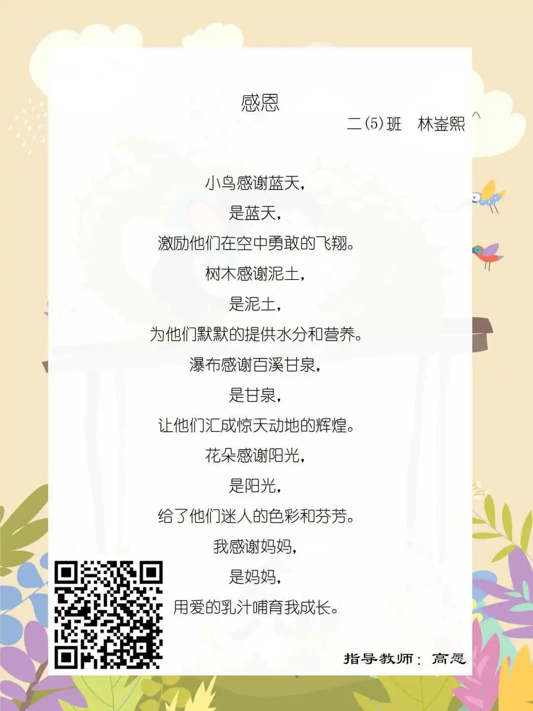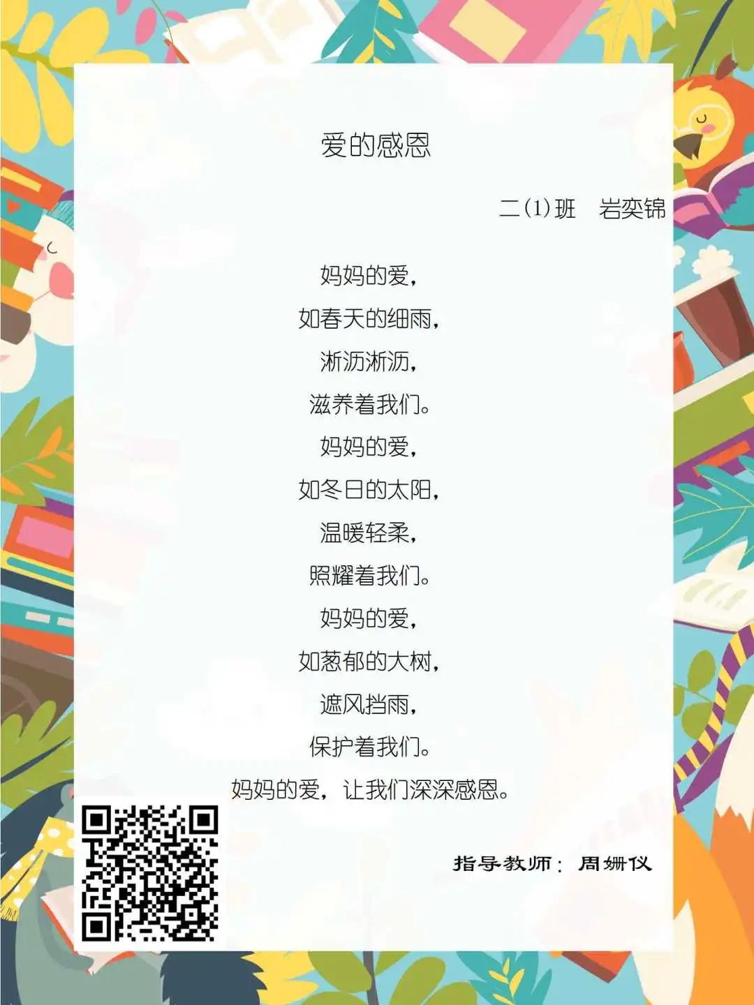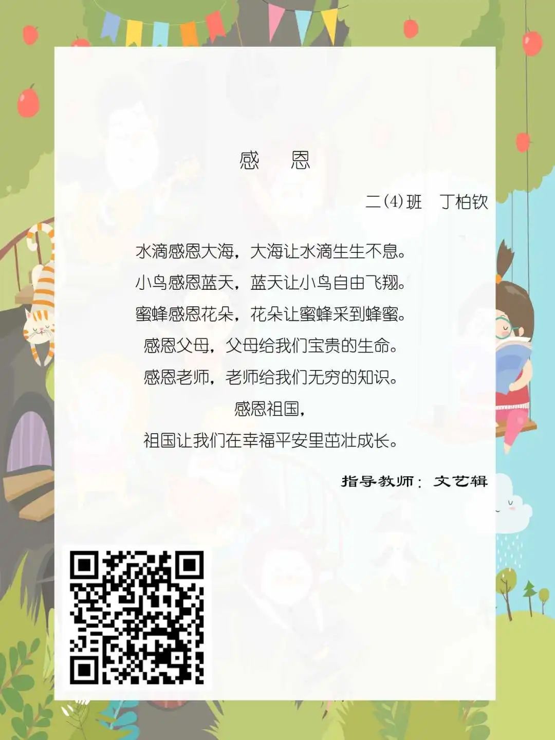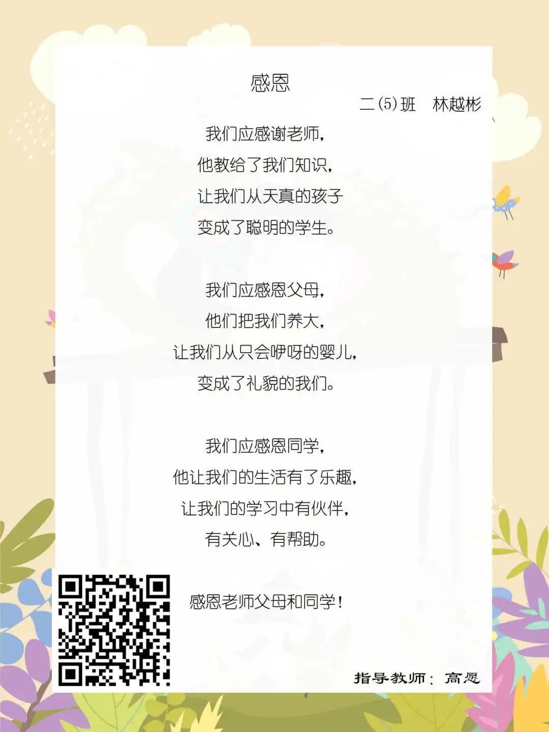 在学校领导的关心下,在下年级干部周晋羽老师和年级组长李秀念老师的带领下,在二年级老师和家长的共同努力下,孩子们用自己对感恩的理解,用文字承载深情厚意,把平时藏在心里感恩的话语,用真诚的小诗传达出来,展现他们内心最真挚的感恩之情!点开小诗左下方的二维码,还能听到小作者们情感充沛地朗诵!
