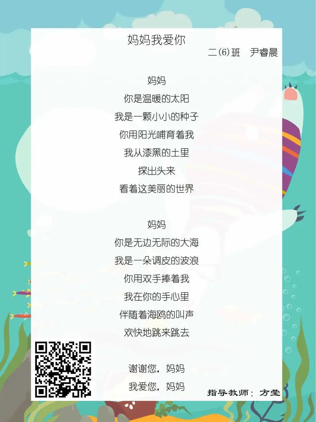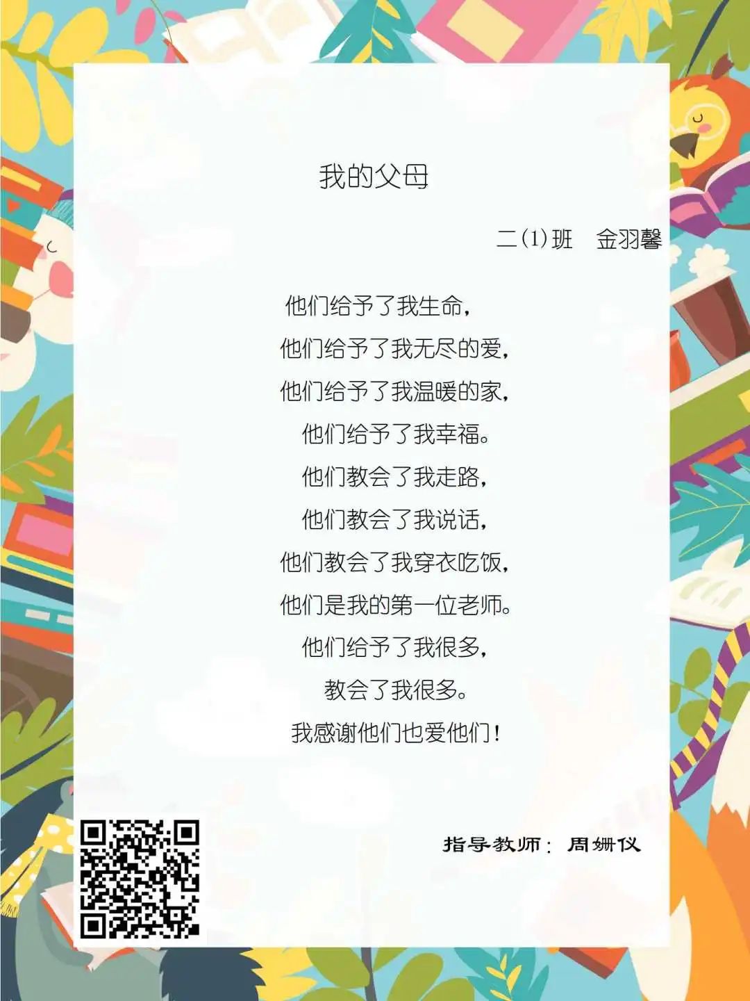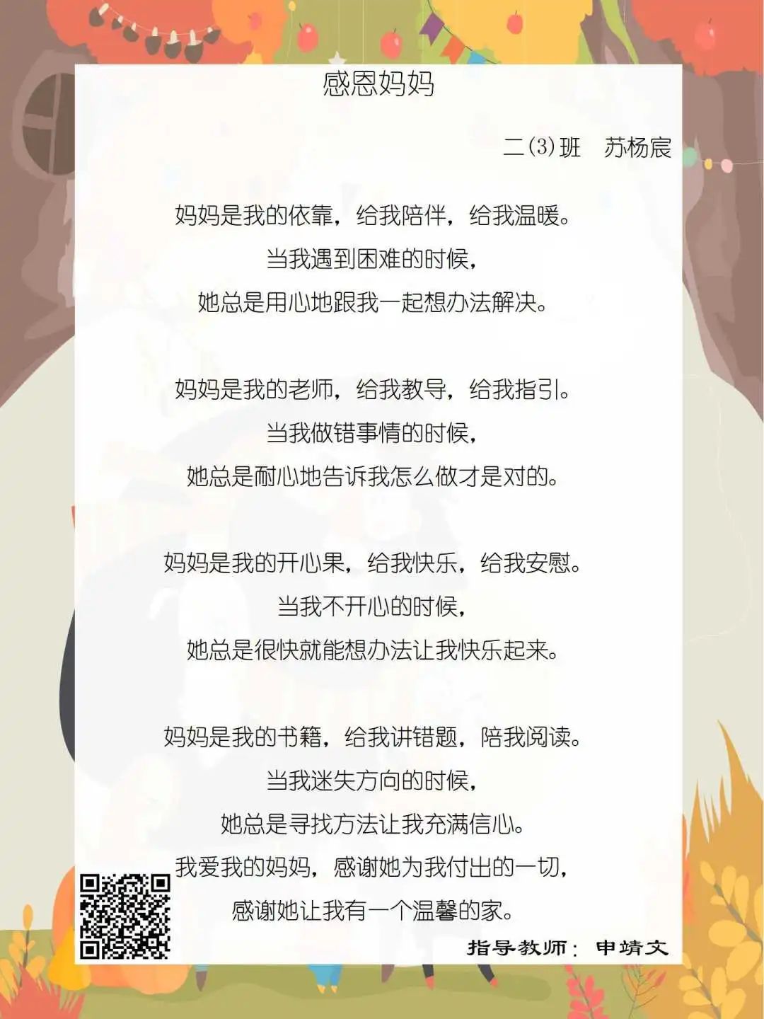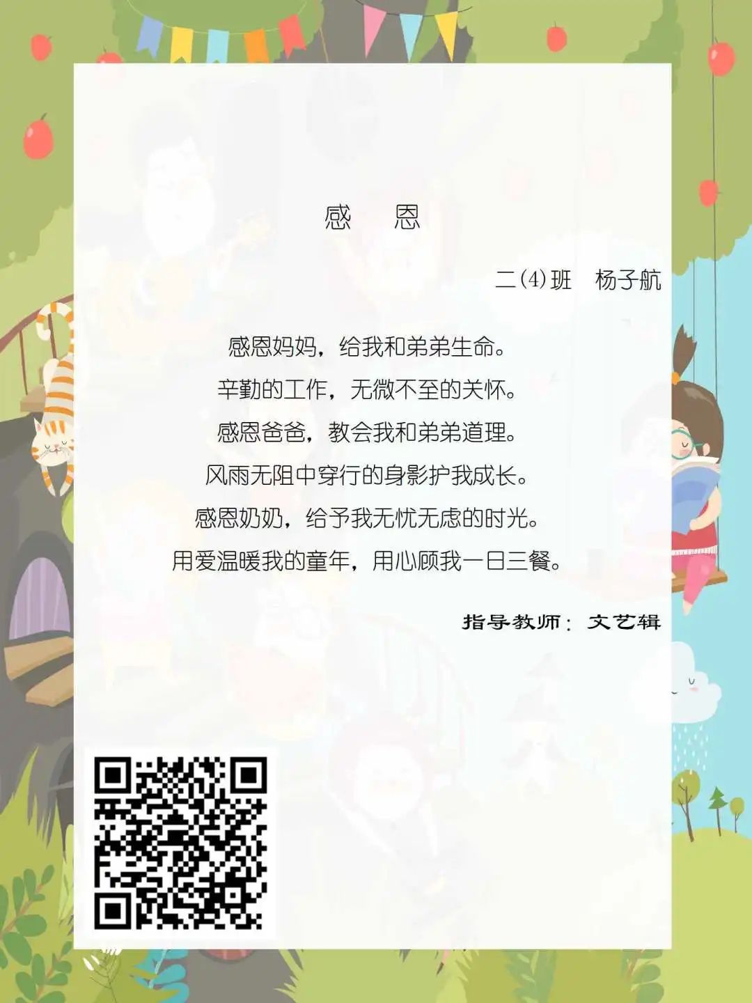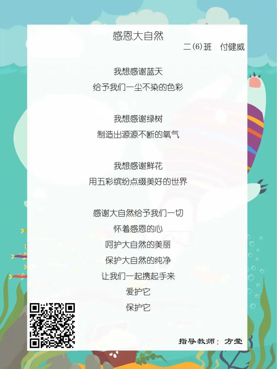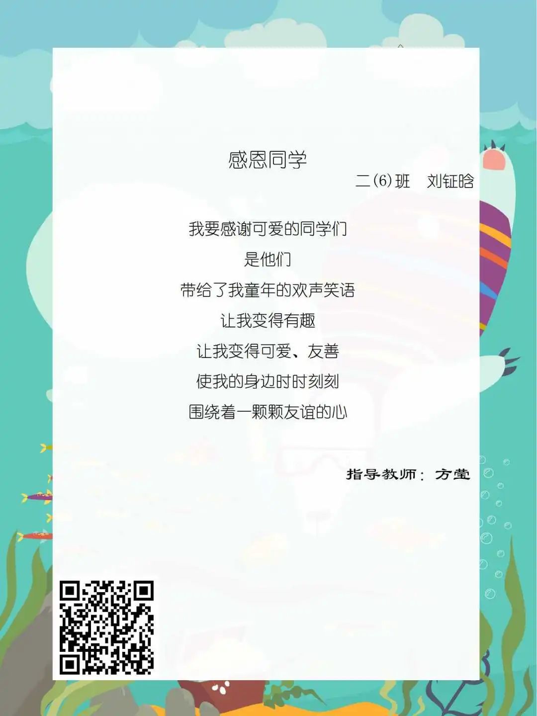 在学校领导的关心下,在下年级干部周晋羽老师和年级组长李秀念老师的带领下,在二年级老师和家长的共同努力下,孩子们用自己对感恩的理解,用文字承载深情厚意,把平时藏在心里感恩的话语,用真诚的小诗传达出来,展现他们内心最真挚的感恩之情!点开小诗左下方的二维码,还能听到小作者们情感充沛地朗诵!