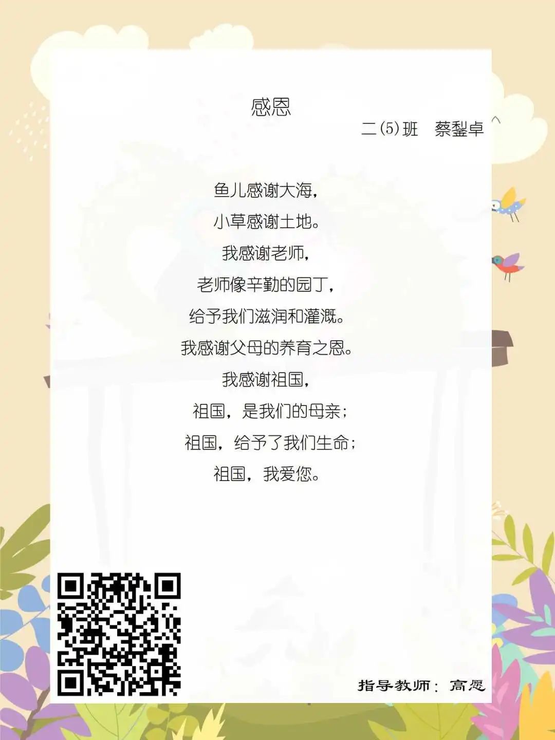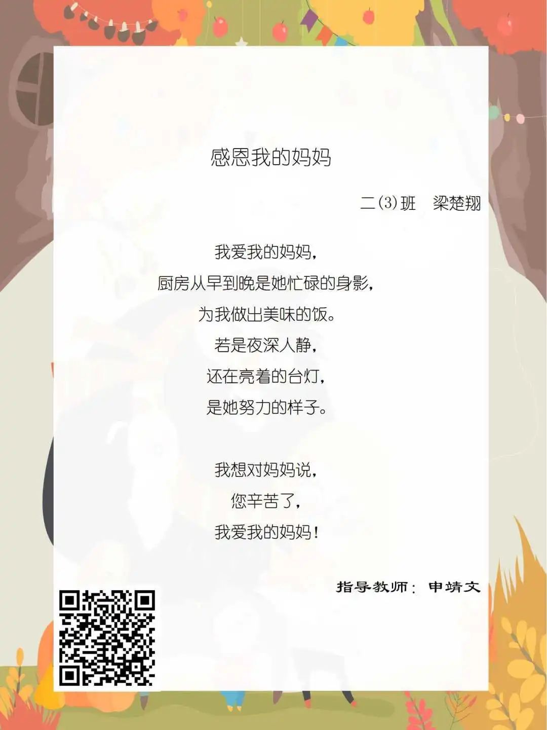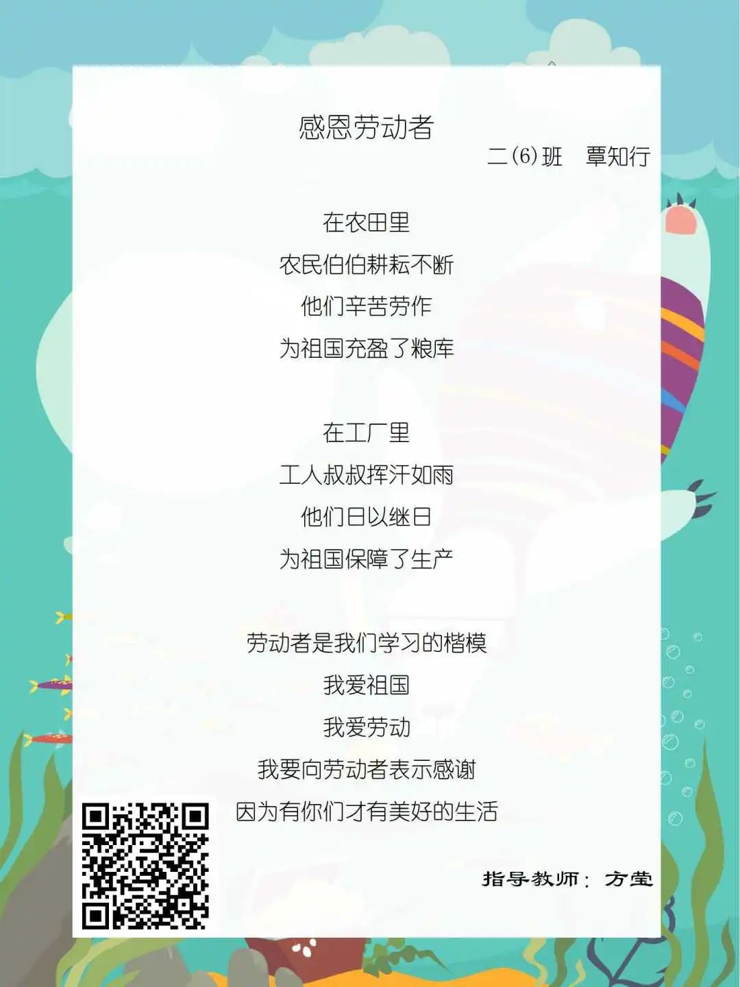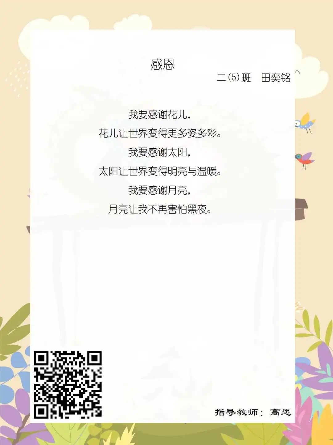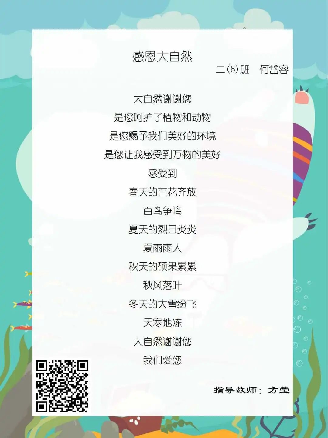 在学校领导的关心下,在下年级干部周晋羽老师和年级组长李秀念老师的带领下,在二年级老师和家长的共同努力下,孩子们用自己对感恩的理解,用文字承载深情厚意,把平时藏在心里感恩的话语,用真诚的小诗传达出来,展现他们内心最真挚的感恩之情!点开小诗左下方的二维码,还能听到小作者们情感充沛地朗诵!