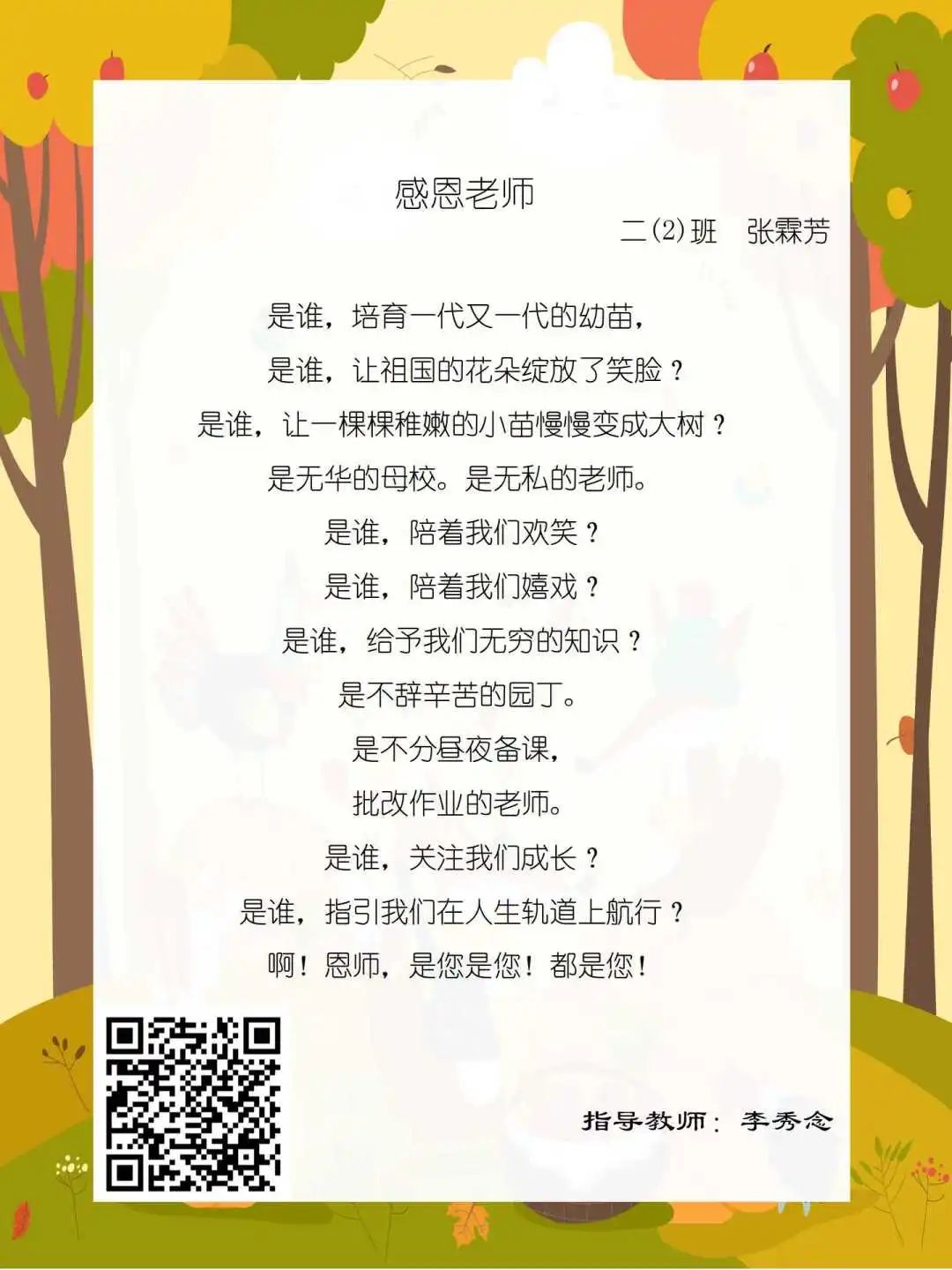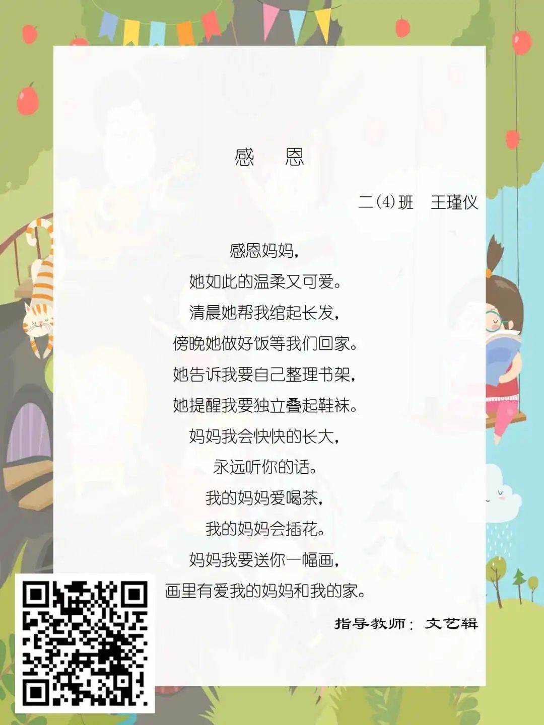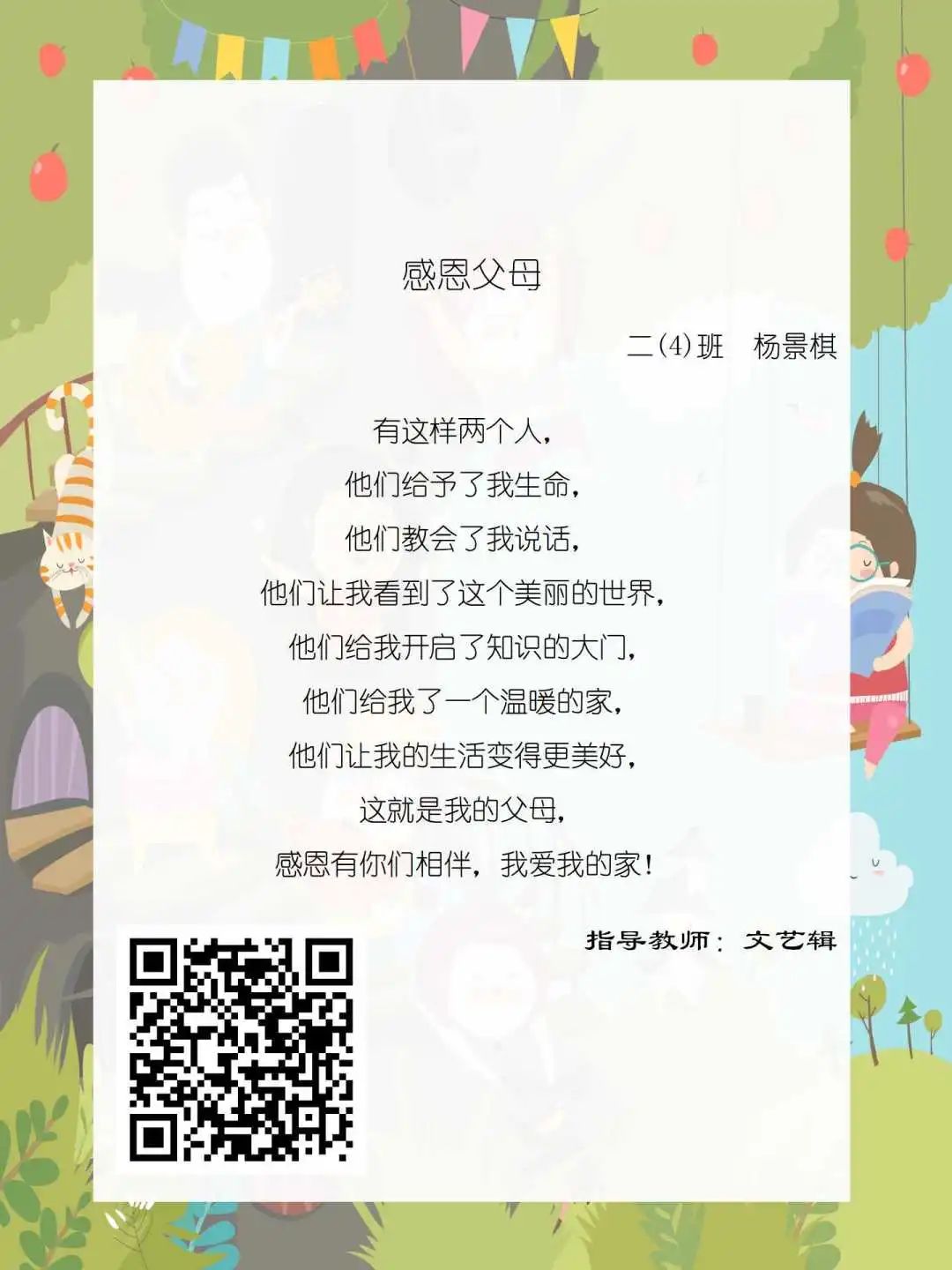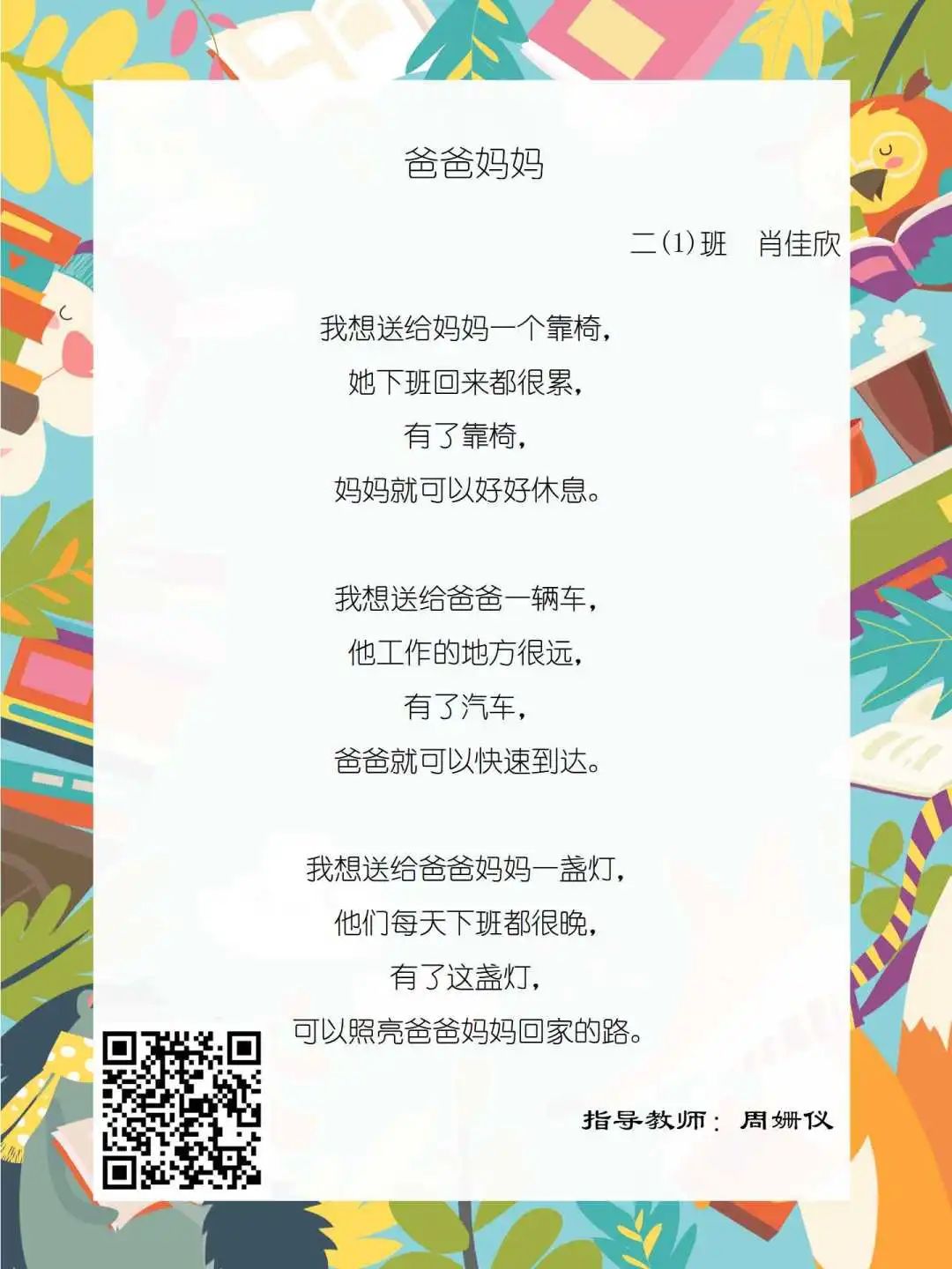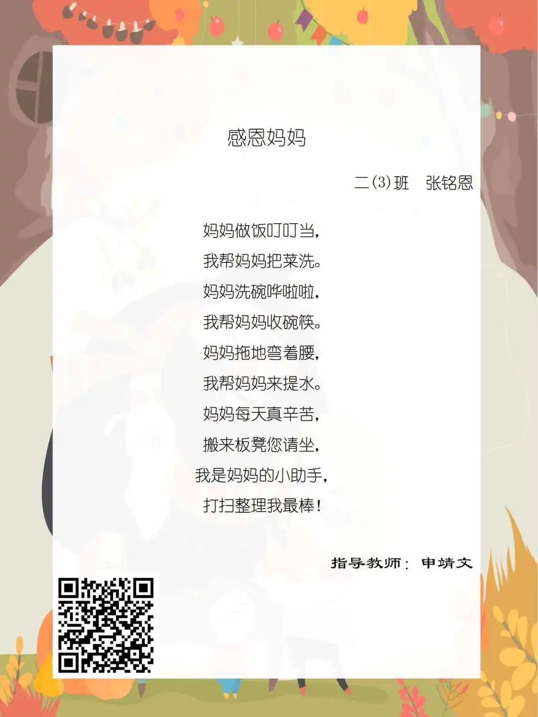 在学校领导的关心下,在下年级干部周晋羽老师和年级组长李秀念老师的带领下,在二年级老师和家长的共同努力下,孩子们用自己对感恩的理解,用文字承载深情厚意,把平时藏在心里感恩的话语,用真诚的小诗传达出来,展现他们内心最真挚的感恩之情!点开小诗左下方的二维码,还能听到小作者们情感充沛地朗诵!