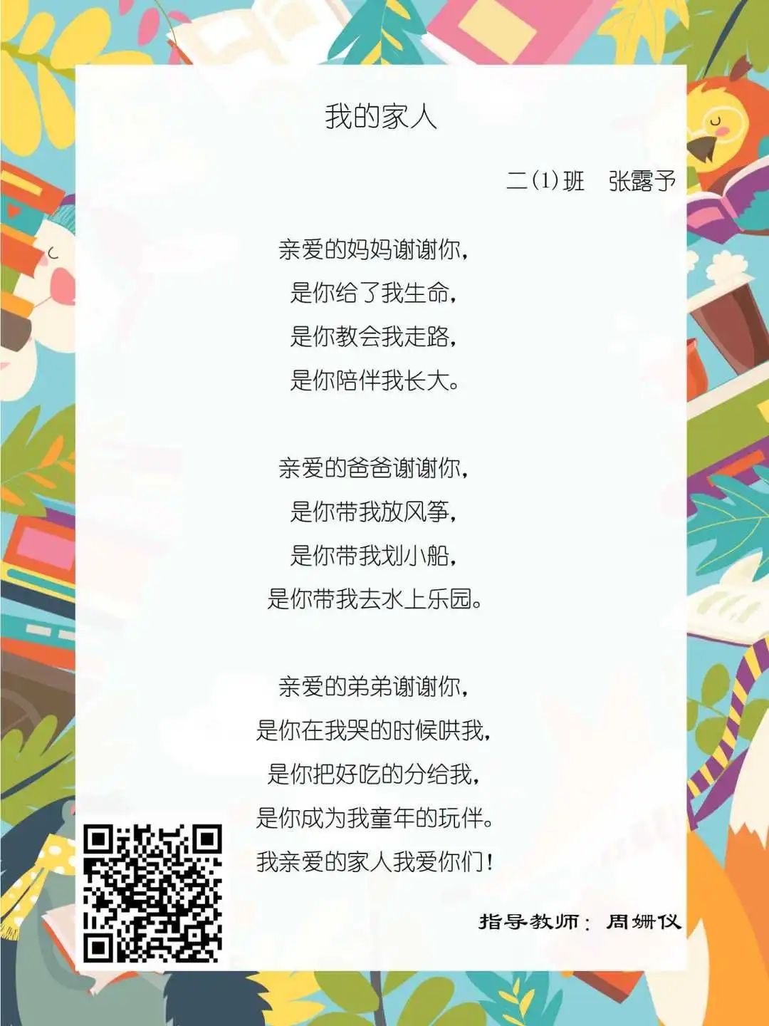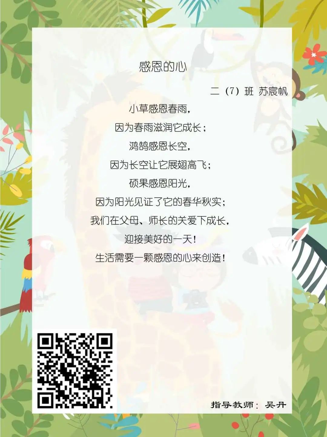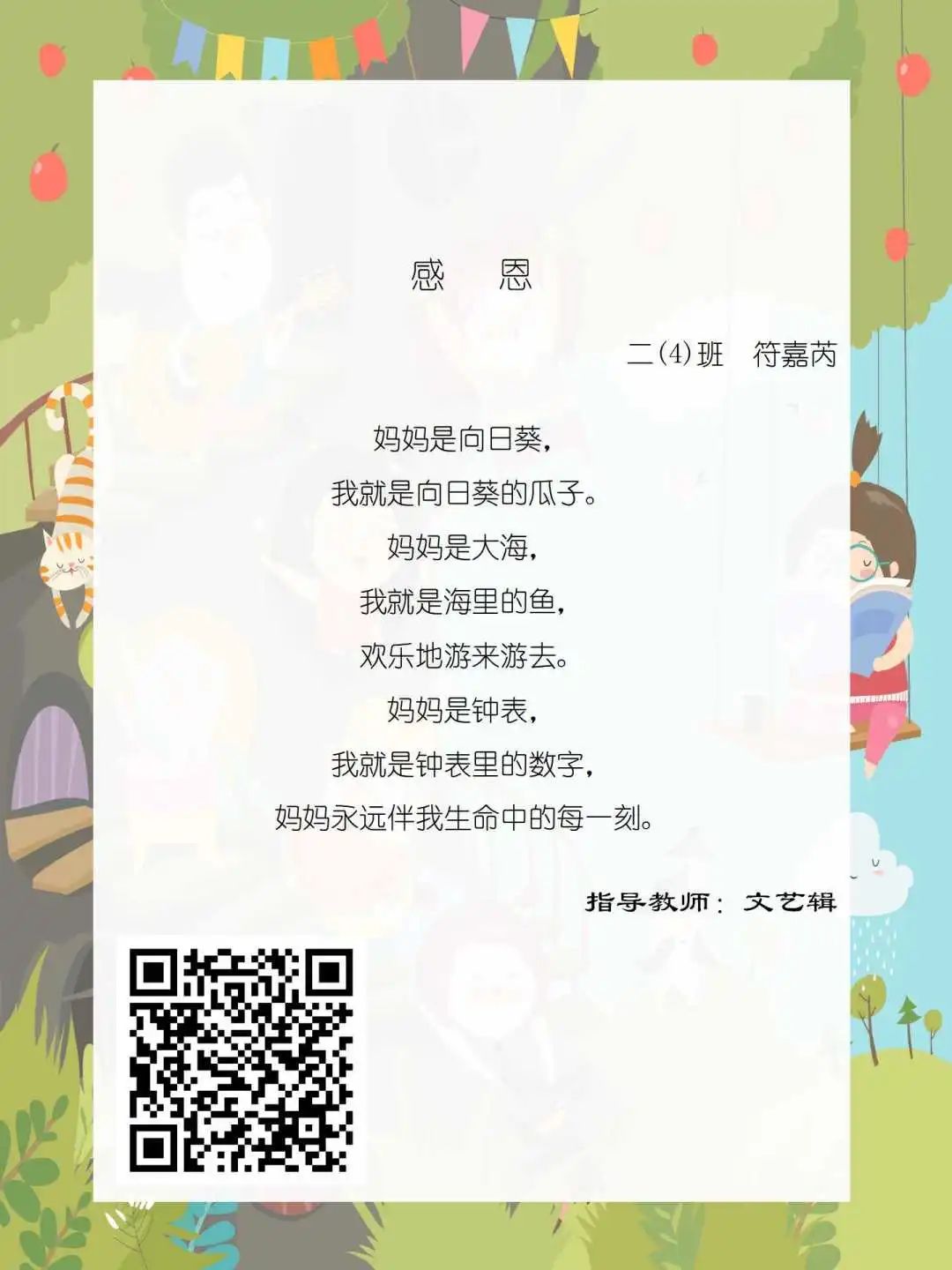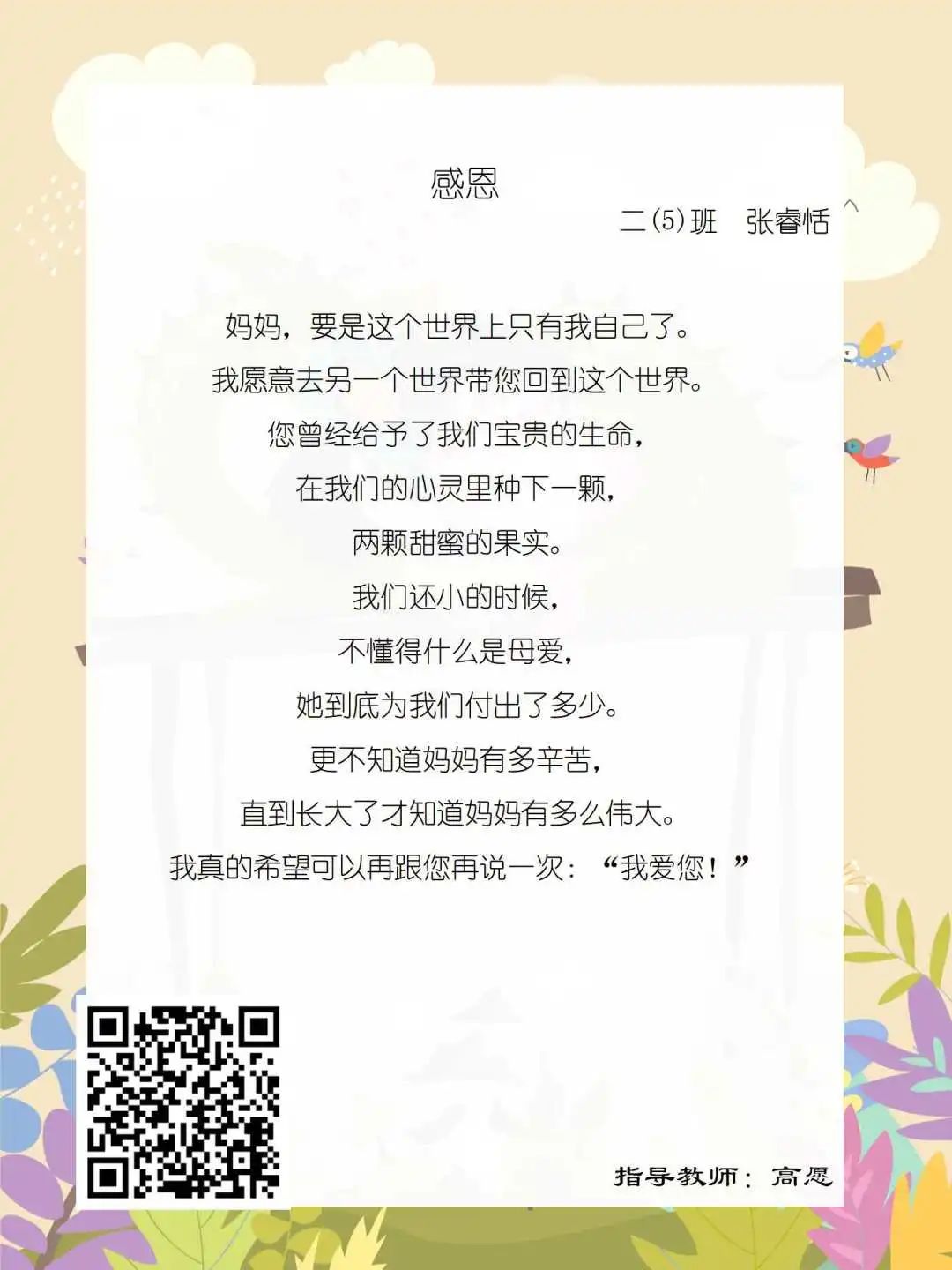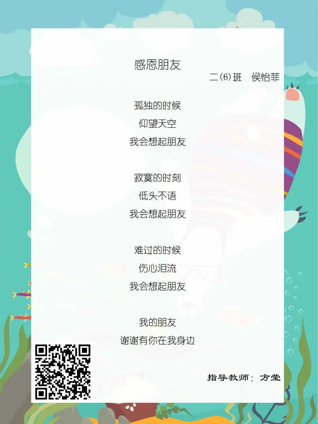 在学校领导的关心下,在下年级干部周晋羽老师和年级组长李秀念老师的带领下,在二年级老师和家长的共同努力下,孩子们用自己对感恩的理解,用文字承载深情厚意,把平时藏在心里感恩的话语,用真诚的小诗传达出来,展现他们内心最真挚的感恩之情!点开小诗左下方的二维码,还能听到小作者们情感充沛地朗诵!