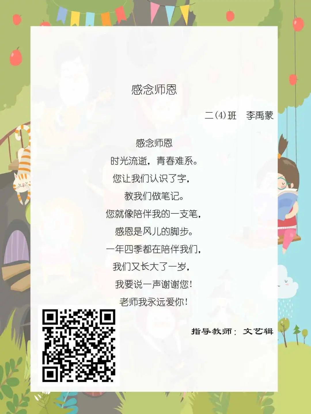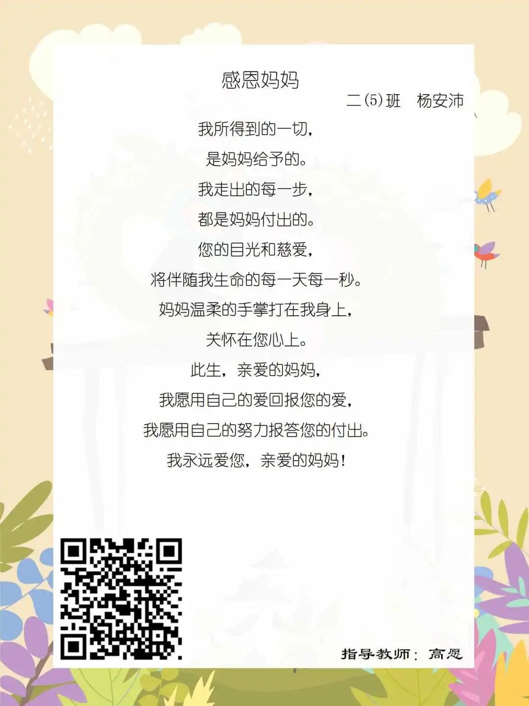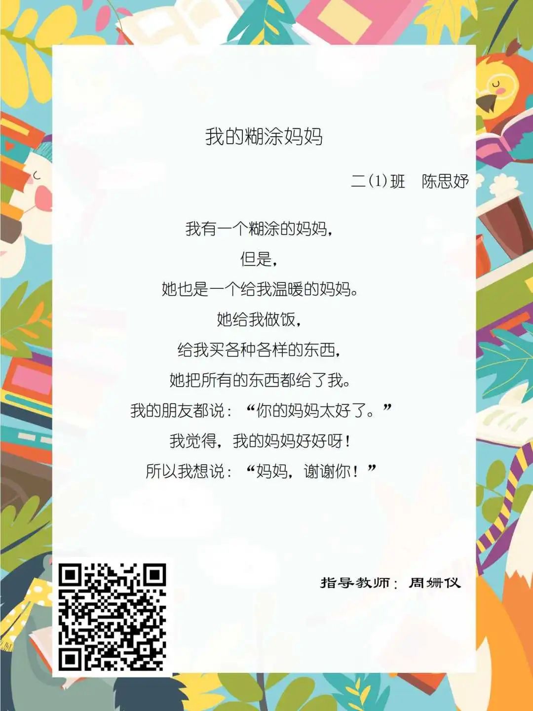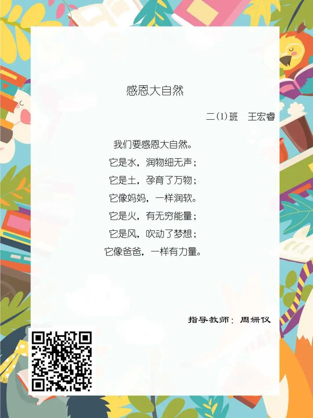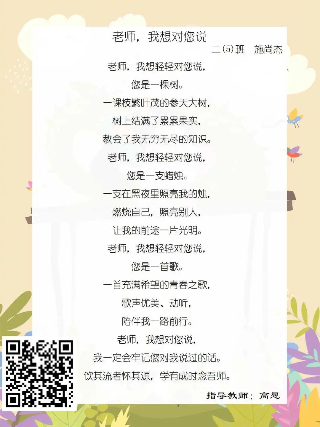 在学校领导的关心下,在下年级干部周晋羽老师和年级组长李秀念老师的带领下,在二年级老师和家长的共同努力下,孩子们用自己对感恩的理解,用文字承载深情厚意,把平时藏在心里感恩的话语,用真诚的小诗传达出来,展现他们内心最真挚的感恩之情!点开小诗左下方的二维码,还能听到小作者们情感充沛地朗诵!