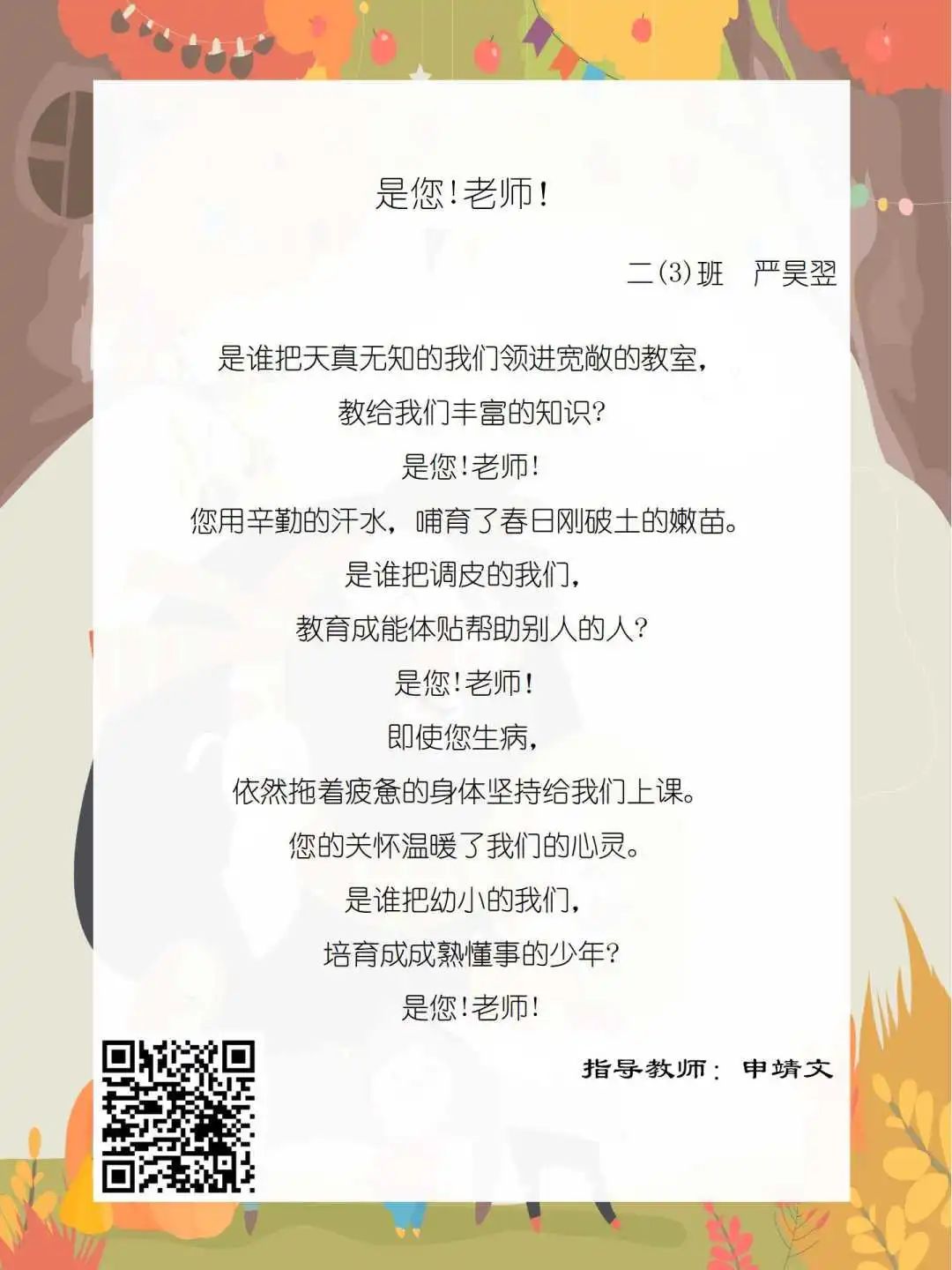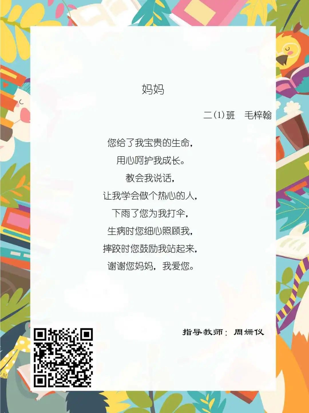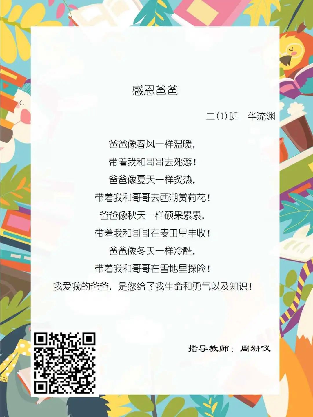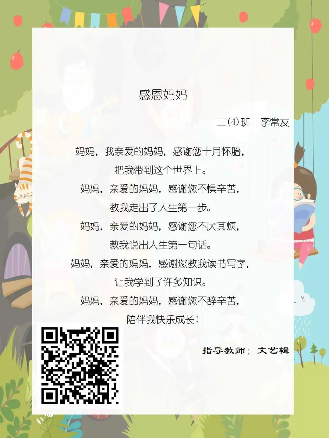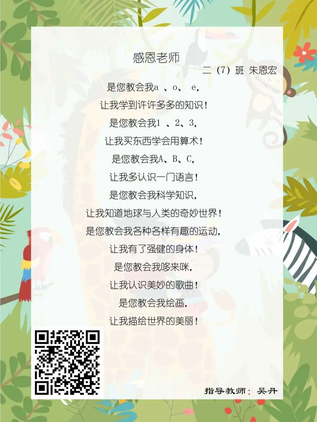 在学校领导的关心下,在下年级干部周晋羽老师和年级组长李秀念老师的带领下,在二年级老师和家长的共同努力下,孩子们用自己对感恩的理解,用文字承载深情厚意,把平时藏在心里感恩的话语,用真诚的小诗传达出来,展现他们内心最真挚的感恩之情!点开小诗左下方的二维码,还能听到小作者们情感充沛地朗诵!
