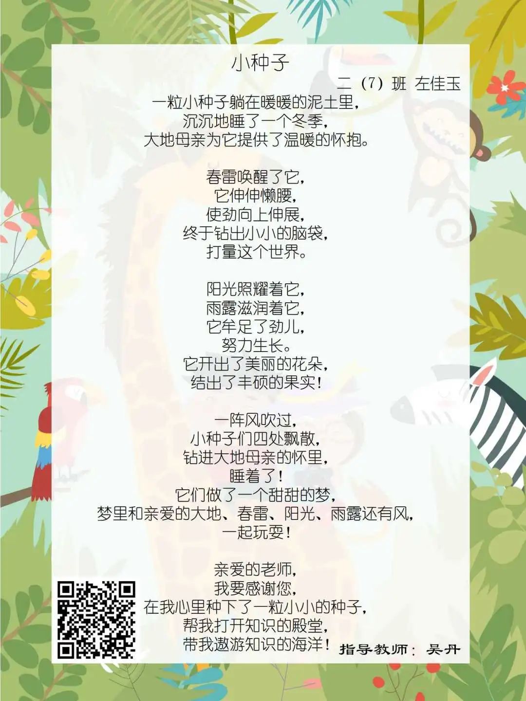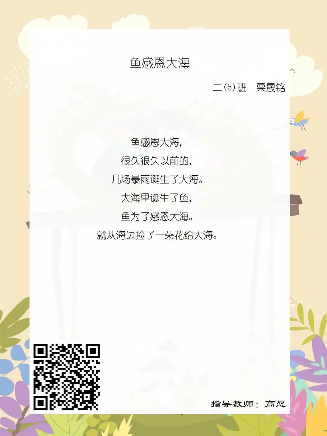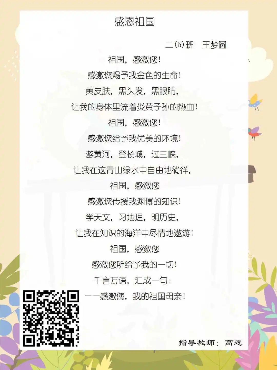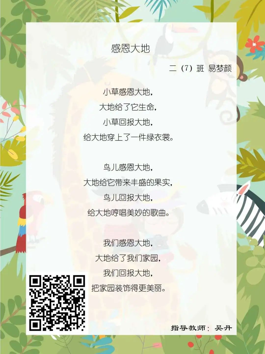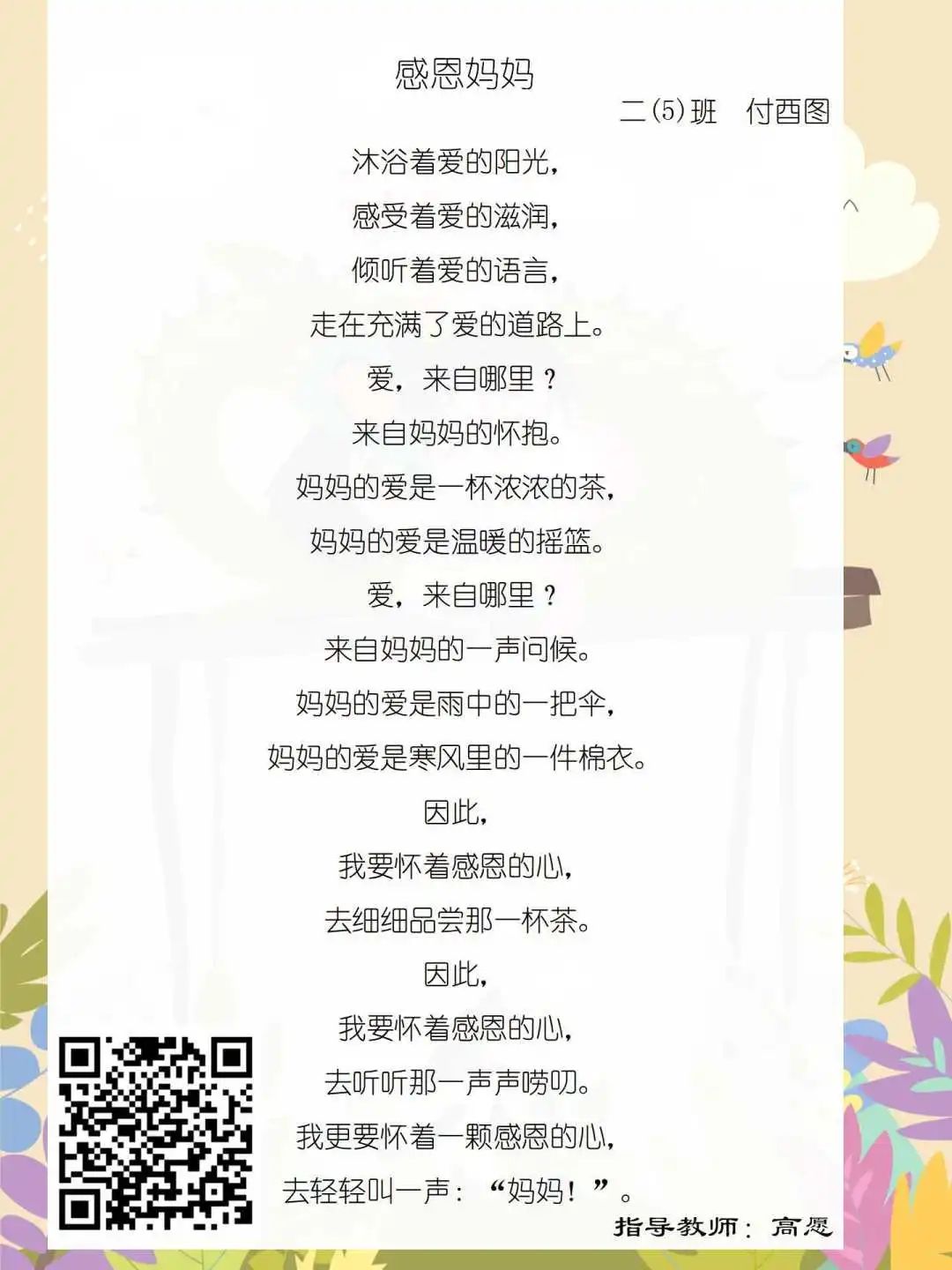 在学校领导的关心下,在下年级干部周晋羽老师和年级组长李秀念老师的带领下,在二年级老师和家长的共同努力下,孩子们用自己对感恩的理解,用文字承载深情厚意,把平时藏在心里感恩的话语,用真诚的小诗传达出来,展现他们内心最真挚的感恩之情!点开小诗左下方的二维码,还能听到小作者们情感充沛地朗诵!