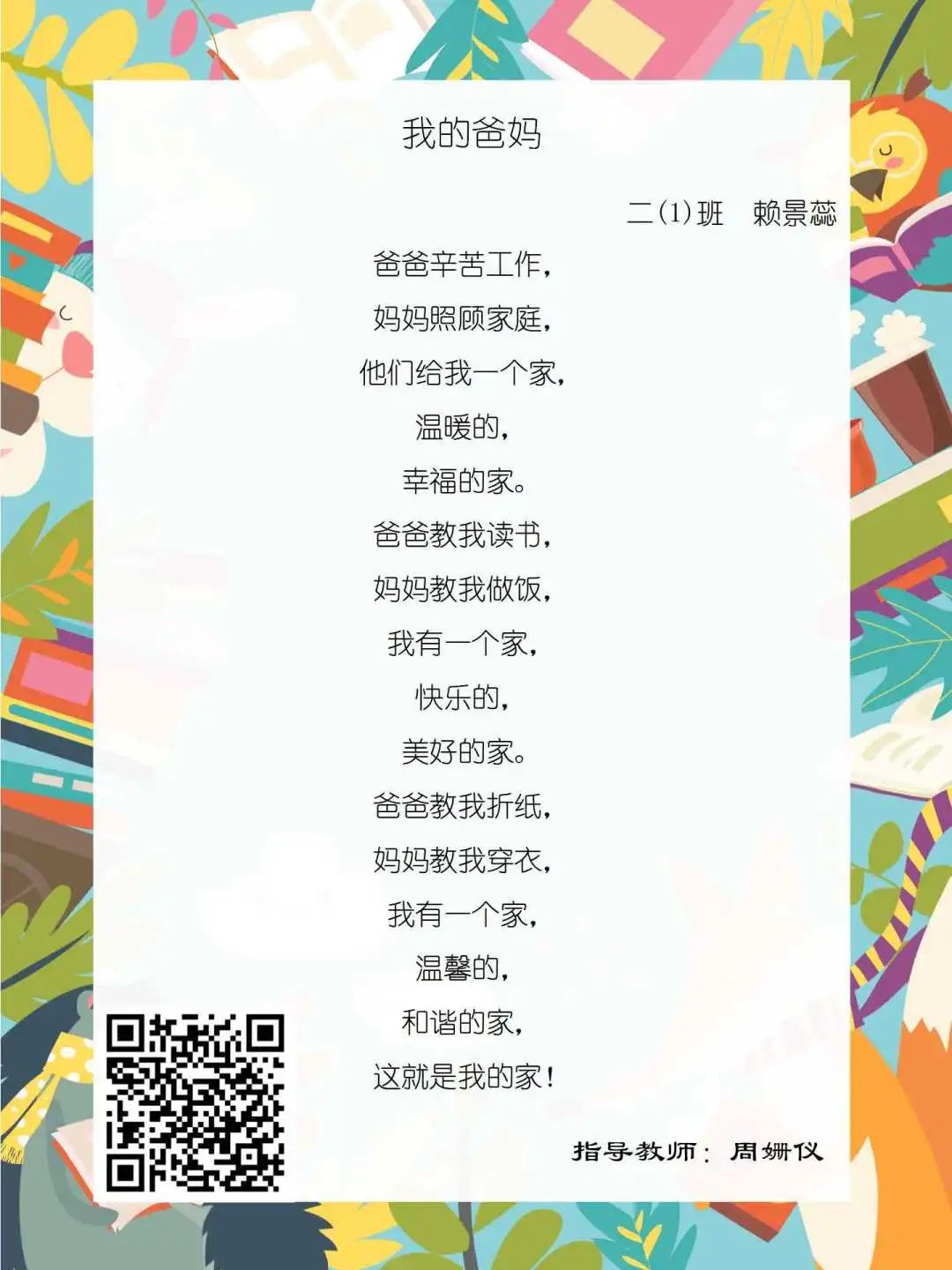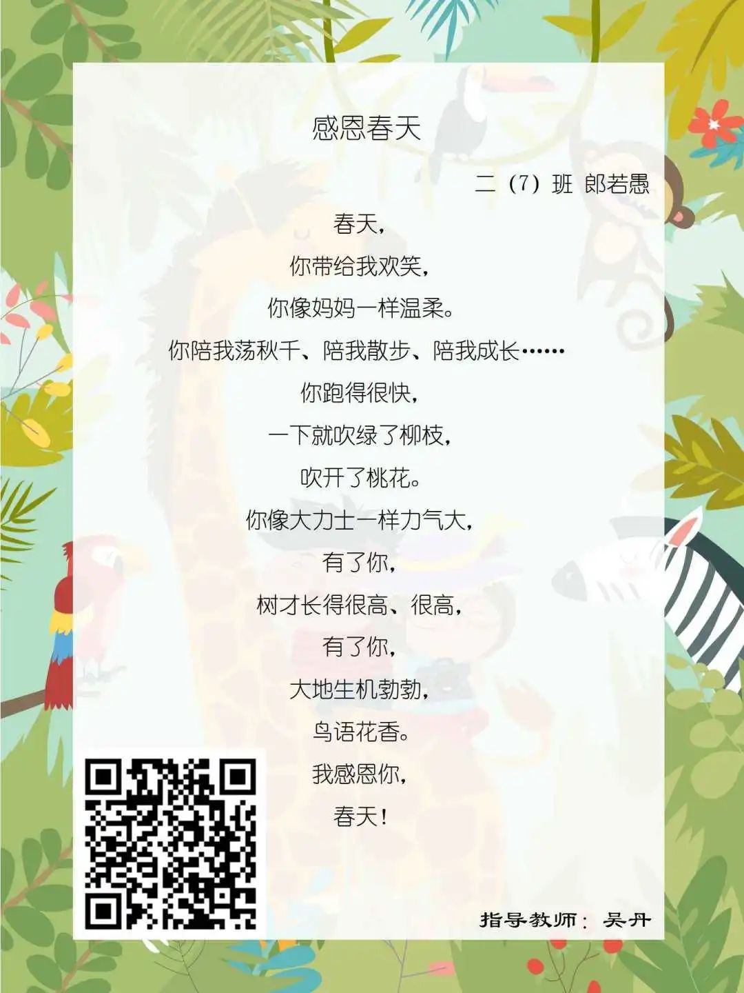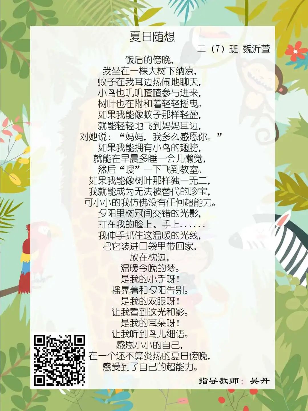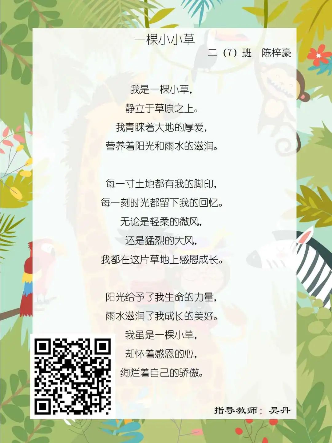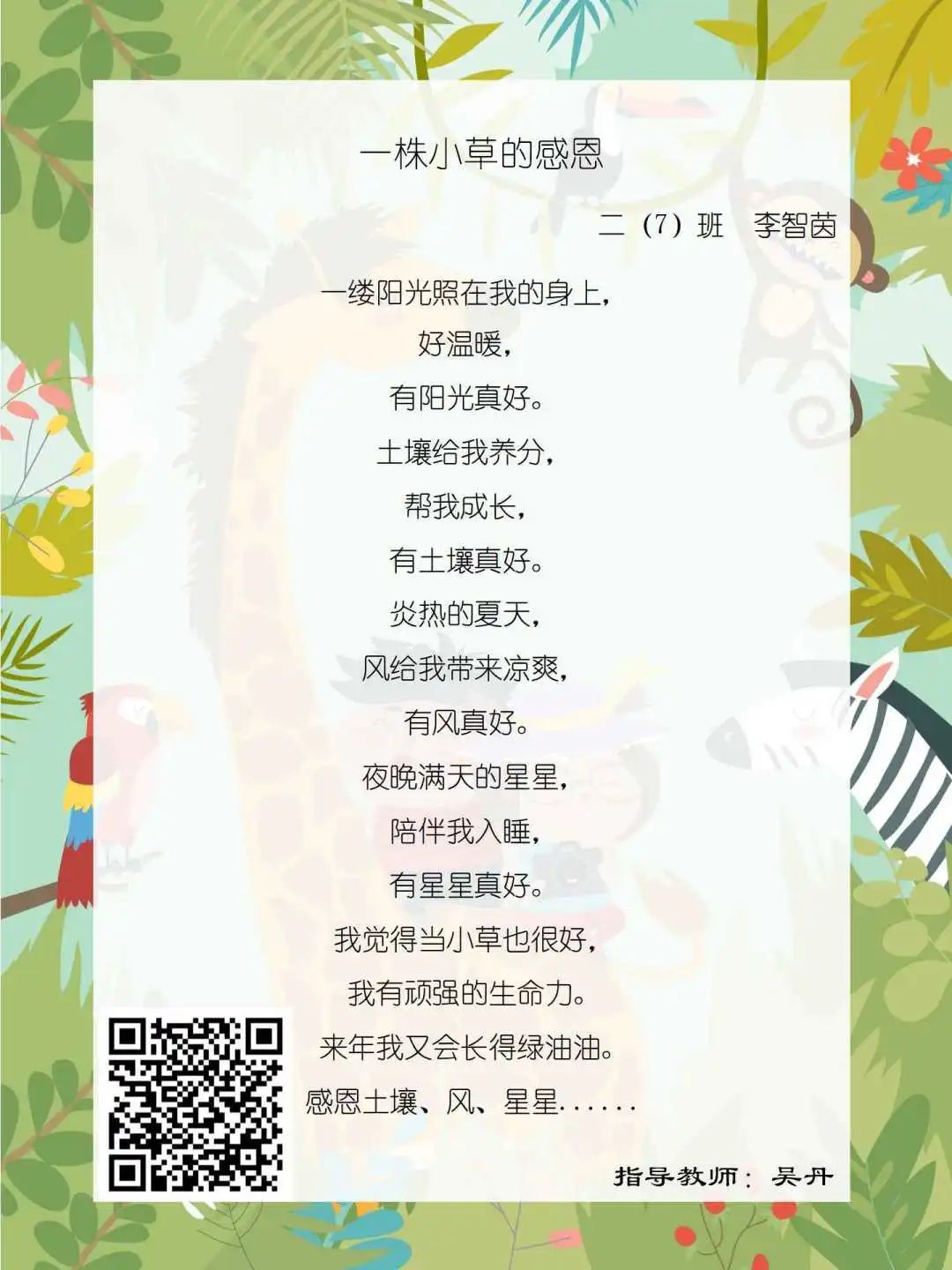 在学校领导的关心下,在下年级干部周晋羽老师和年级组长李秀念老师的带领下,在二年级老师和家长的共同努力下,孩子们用自己对感恩的理解,用文字承载深情厚意,把平时藏在心里感恩的话语,用真诚的小诗传达出来,展现他们内心最真挚的感恩之情!点开小诗左下方的二维码,还能听到小作者们情感充沛地朗诵!