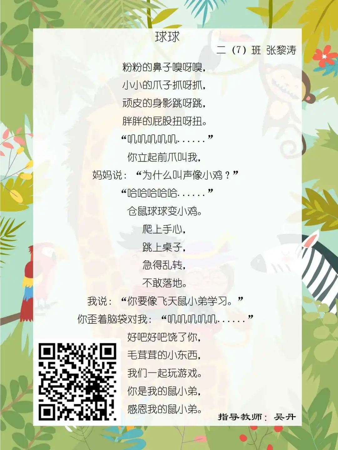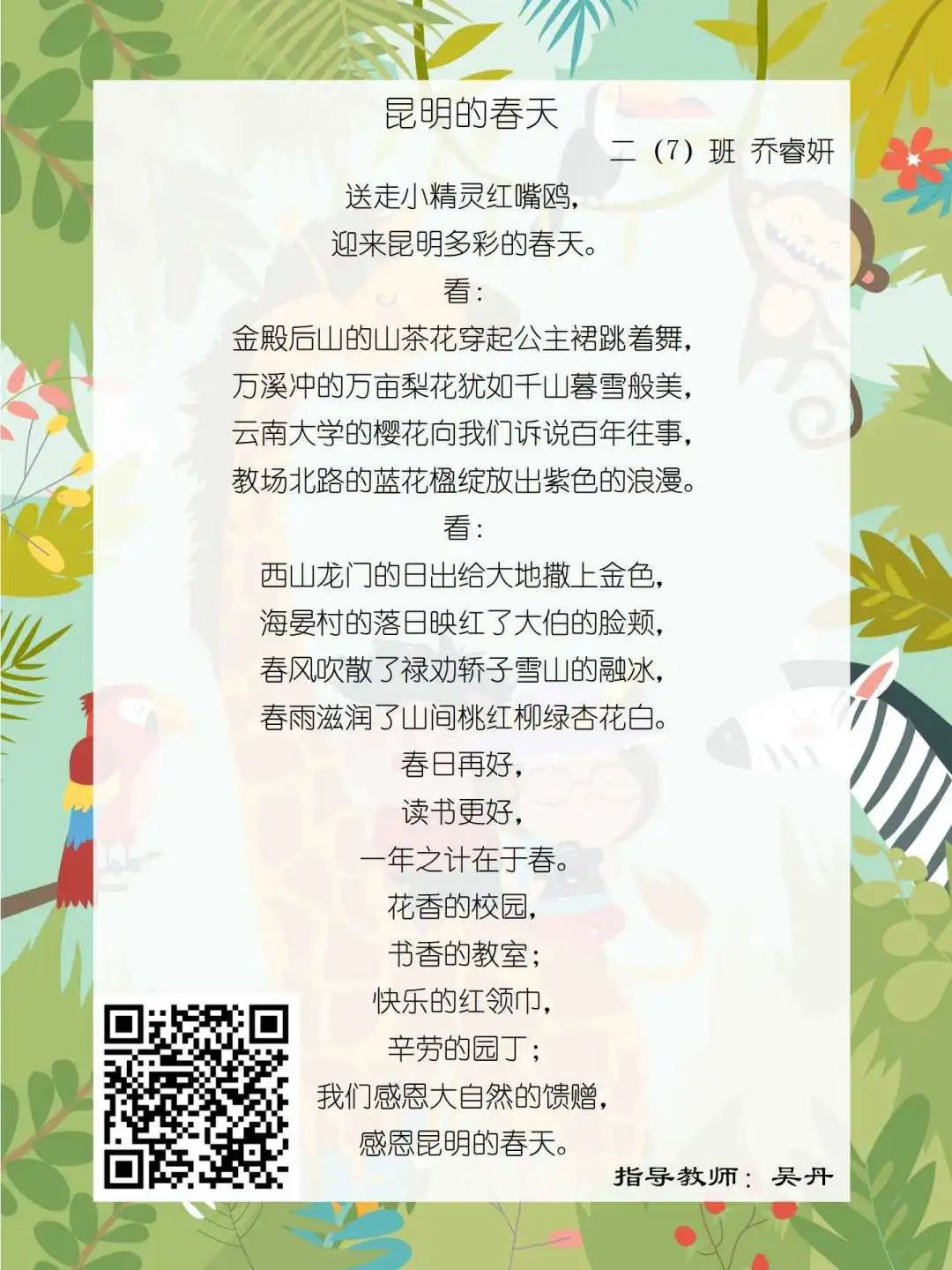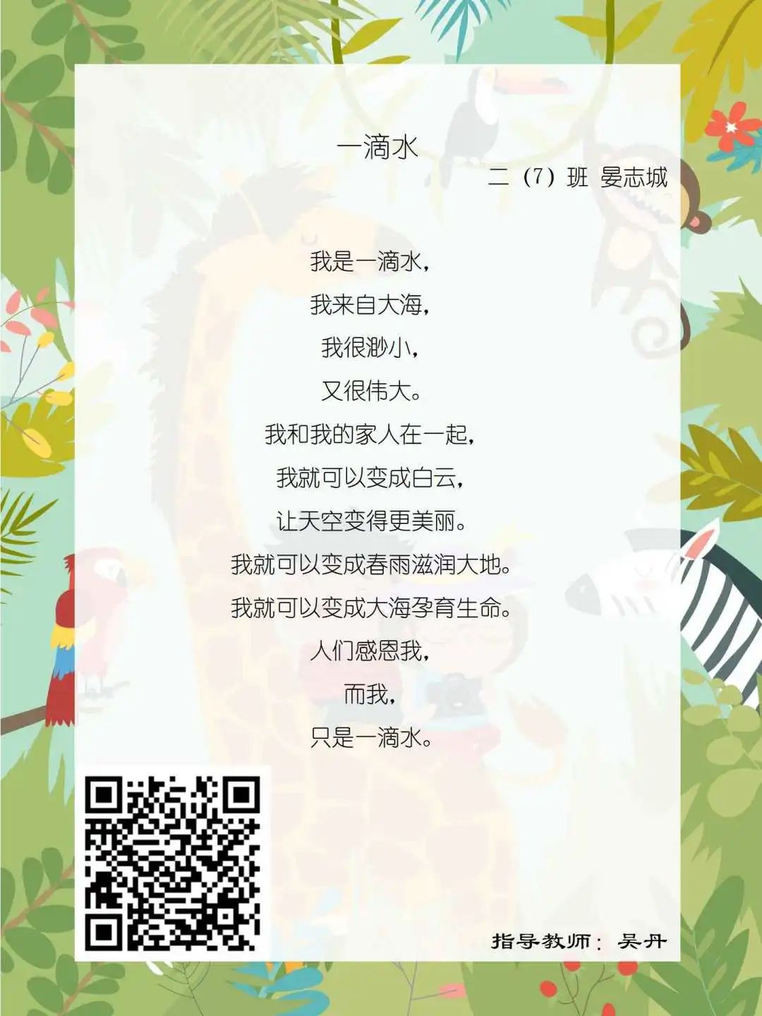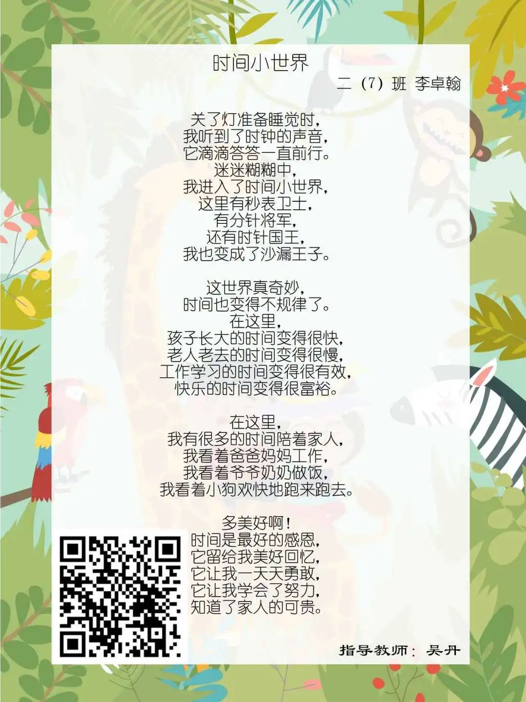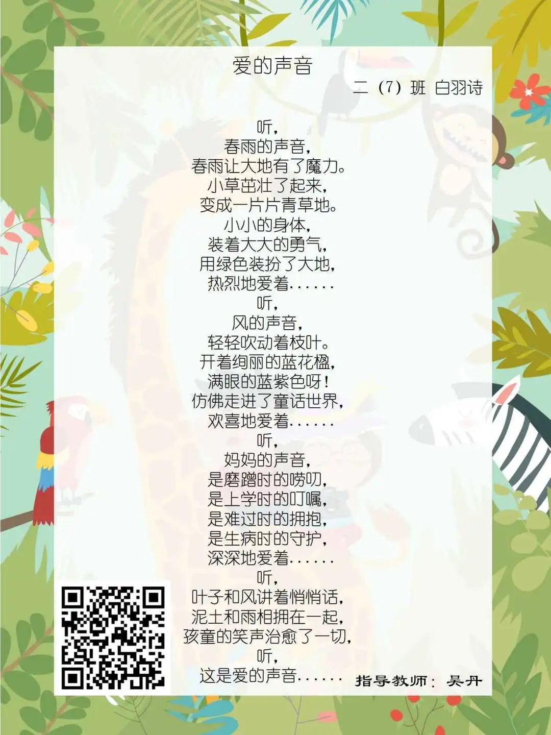 在学校领导的关心下,在下年级干部周晋羽老师和年级组长李秀念老师的带领下,在二年级老师和家长的共同努力下,孩子们用自己对感恩的理解,用文字承载深情厚意,把平时藏在心里感恩的话语,用真诚的小诗传达出来,展现他们内心最真挚的感恩之情!点开小诗左下方的二维码,还能听到小作者们情感充沛地朗诵!