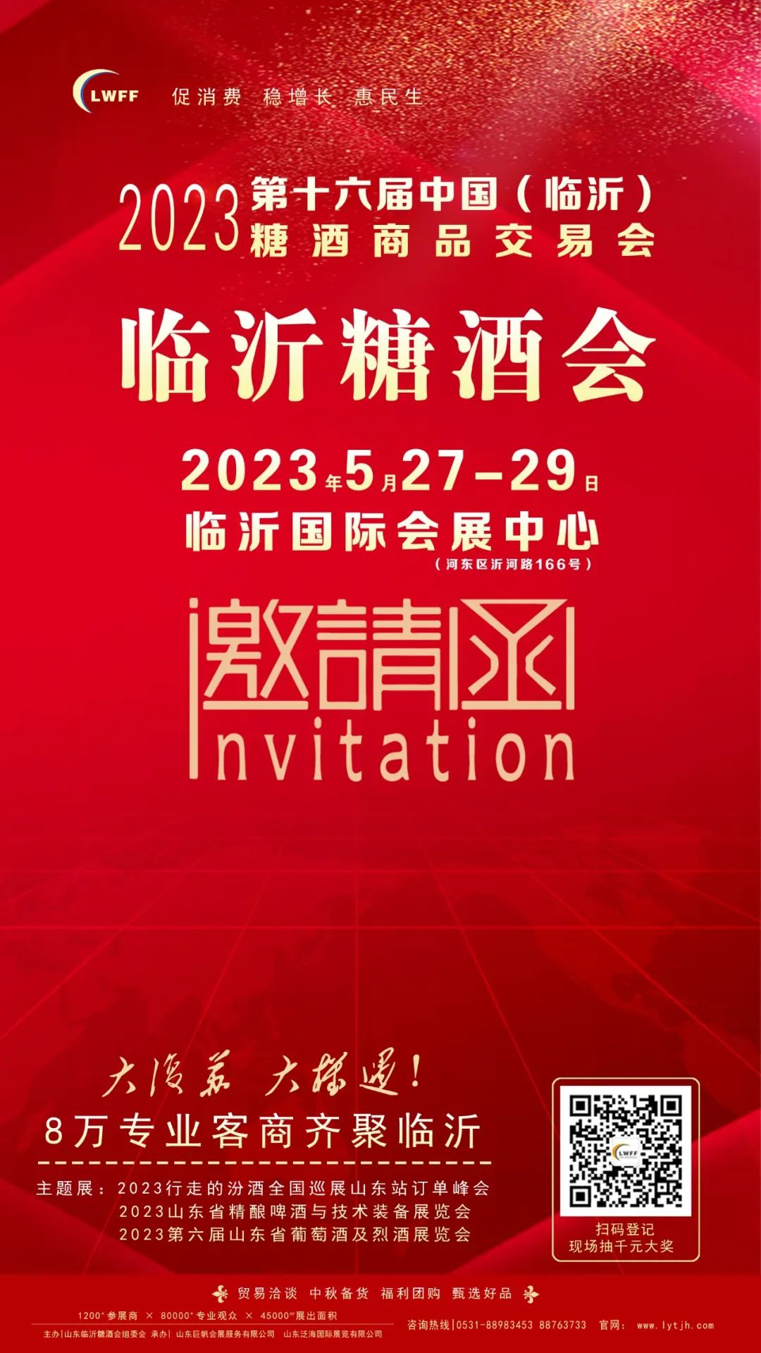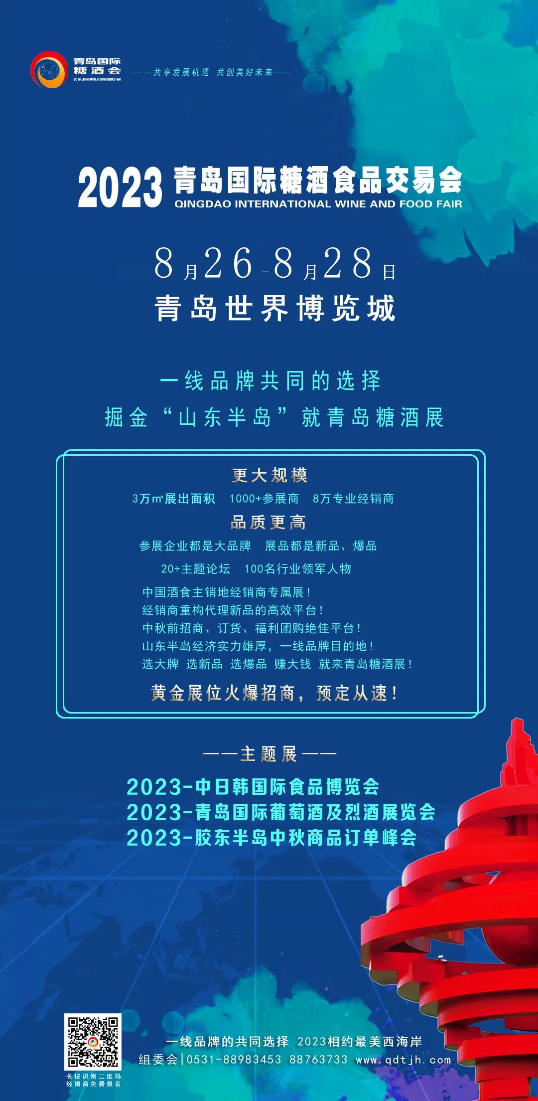 为搭建山东半岛酒类、食品一流产销对接平台,更好的安排、调配中秋、国庆商品旺季市场,保障节日供应,促进商品流通。由青岛国际糖酒会组委会主办,山东巨帆会展服务有限公司、山东泛海国际展览有限公司等组织承办的“2023-青岛国际糖酒食品交易会(以下简称:青岛国际糖酒会)”定于2023年8月26-28日在青岛世界博览城(西海岸新区)隆重举办。本届展会预计展出面积30000平方米,展区划分传统酒类展区、国际葡萄酒展区、休闲食品饮品展区、海洋食品展区等四大主题展区。本次展会预计邀约观众人次8万人次,将有来自山东、江苏、安徽、河南、河北、山西、北京、天津及东三省等华东、华北、西北、中部的超过20000家经销商、代理商、批发商、实力团购买家及媒体前来参观选购。组委会:0531-88983453 88763733
