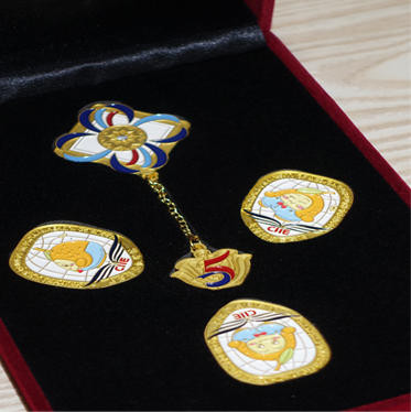 更值得一提的是,三枚子徽章尾部指向主徽章的流苏吊坠,白玉兰花苞托起“5”的数字形象,彰显“第五届”这一富含纪念意义的时间节点。纪念章生动形象地展现了“小橘子”的活力,希望大家能够和它们一样时刻精神饱满地服务进博!