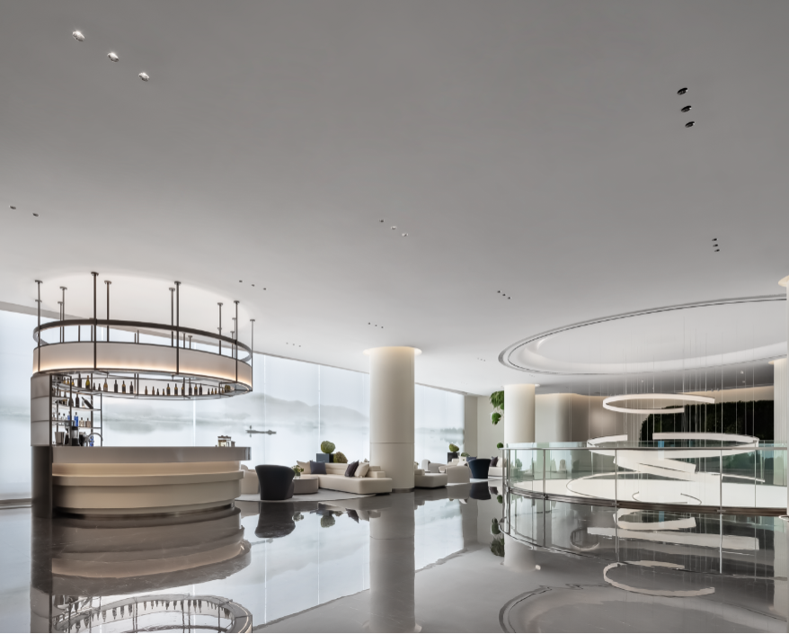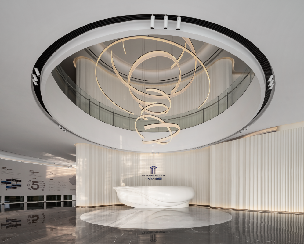 外部以玻璃幕墙贯穿体量,内部以白色亮漆装饰,使品牌馆在日间“收纳”浮光、在夜间蒙络灯火,雕琢收纳景光的超然至境。