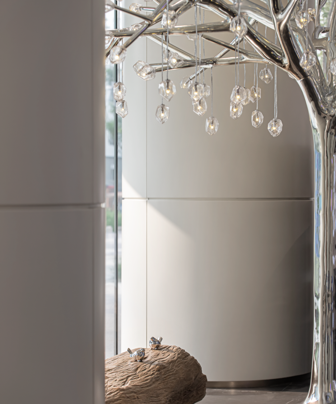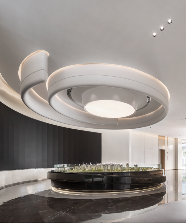 设计团队以“川”为脉,以自然形态为基因,通过石、木、艺术及灯光的处理,在看似肃穆静谧的空间中,调和出宁静致雅的内心感受,达成功能性和美学关系的统一。
