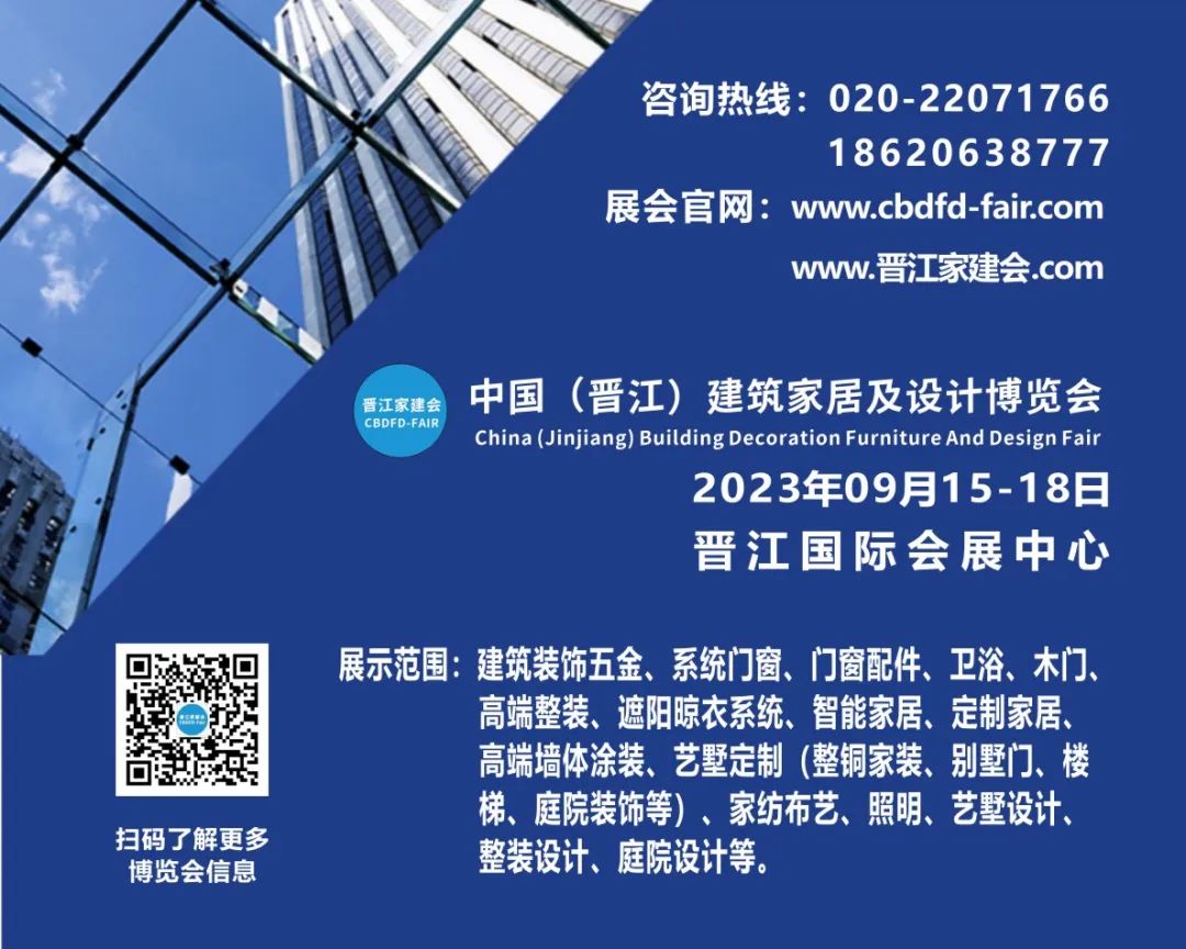 由晋江市明晋会展有限责任公司西园分公司、广州润泉会展有限公司共同主办,广州润泉会展有限公司承办的“2023中国(晋江)建筑家居及设计展览会”(简称:晋江家建会)将于2023年9月15日至18日在福建泉州·晋江国际会展中心举办。